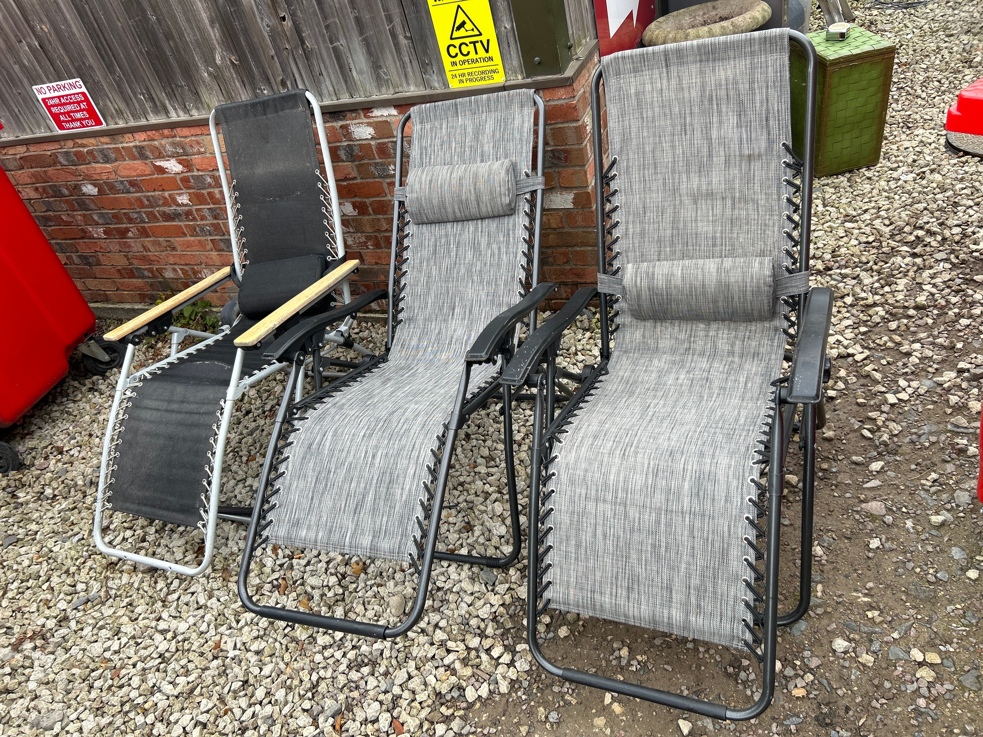 A group of three contemporary outdoor zero-gravity reclining lounge chairs. Each chair features a tubular metal frame and synthetic textile sling attached via bungee cords. The single black chair has a light-colored metal frame, black fabric, and light-toned wooden armrests. The two identical grey chairs feature darker-colored metal frames, light grey striped fabric, matching adjustable headrest pillows, and black plastic armrests. No manufacturer’s marks or identifying text are visible.