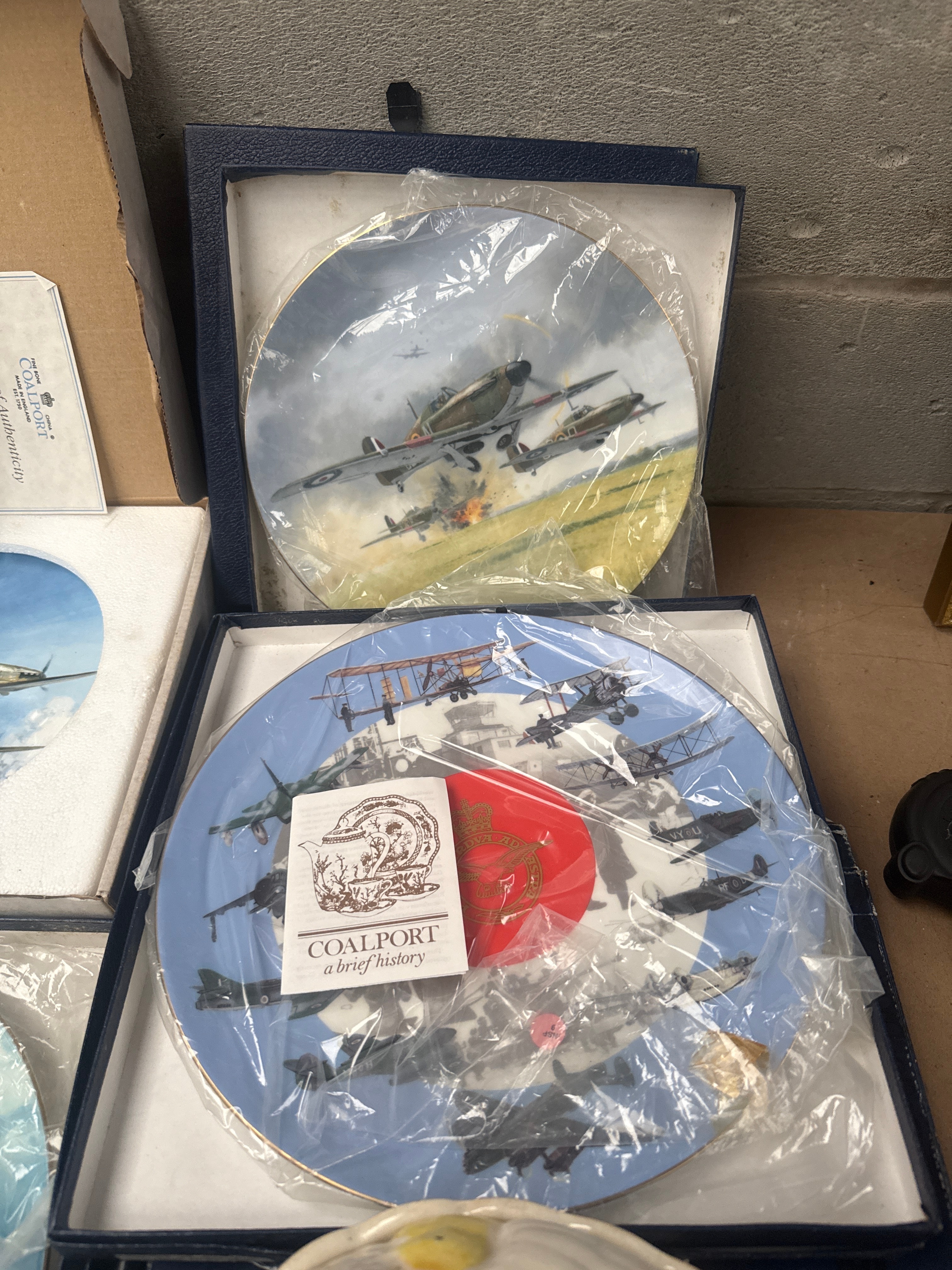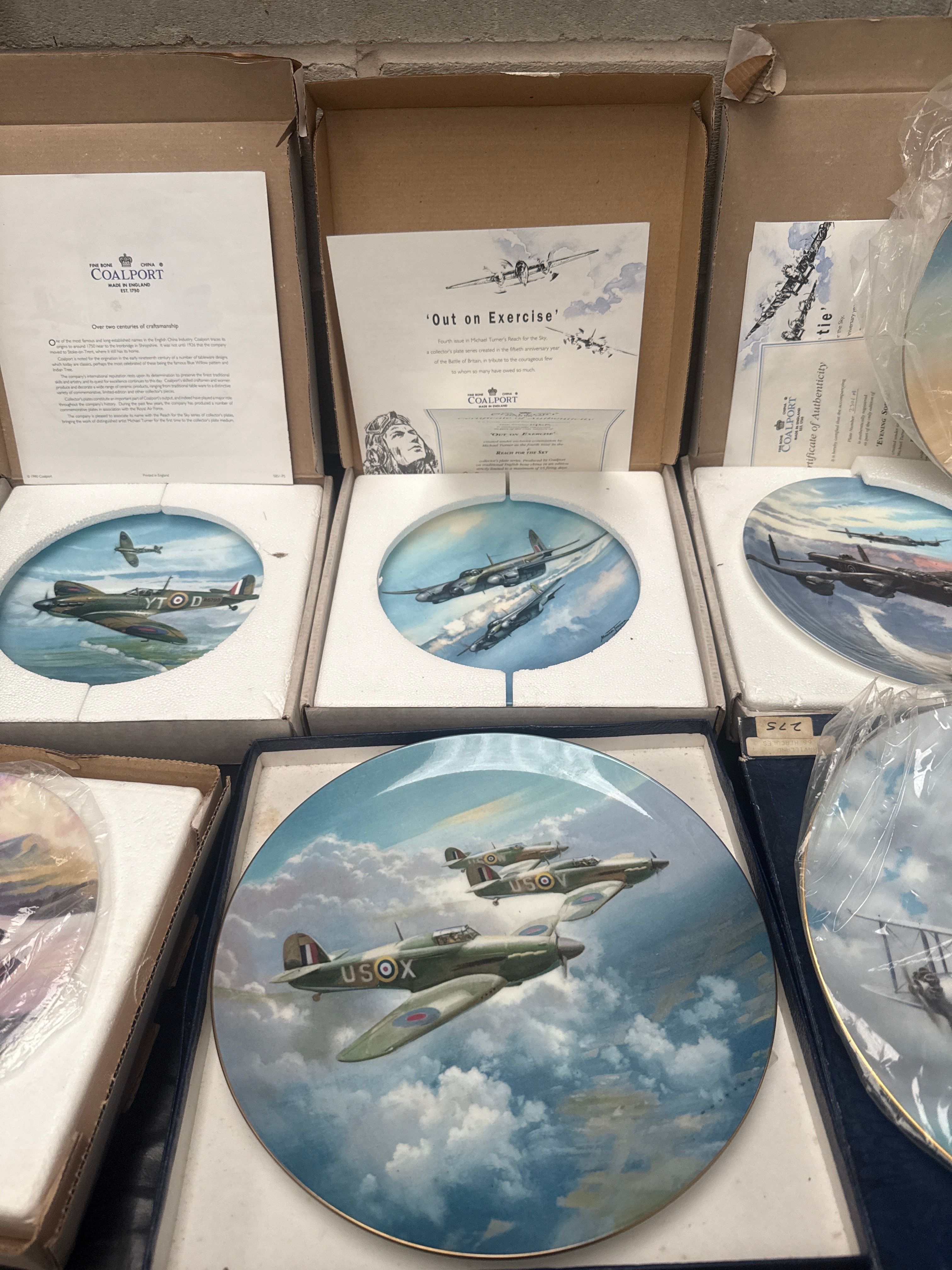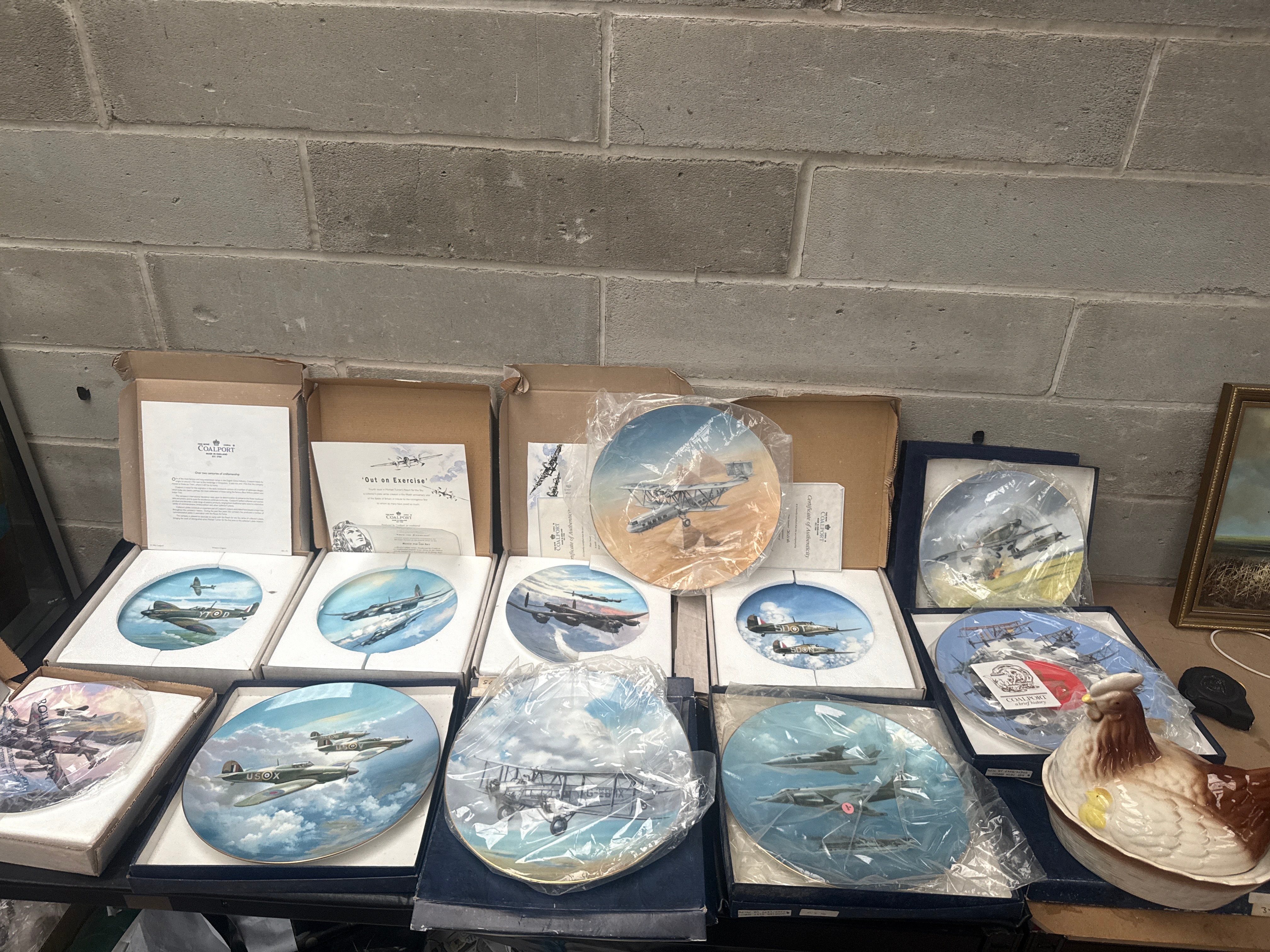 A collection of ten Coalport Fine Bone China Limited Edition RAF War Plane Collector Plates, designed by Michael Turner, many from ‘The Reach for the Sky Collection’. Each plate is presented in its original box with styrofoam inserts and protective plastic sleeves. The plates depict various historical military aircraft, including propeller-driven planes, bombers, biplanes, and some early jet-era aircraft, rendered in illustrative, realistic settings. Accompanying leaflets, including one titled ‘Out on Exercise’ and referencing ‘Battle of Britain’s 50th anniversary,’ suggest a production period around 1990 for at least part of the collection. One plate is noted with a ‘ROYAL WORCESTER’ printed protective plastic sleeve. Also included is a single glazed ceramic hen-on-nest lidded dish, featuring brown, white, and yellow coloration with a chick detail.