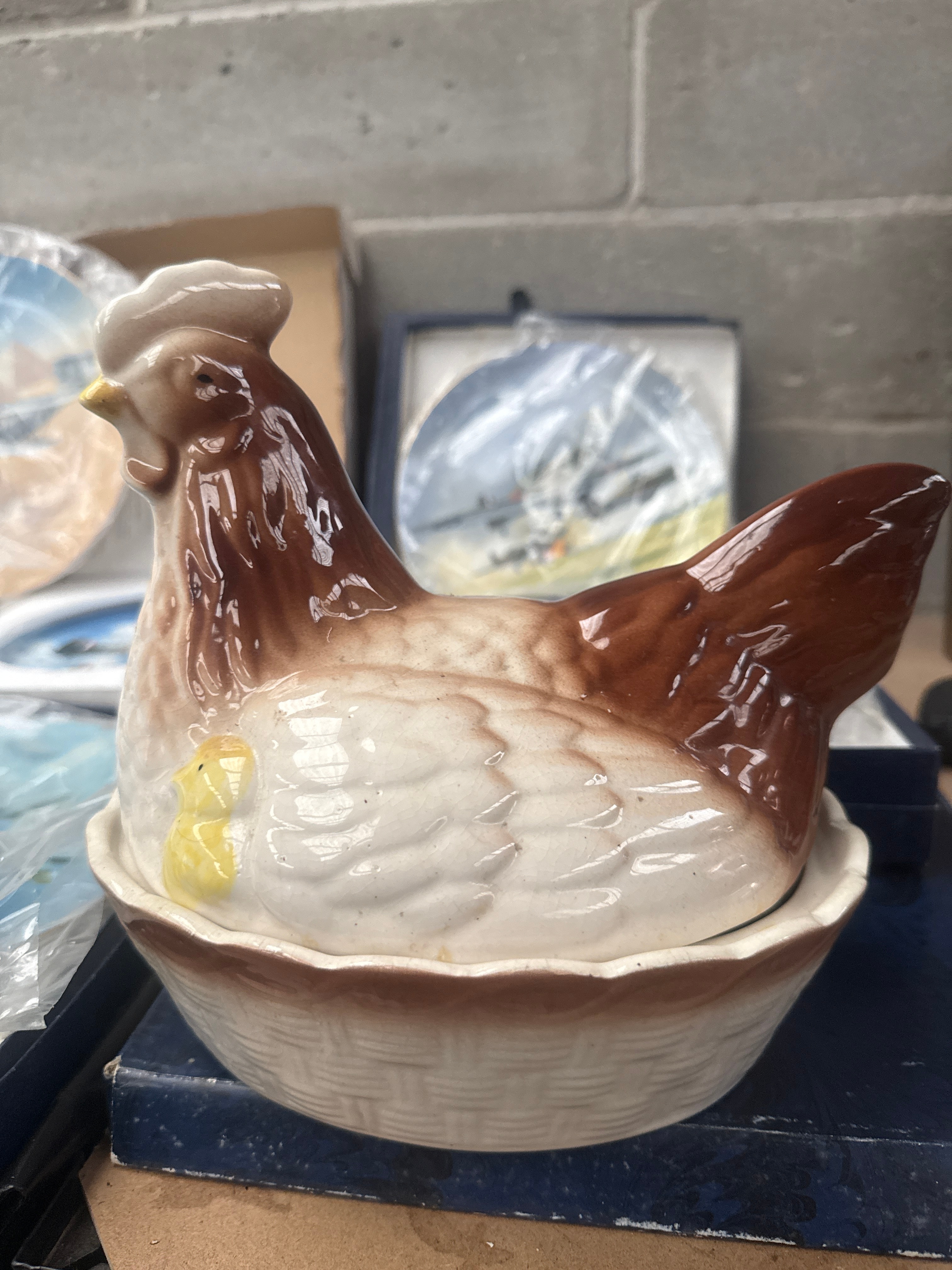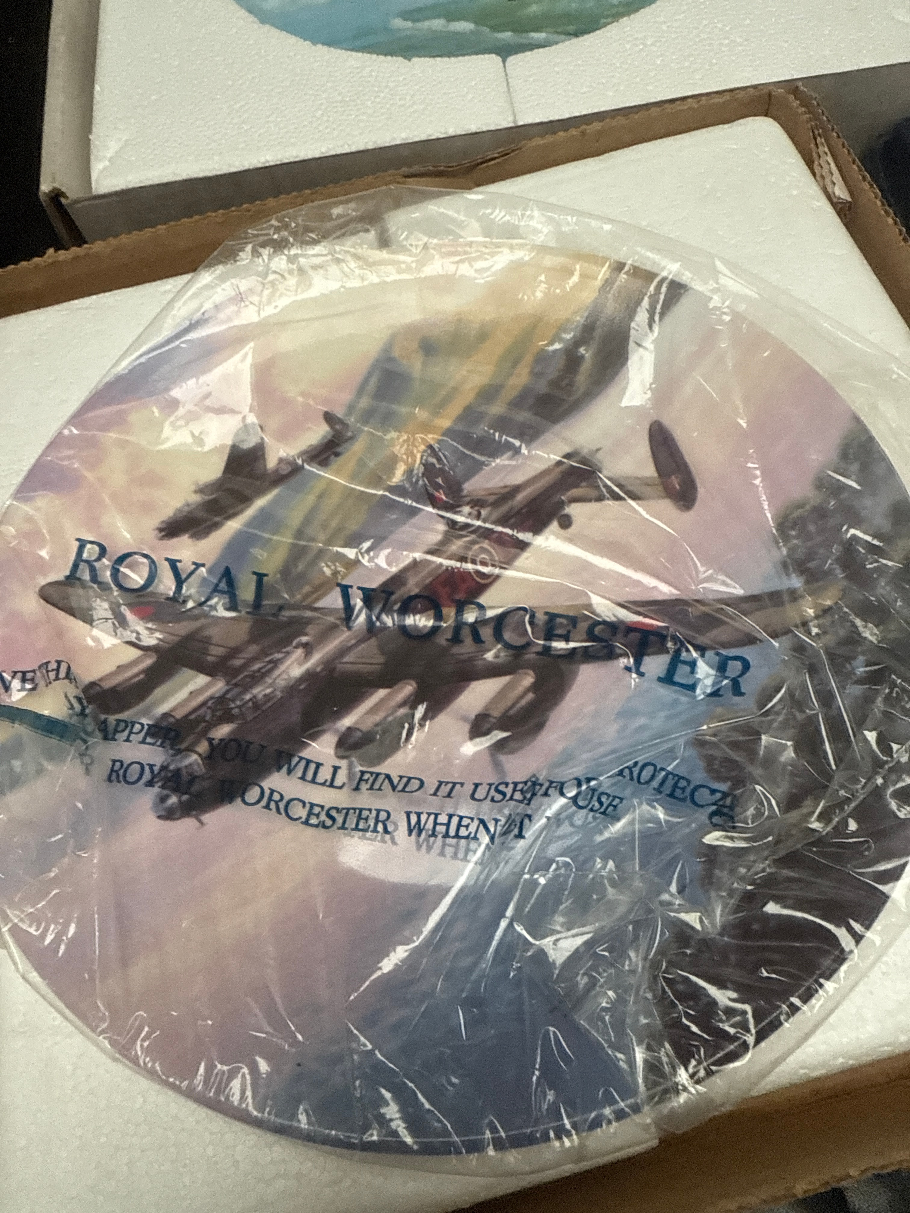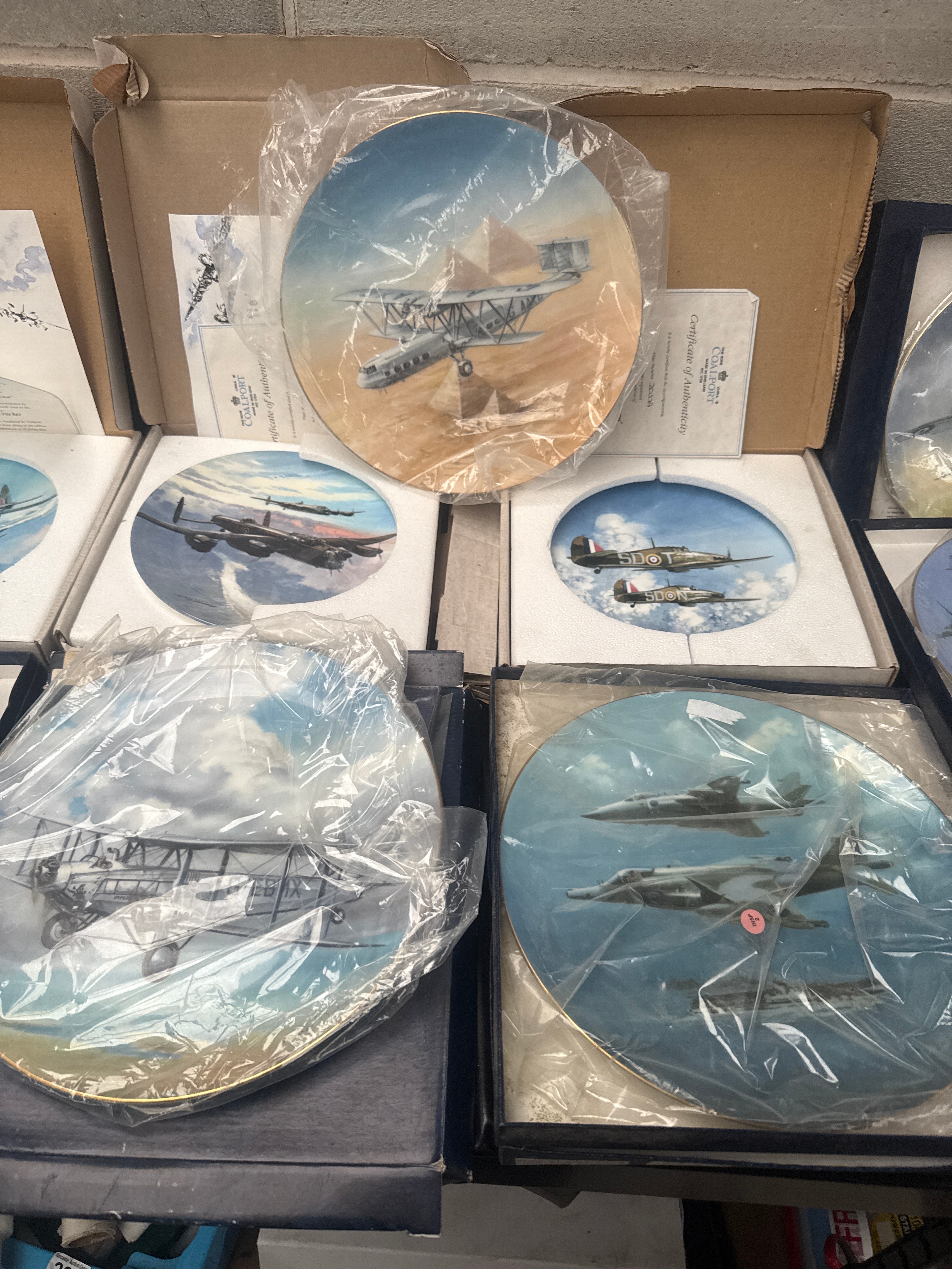 A collection of ten Coalport Fine Bone China Limited Edition RAF War Plane Collector Plates, designed by Michael Turner, many from ‘The Reach for the Sky Collection’. Each plate is presented in its original box with styrofoam inserts and protective plastic sleeves. The plates depict various historical military aircraft, including propeller-driven planes, bombers, biplanes, and some early jet-era aircraft, rendered in illustrative, realistic settings. Accompanying leaflets, including one titled ‘Out on Exercise’ and referencing ‘Battle of Britain’s 50th anniversary,’ suggest a production period around 1990 for at least part of the collection. One plate is noted with a ‘ROYAL WORCESTER’ printed protective plastic sleeve. Also included is a single glazed ceramic hen-on-nest lidded dish, featuring brown, white, and yellow coloration with a chick detail.