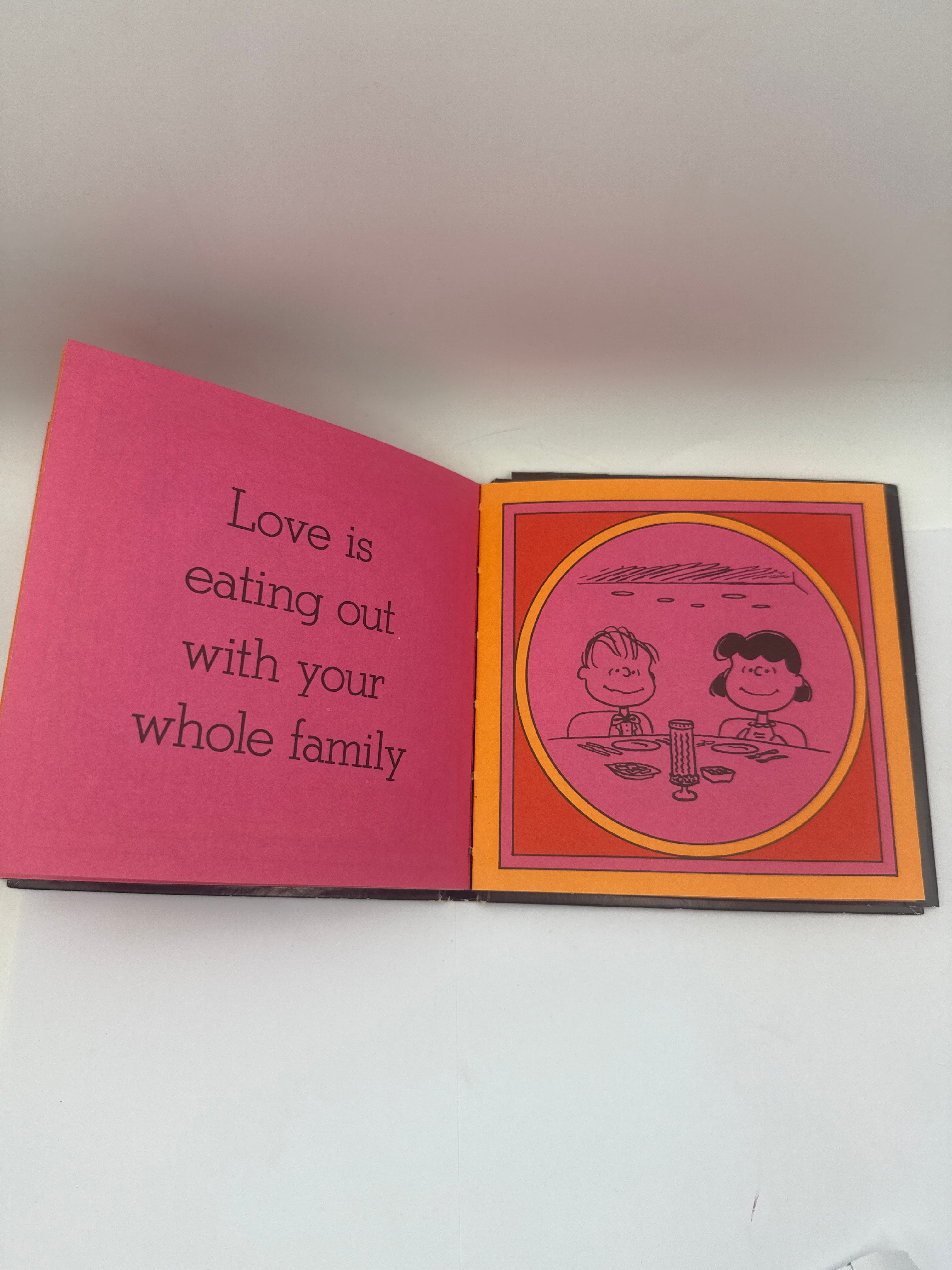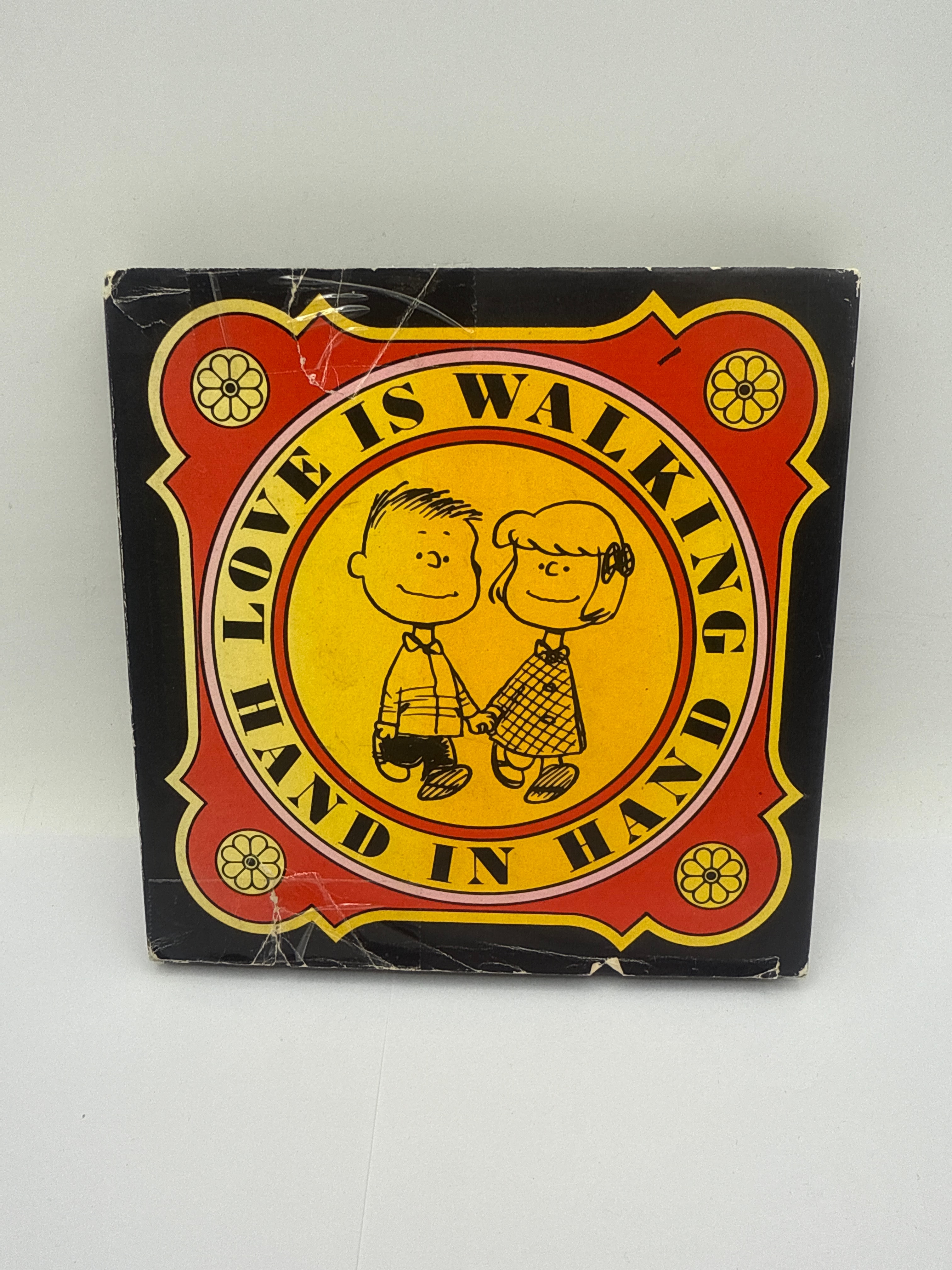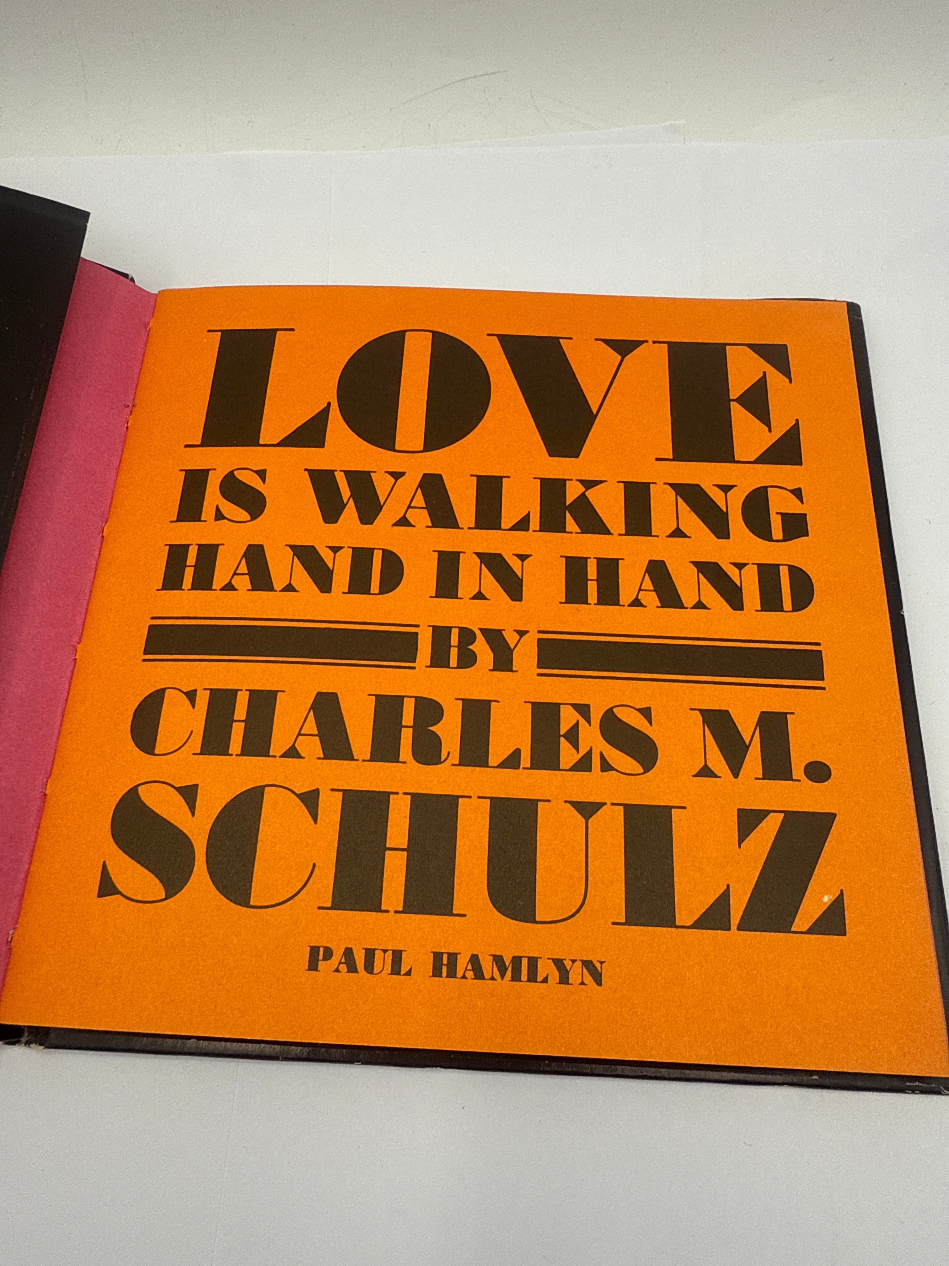 A hardcover book titled “Love Is Walking Hand in Hand” by Charles M. Schulz, a recognized Peanuts franchise item, likely from the 1965 edition. Published by Paul Hamlyn, the cover features a circular design in black, red, and yellow, depicting two cartoon children in the distinct Peanuts style, with the title text encircling them. The internal pages are printed on various colored paper, including orange and pink, with black text and line-art illustrations, also in the recognizable Peanuts style, expressing definitions of love. The object is constructed from printed paper and cardboard.