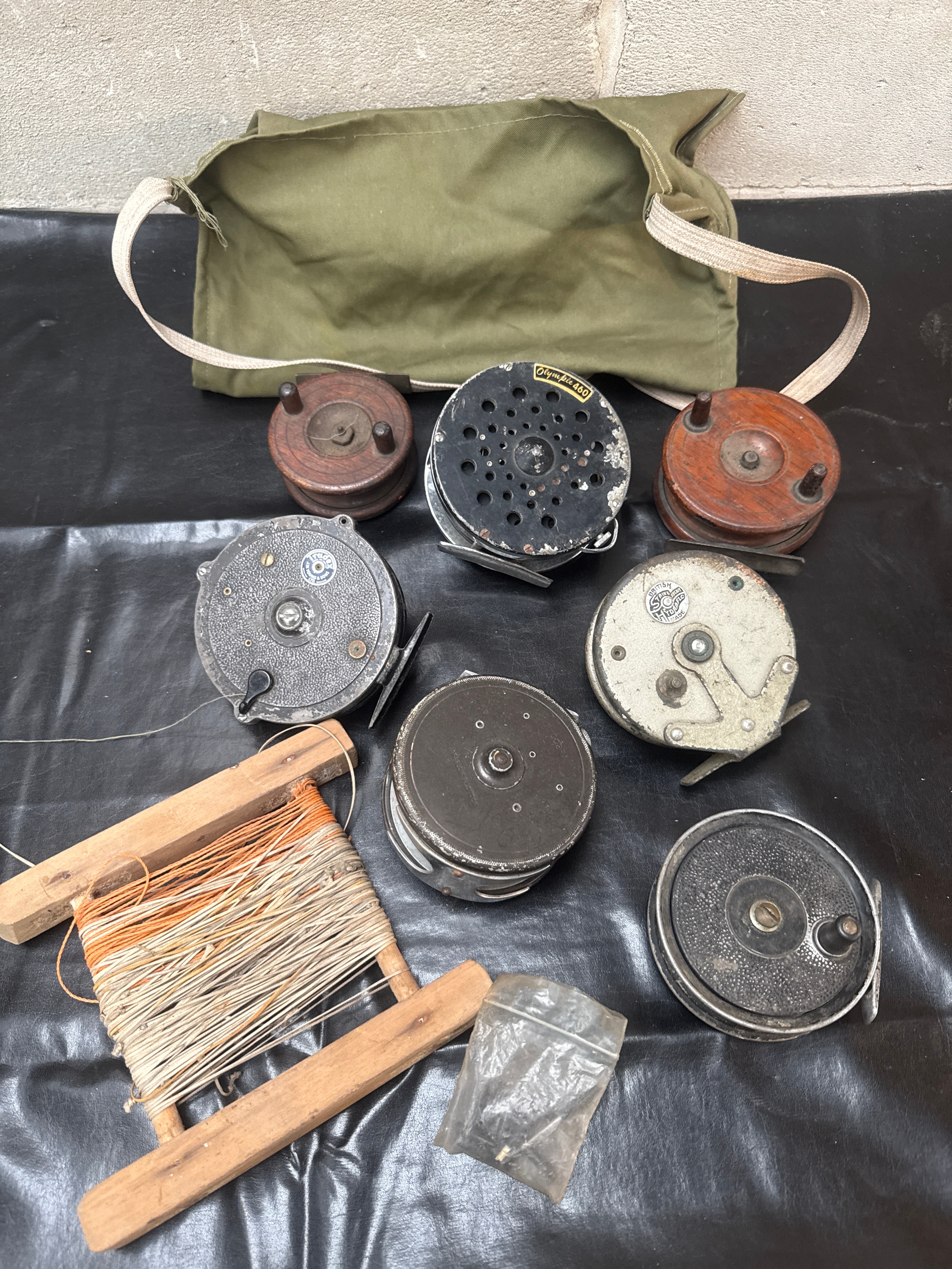 A lot comprising seven vintage fly fishing reels and associated accessories. The reels include three older models constructed of wood, and four metal reels varying in design and finish. One black metal reel is marked with a yellow label displaying “Olympic 460.” Another grey metal reel features a circular emblem with the text “BRITISH MADE,” further marked “S. Allcock & Co. Redditch” and “Farlow.” Accompanying the reels are an olive green canvas shoulder bag, a wooden line winder with spooled line, and a small clear plastic bag containing a minor metal component.