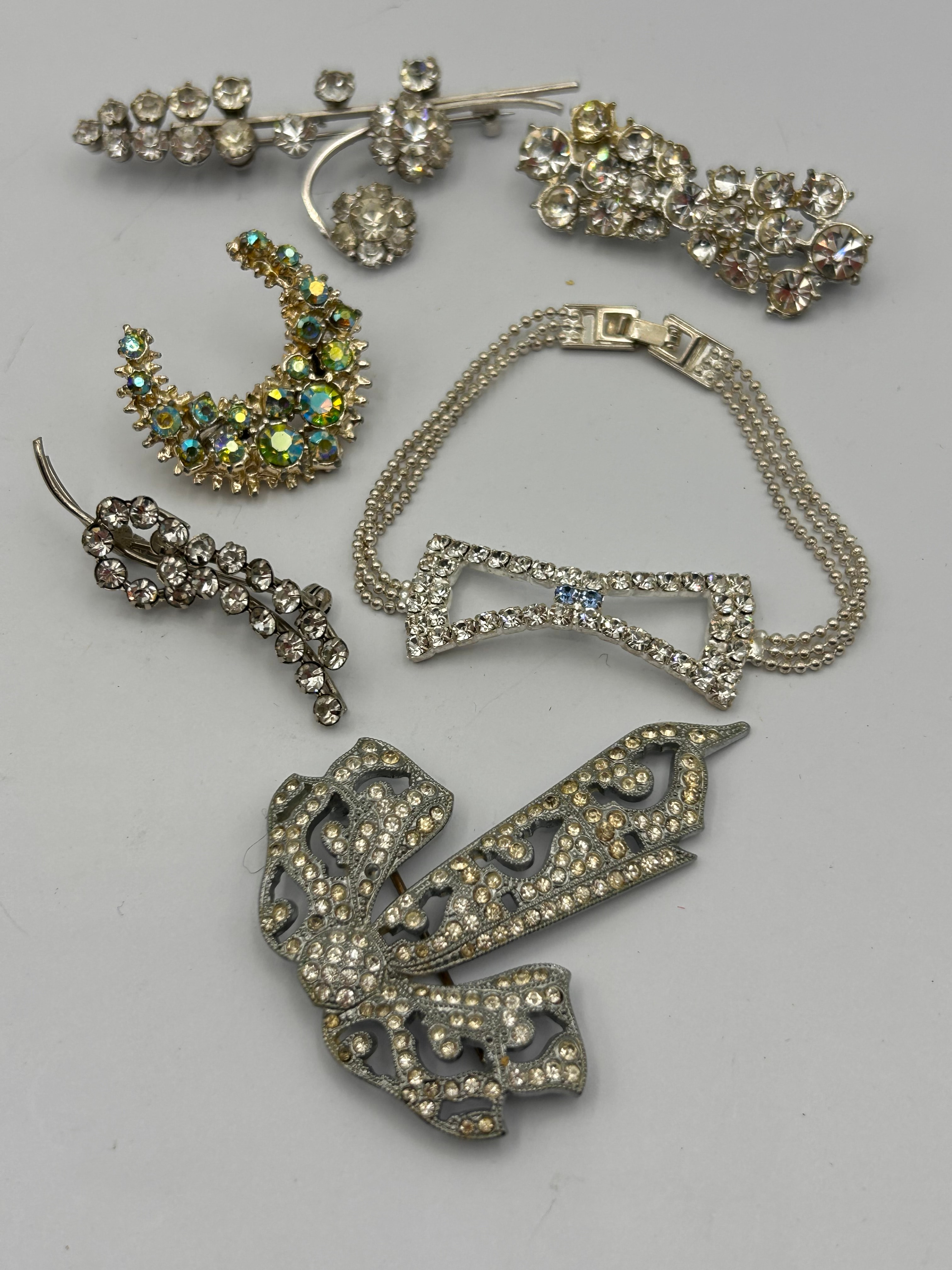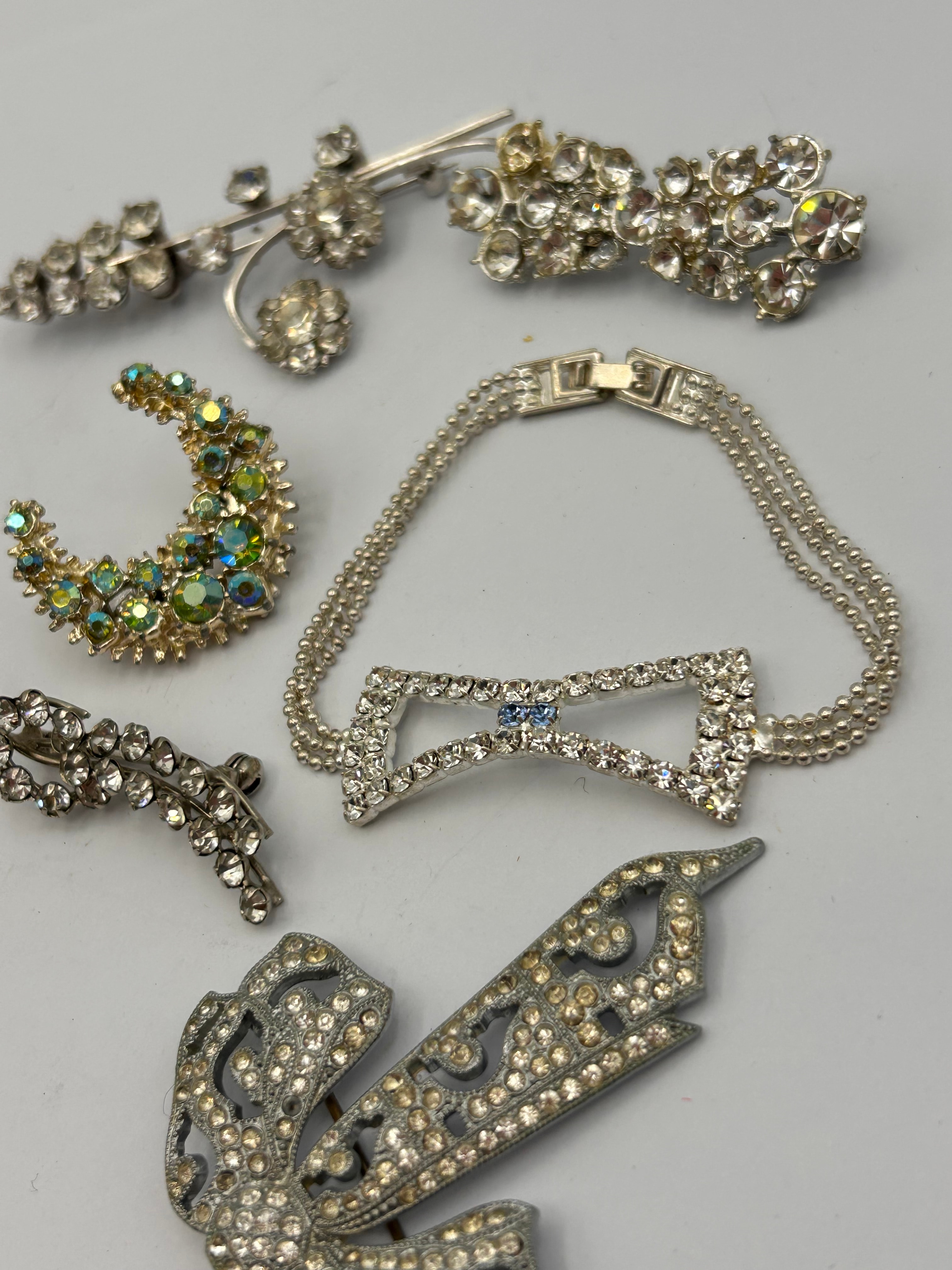 This lot comprises seven pieces of vintage costume jewelry, including five brooches, one bracelet, and one hair clip. The pieces are predominantly crafted from silver-toned base metal, with one piece in gold-toned metal. Designs vary, featuring floral, foliate, geometric, abstract, and bow motifs, suggesting a mid-20th century or Art Deco revival aesthetic. All items are embellished with an assortment of clear, round-cut rhinestones. Notable pieces include a crescent-shaped brooch adorned with green and iridescent stones, and a bracelet featuring a central light blue rectangular stone within a rhinestone-set bow design. One piece is a rhinestone-embellished hair bow barrette clip, consistent with similar items found in online searches. No discernible maker’s marks or text are visible on any of the items.