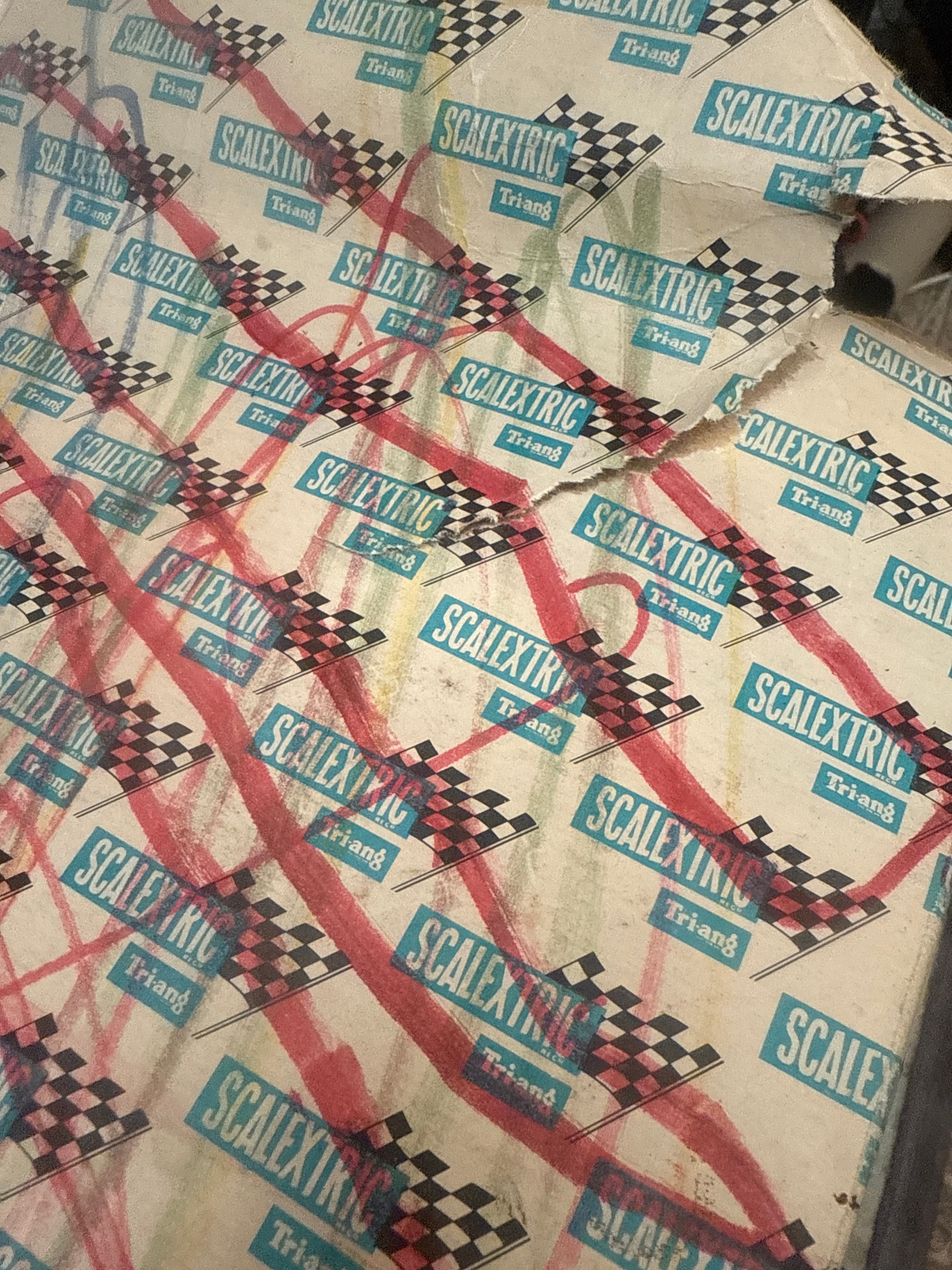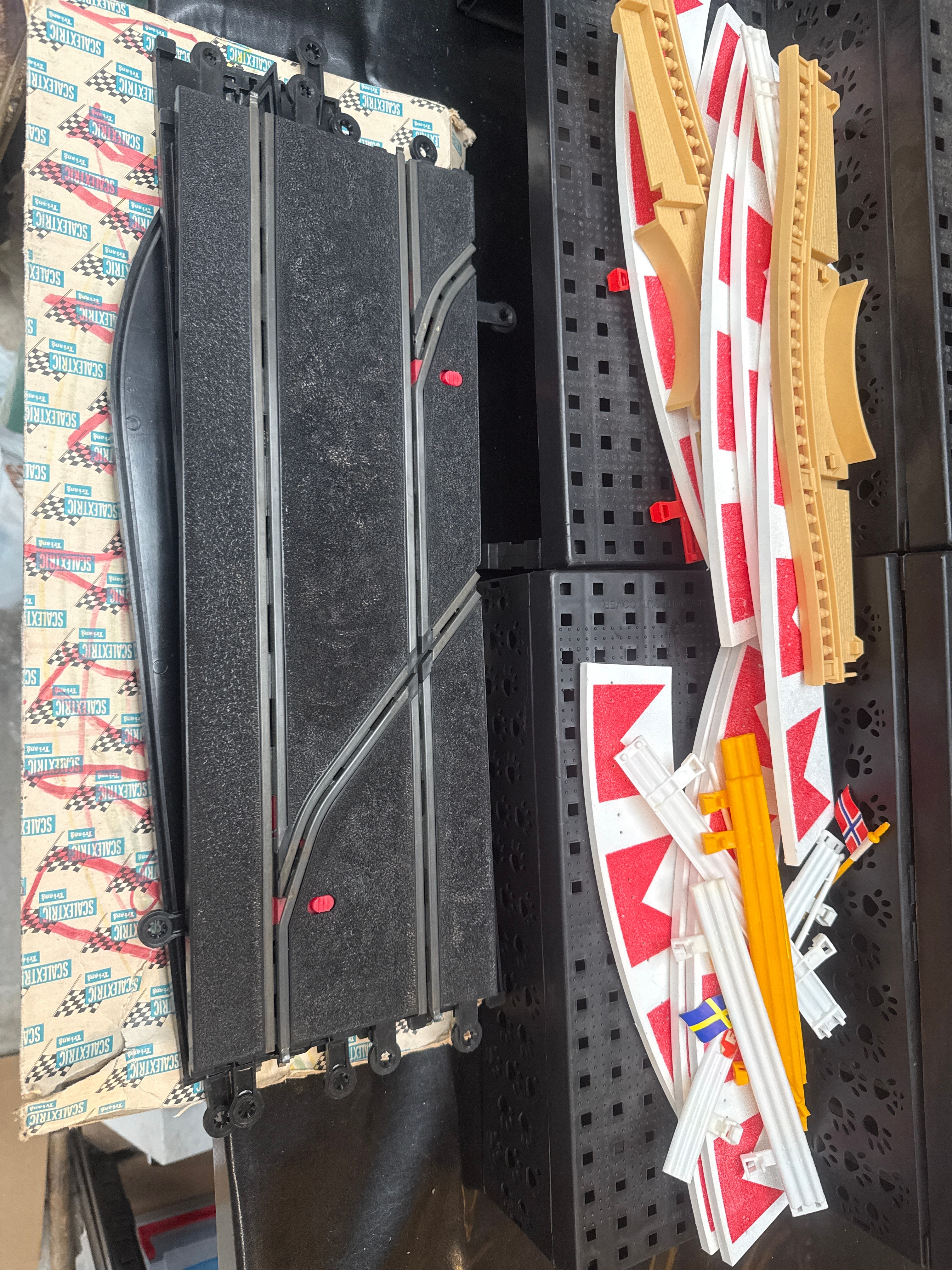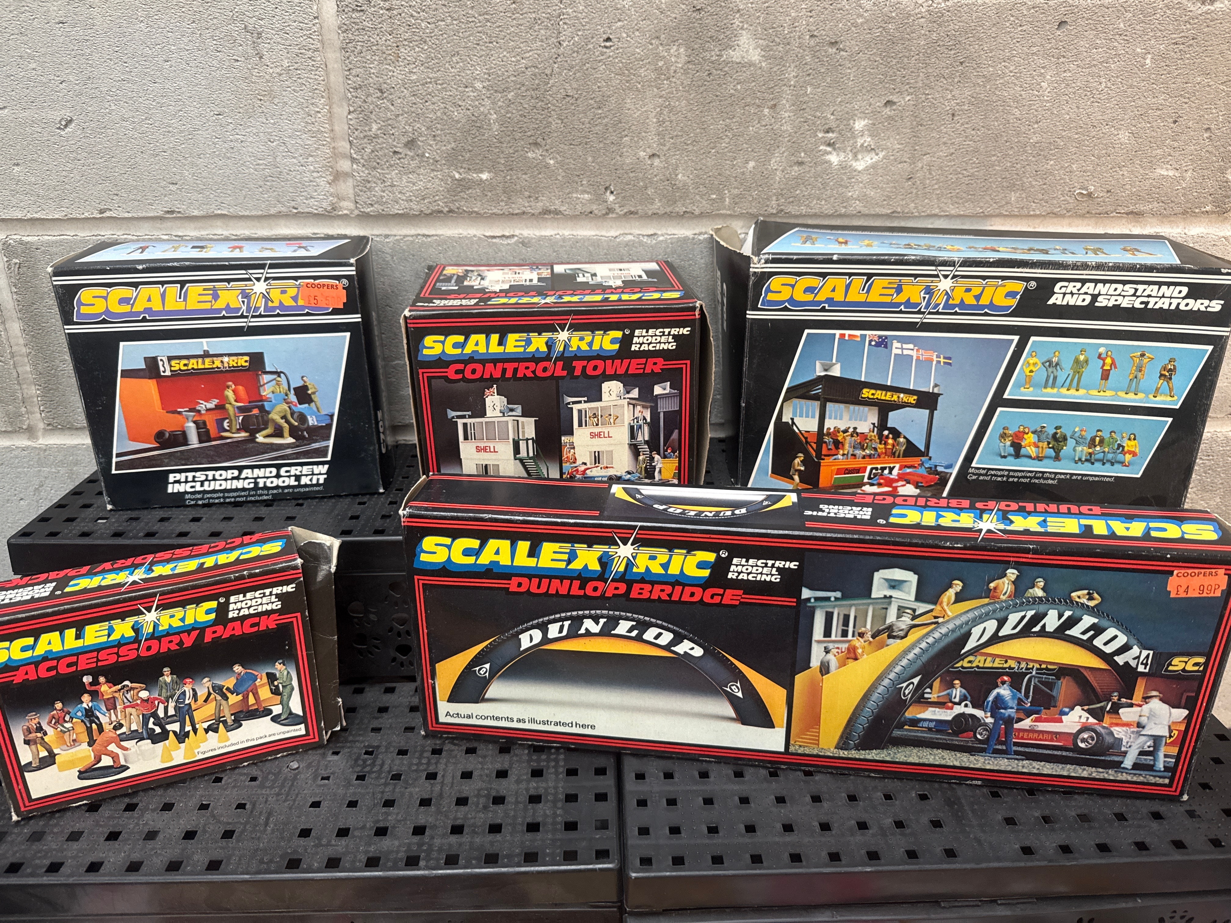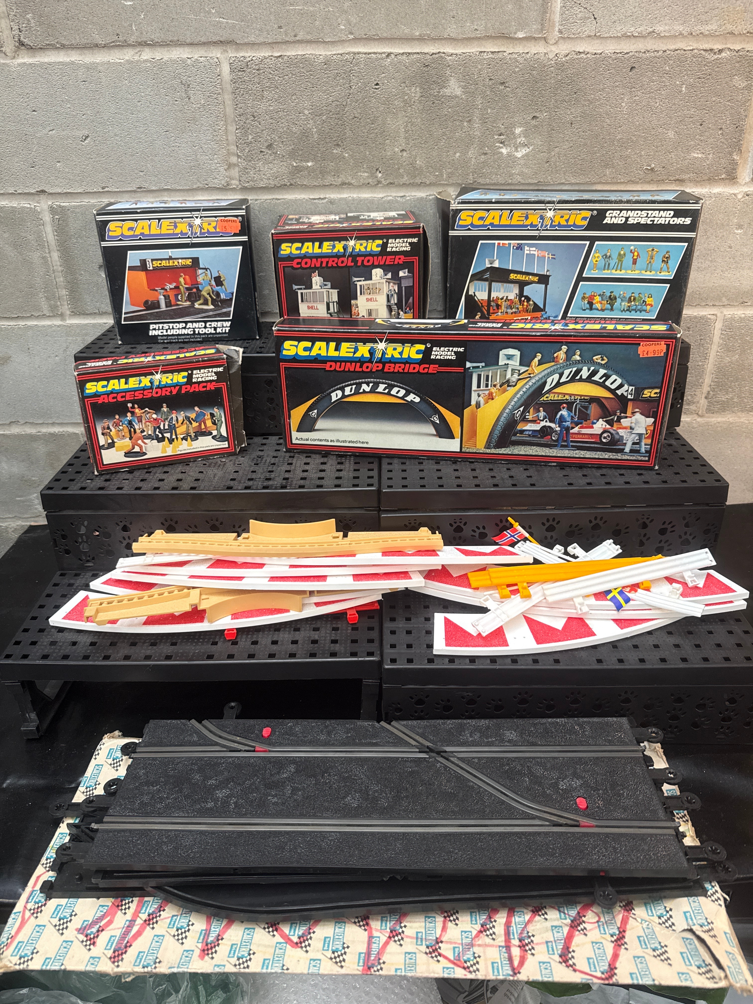 A Collection of Scalextric Electric Model Motor Racing Accessory Sets and Track Components, comprising five boxed accessory sets titled ‘PIT-STOP AND CREW INCLUDING TOOL KIT,’ ‘CONTROL TOWER,’ ‘GRANDSTAND AND SPECTATORS,’ ‘DUNLOP BRIDGE,’ and ‘ACCESSORY PACK.’ The cardboard boxes are prominently branded ‘SCALEXTRIC’ and ‘Tri-ang,’ with additional branding including ‘DUNLOP’ on the bridge box and ‘SHELL’ on the control tower box. One box bears an old ‘COOPERS’ price sticker indicating £4.95. Also included are a collection of loose black plastic slotted track sections, red and white plastic barriers, yellow plastic bridge supports, and various smaller plastic accessory figures and details.