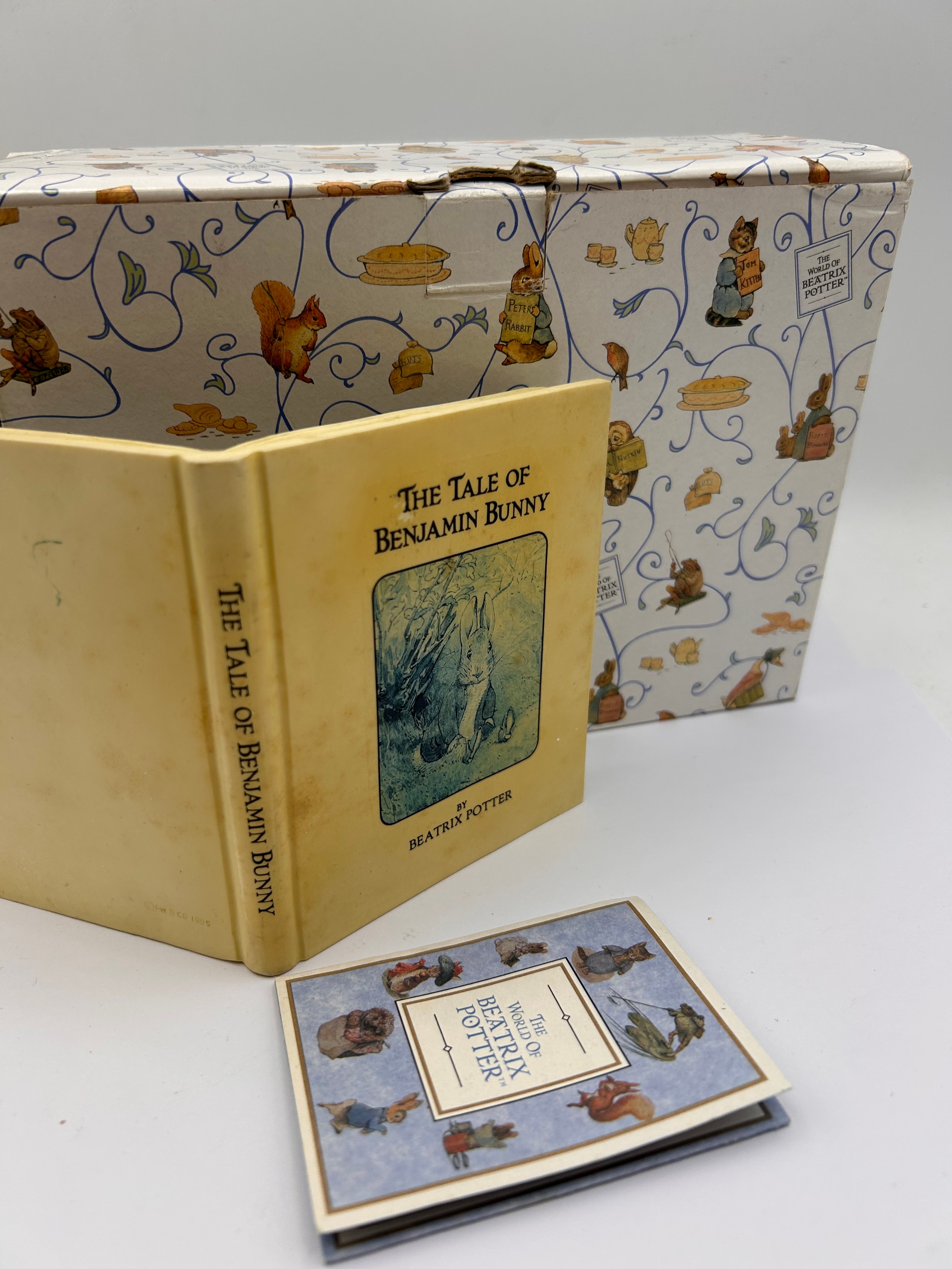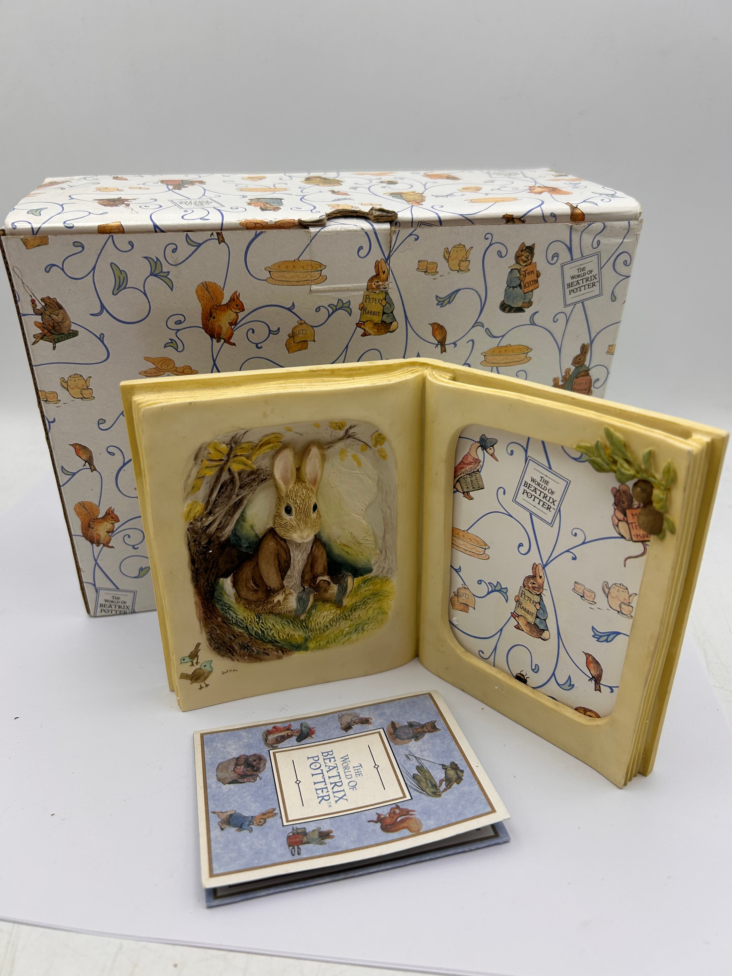 A ‘THE WORLD OF BEATRIX POTTER™’ 3D Book Style Photo Frame, depicting ‘The Tale of Benjamin Bunny’. This collectible decorative object is crafted from resin or a similar composite material, shaped like an open book. Its design is executed in the illustrative style of Beatrix Potter, featuring various anthropomorphic animal characters. When closed, the object’s spine and cover are marked “THE TALE OF BENJAMIN BUNNY BY BEATRIX POTTER”. When open, the left “page” features a sculpted relief of a rabbit with a smaller rabbit in a natural setting, with a small signature “F.K.” or “F.R.” visible at the lower left. The right “page” contains a recessed, decoratively framed area designed to hold a small card or photograph, currently holding a card inscribed “THE WORLD OF BEATRIX POTTER™”. The item comes with its original cardboard presentation box and a small folded informational card, both extensively decorated with numerous Beatrix Potter characters such as Peter Rabbit, Jemima Puddleduck, and Mr. Jeremy Fisher, and consistently marked with “THE WORLD OF BEATRIX POTTER™”.