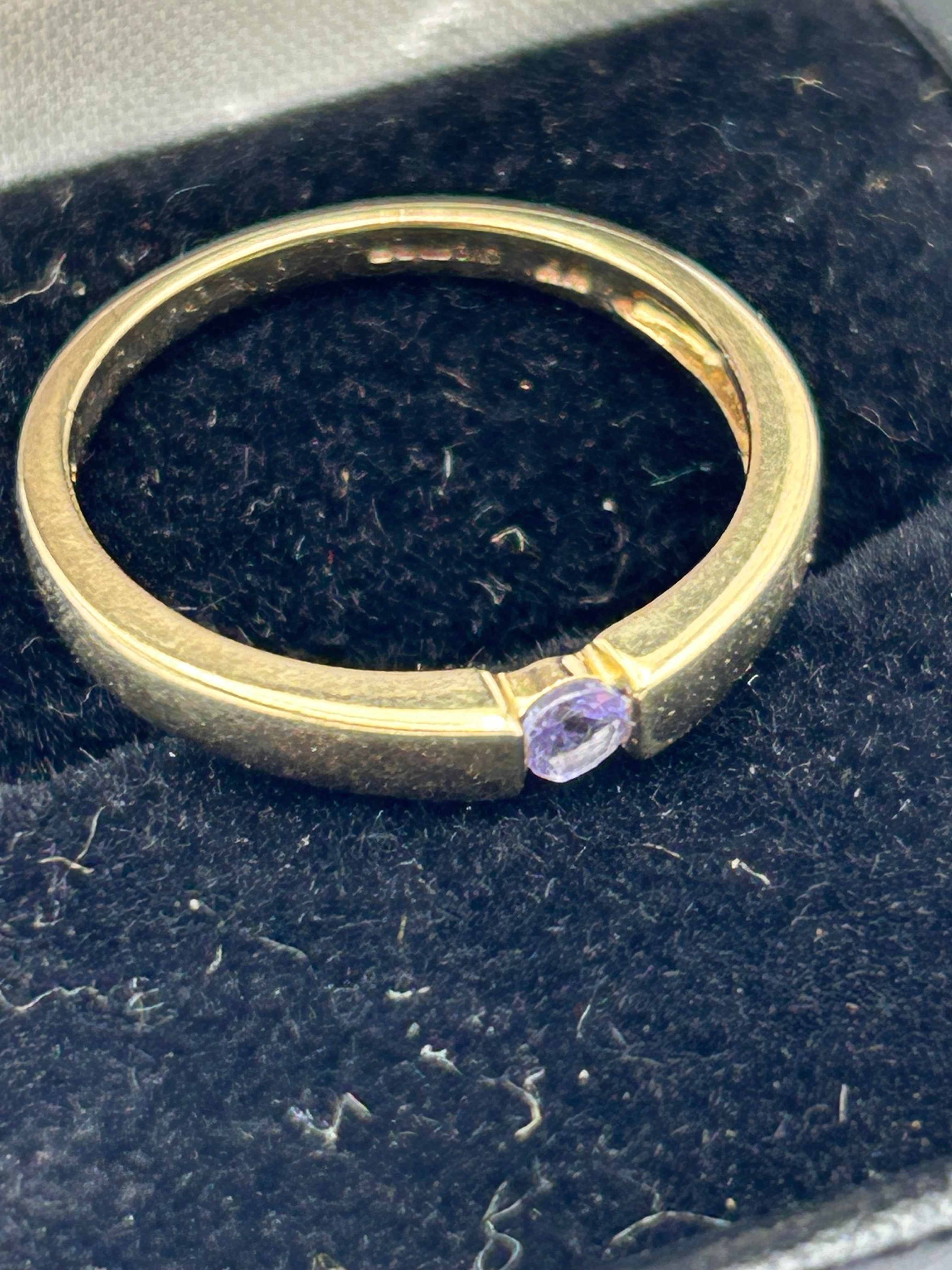 A 9ct Gold Diamond Ring. The ring features a minimalist band design with a single horizontally-set oval diamond. Visible hallmarks inside the band clearly show ‘375’, indicating 9-carat gold, alongside other indistinct markings.