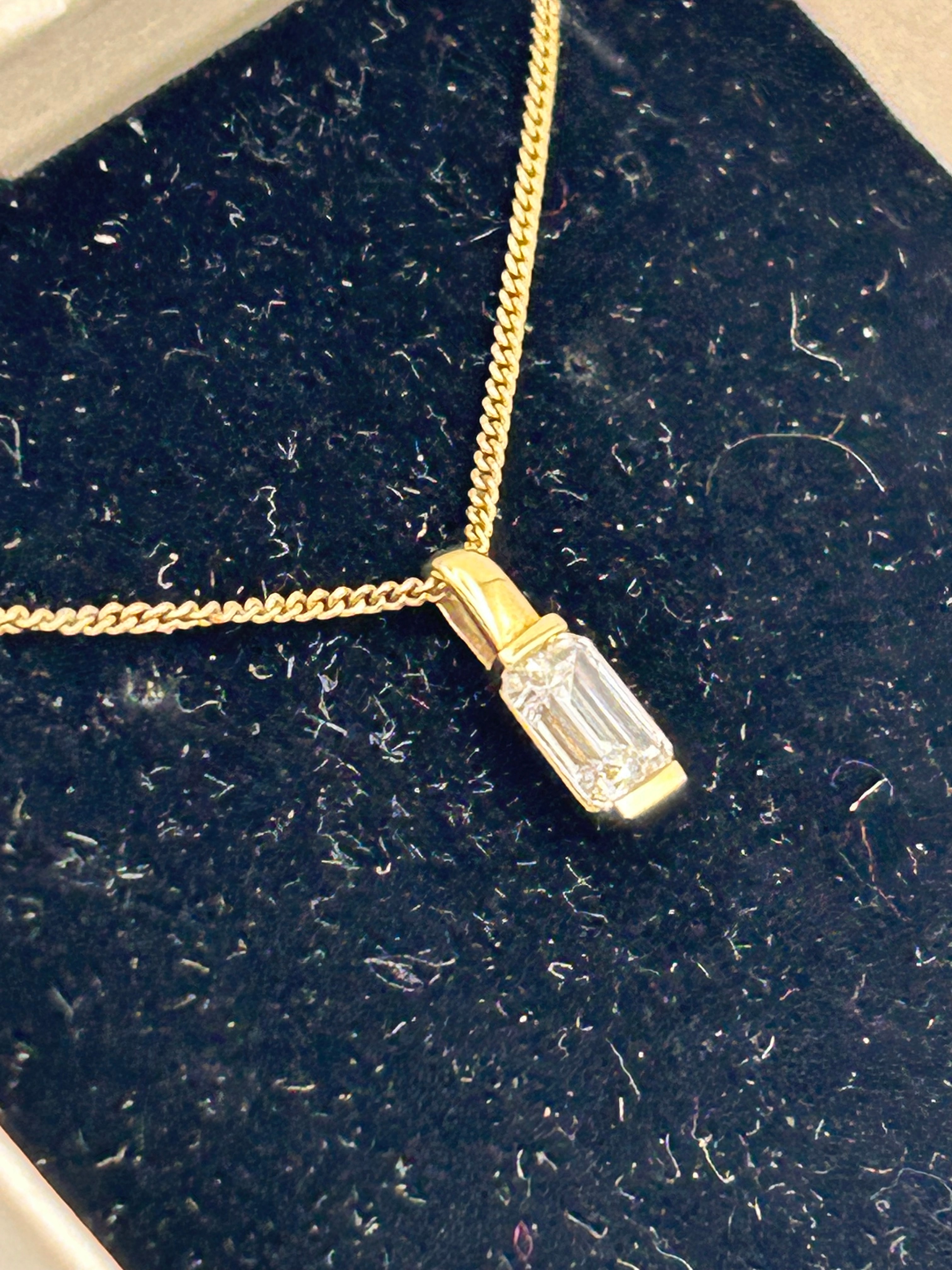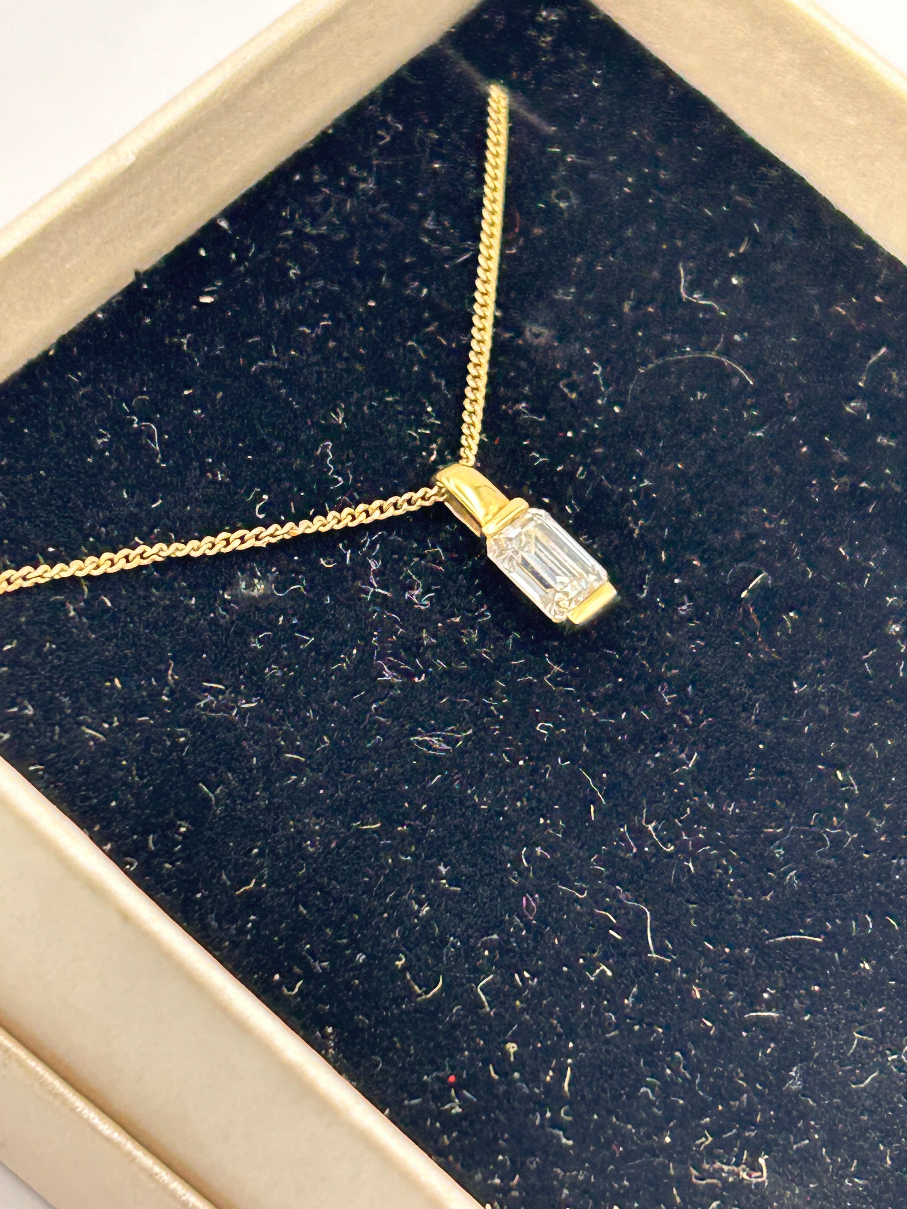 A 9ct Gold Baguette Clear Gemstone Necklace. The item’s materials are confirmed to be Gold. It comprises a fine curb link chain and a pendant. The pendant features a single, clear, baguette-cut faceted gemstone, vertically set within a minimalist gold bale.