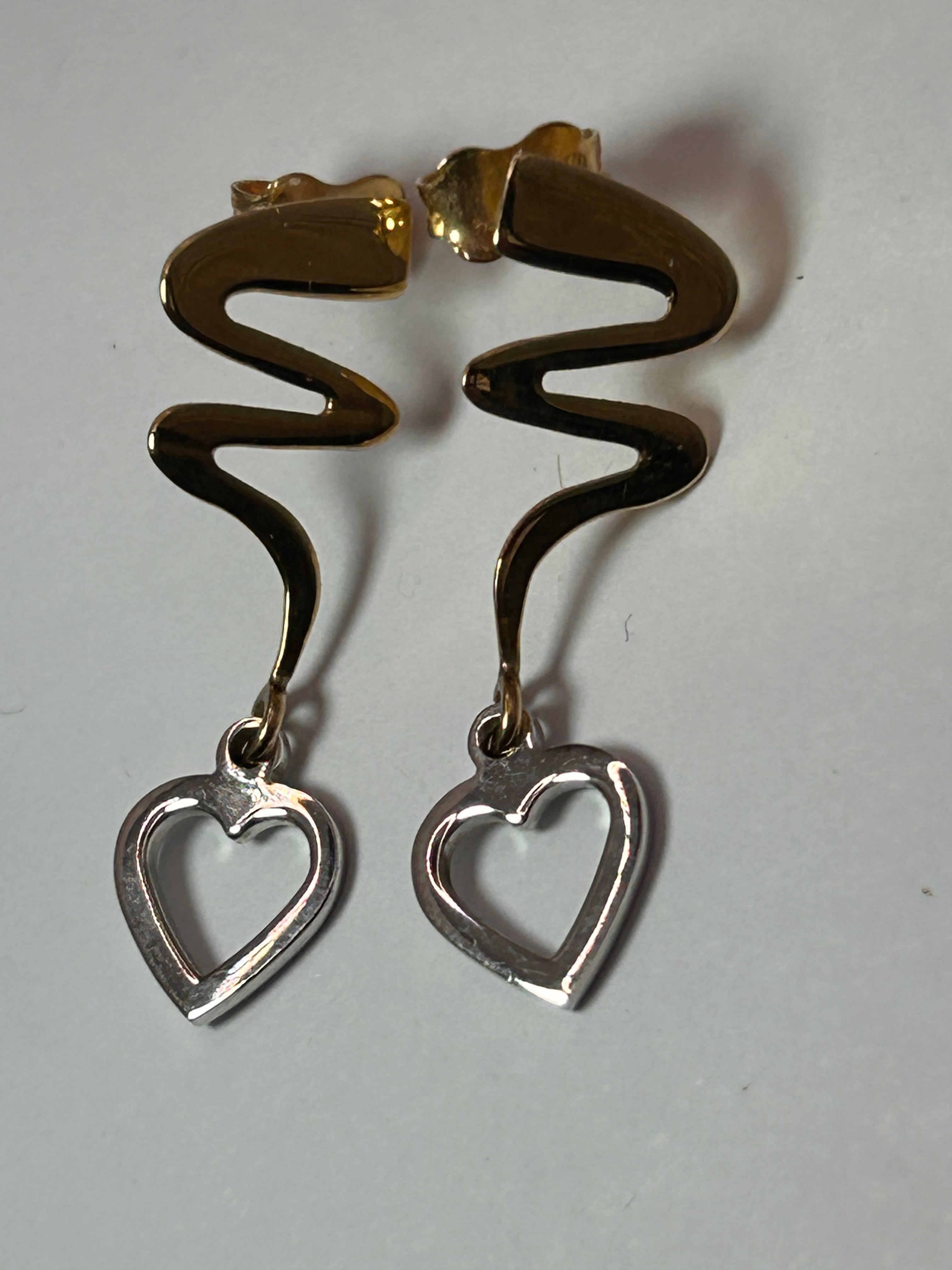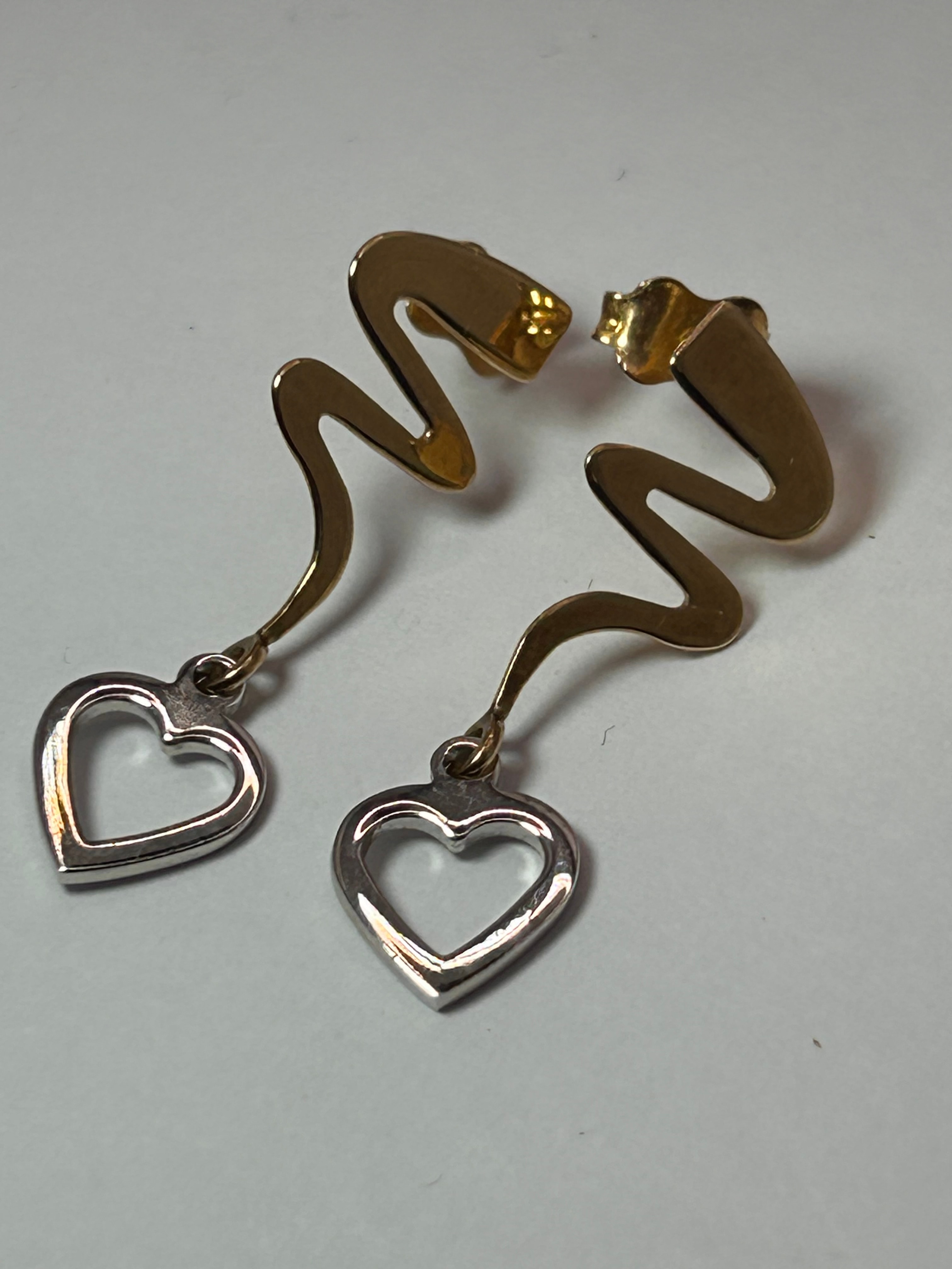 A pair of 9ct gold dangle heart earrings. Each earring features a post-back fitting attached to an elongated, undulating segment of yellow gold. From the lower end of this segment, an open heart-shaped charm of white gold is suspended. The contemporary design suggests a 20th-century origin.