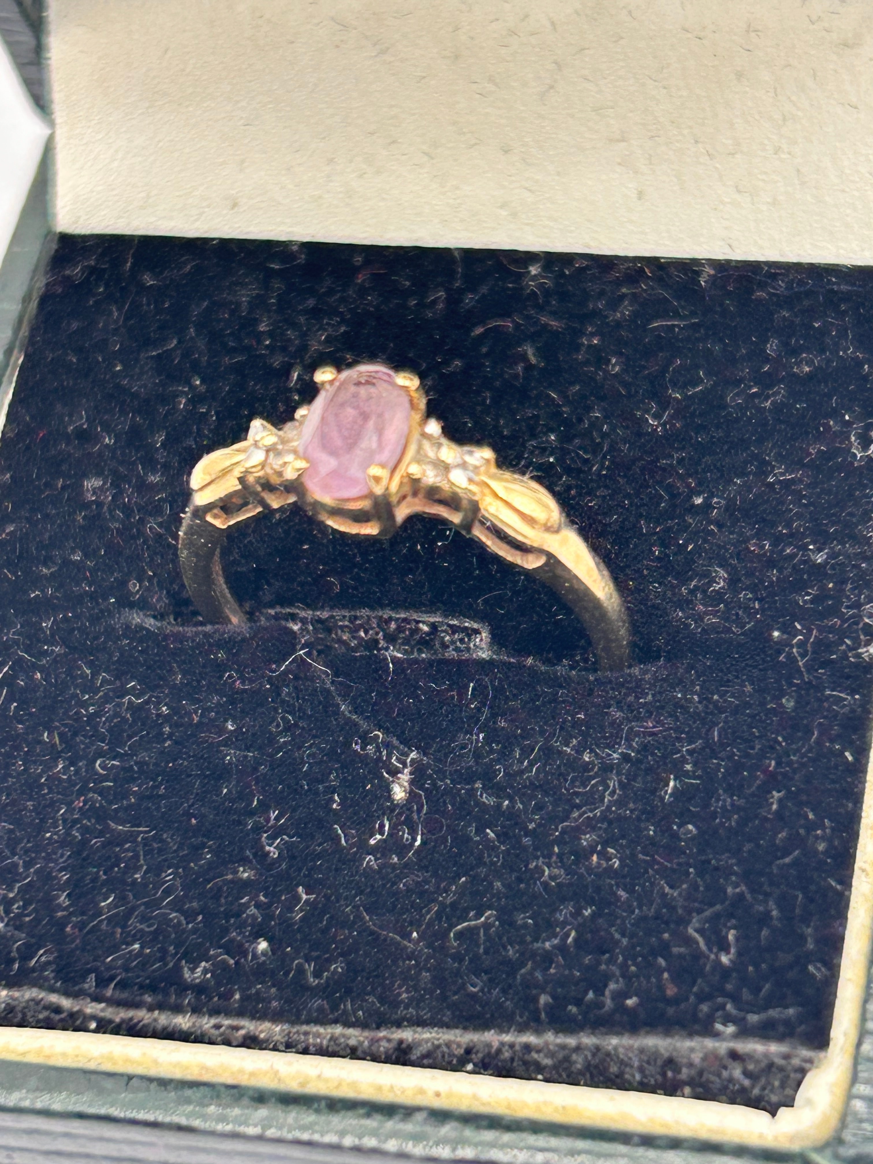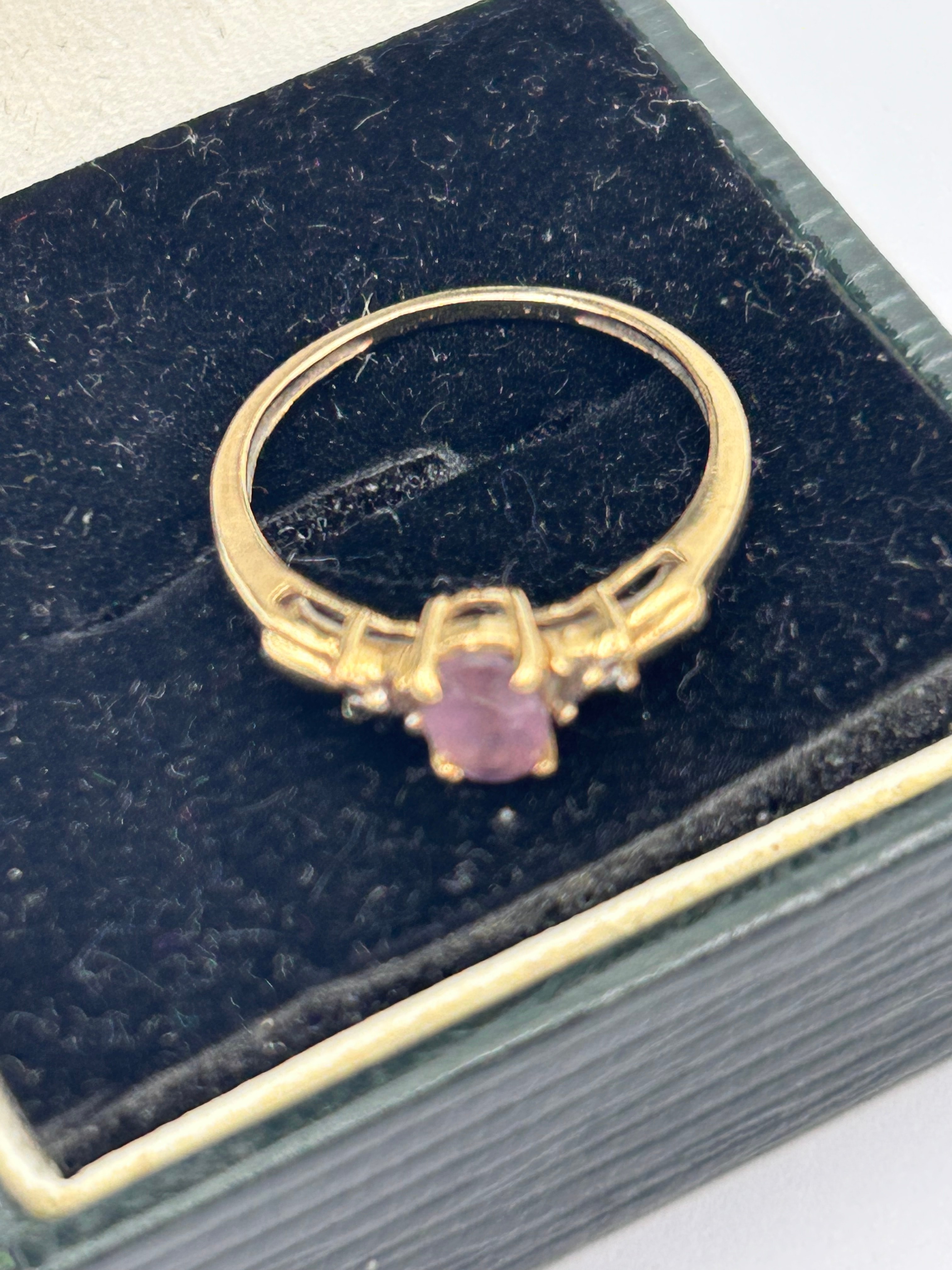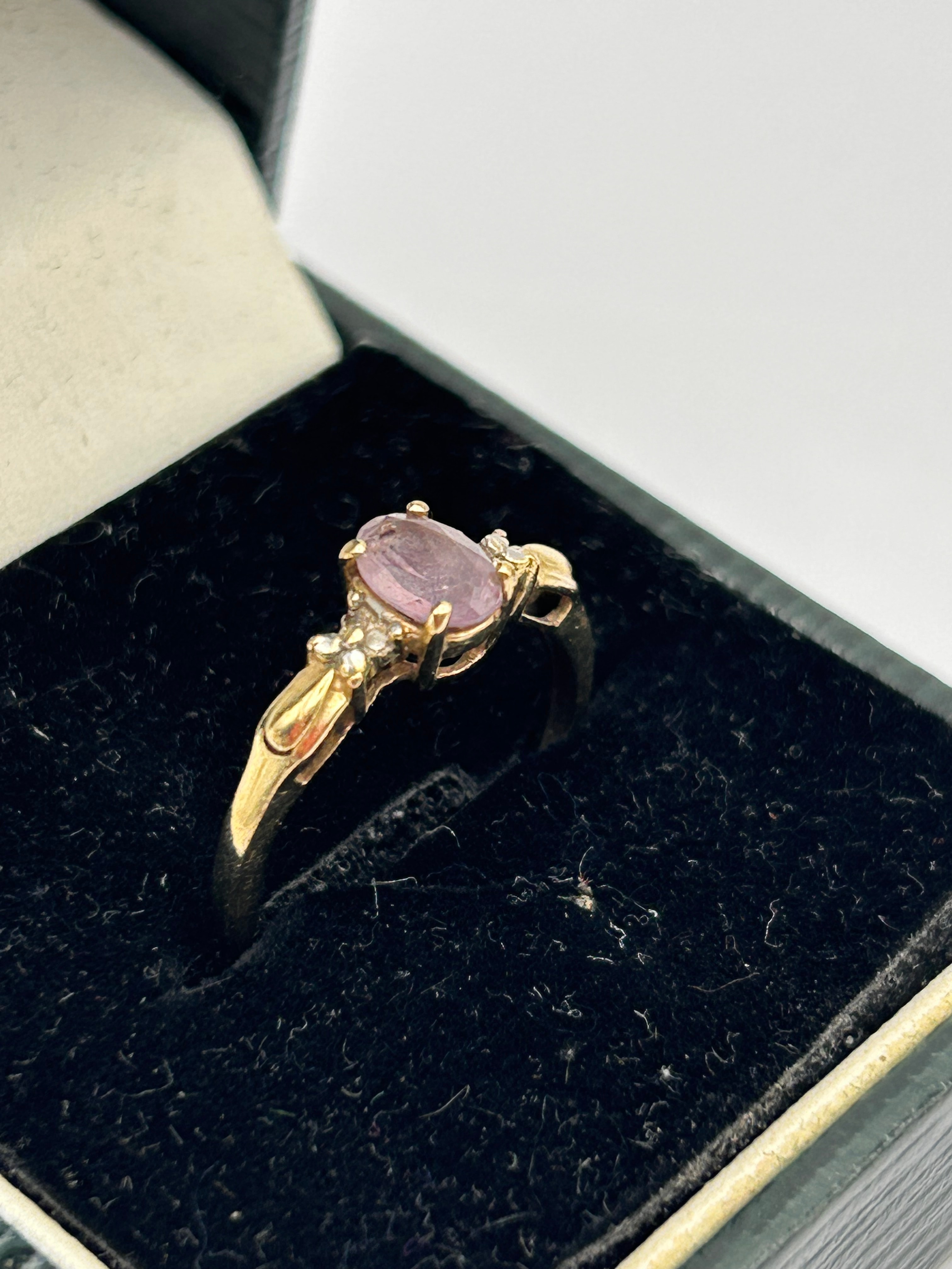 A gold 9ct ring featuring a central oval-cut, translucent purple-pink amethyst, secured by four prongs. Each shoulder of the band is adorned with two smaller, round-cut, clear diamond accents and a decorative, leaf-like motif. The design suggests a classic or contemporary style. No visible hallmarks or inscriptions are discernible.