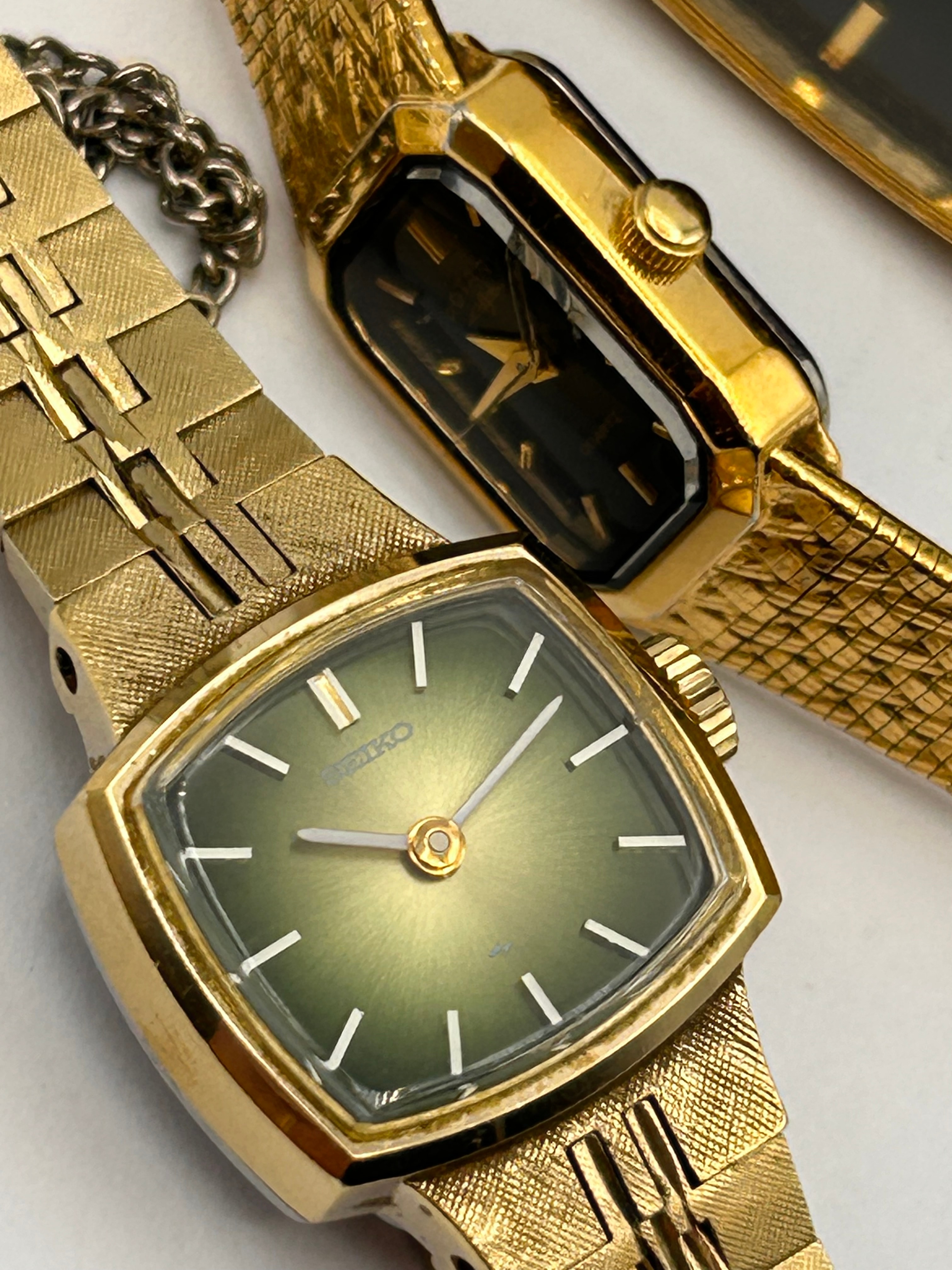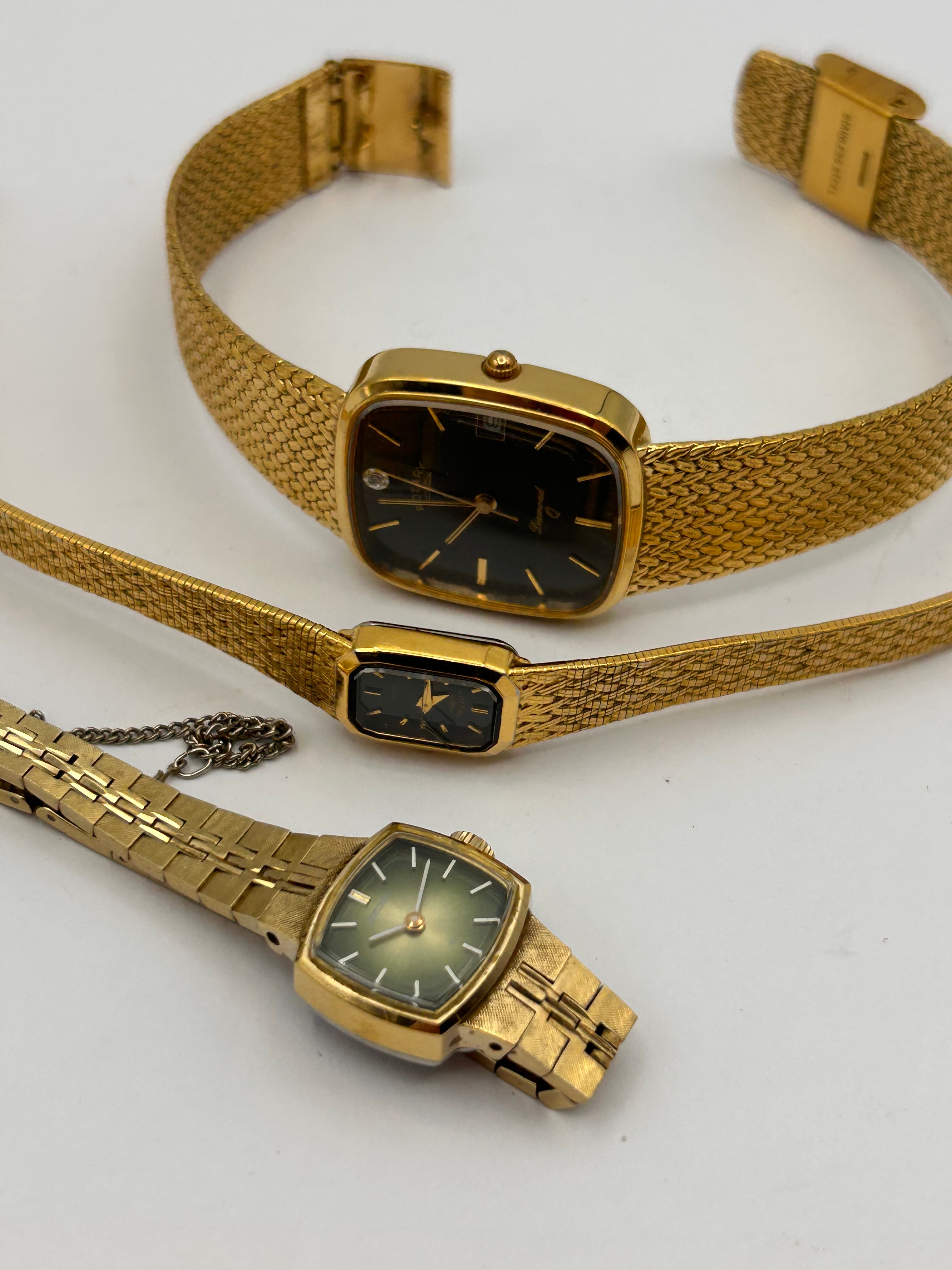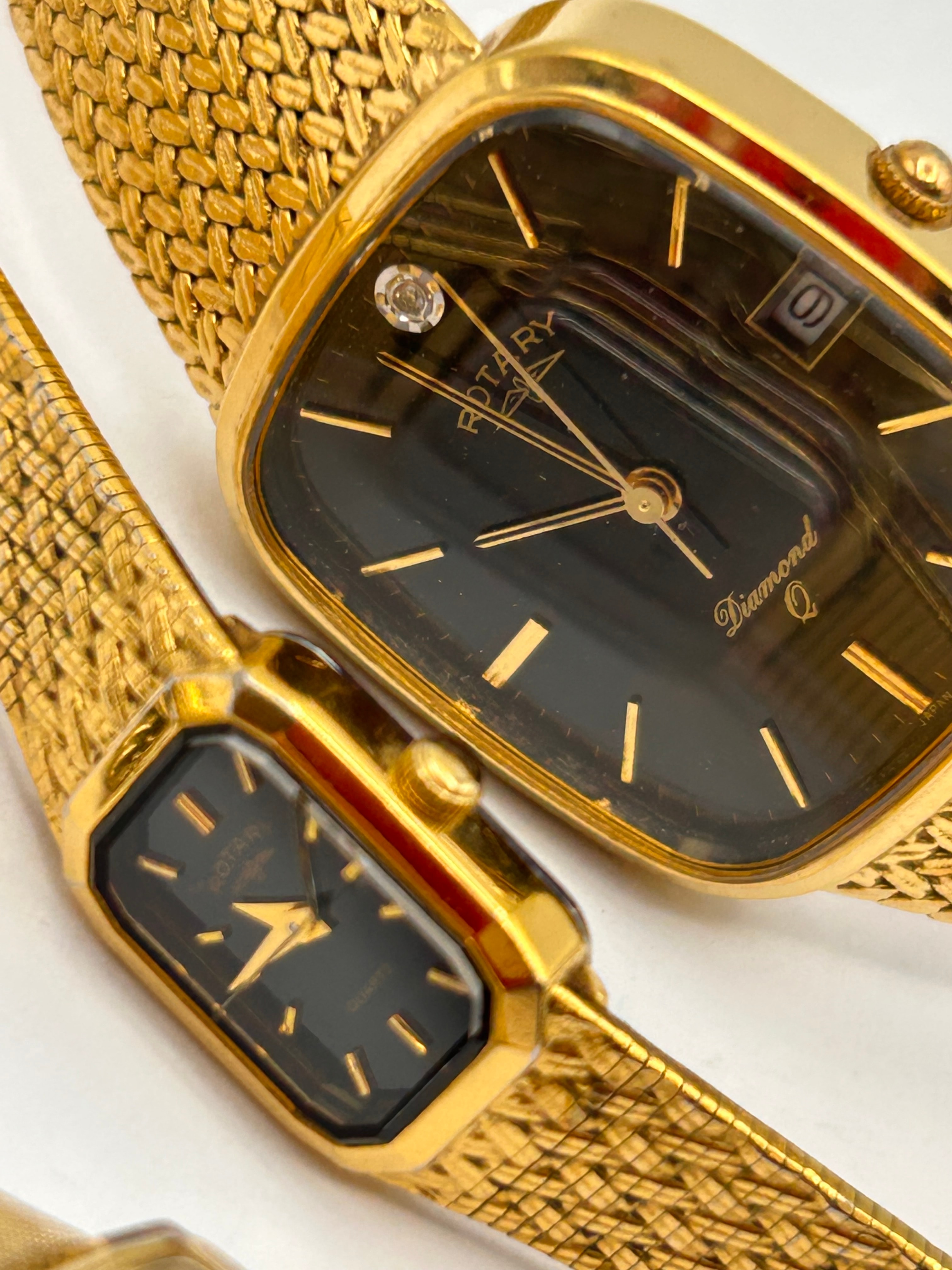 A group of three gold-tone women’s wristwatches, exhibiting styles indicative of mid to late 20th-century design. The largest watch features a rectangular cushion-shaped case with a black dial marked “ROTARY,” “Diamond,” and “Q,” featuring a single diamond-like accent at 12 o’clock and a date window at 3 o’clock, all on a finely woven mesh band; a small “JAPAN” marking is visible at 6 o’clock. The second, smaller watch has a rectangular case and a black dial bearing “ROTARY” and “QUARTZ,” also on a mesh band. The third watch, with a cushion-shaped case and a textured link band, presents a metallic green sunburst dial marked “SEIKO.”