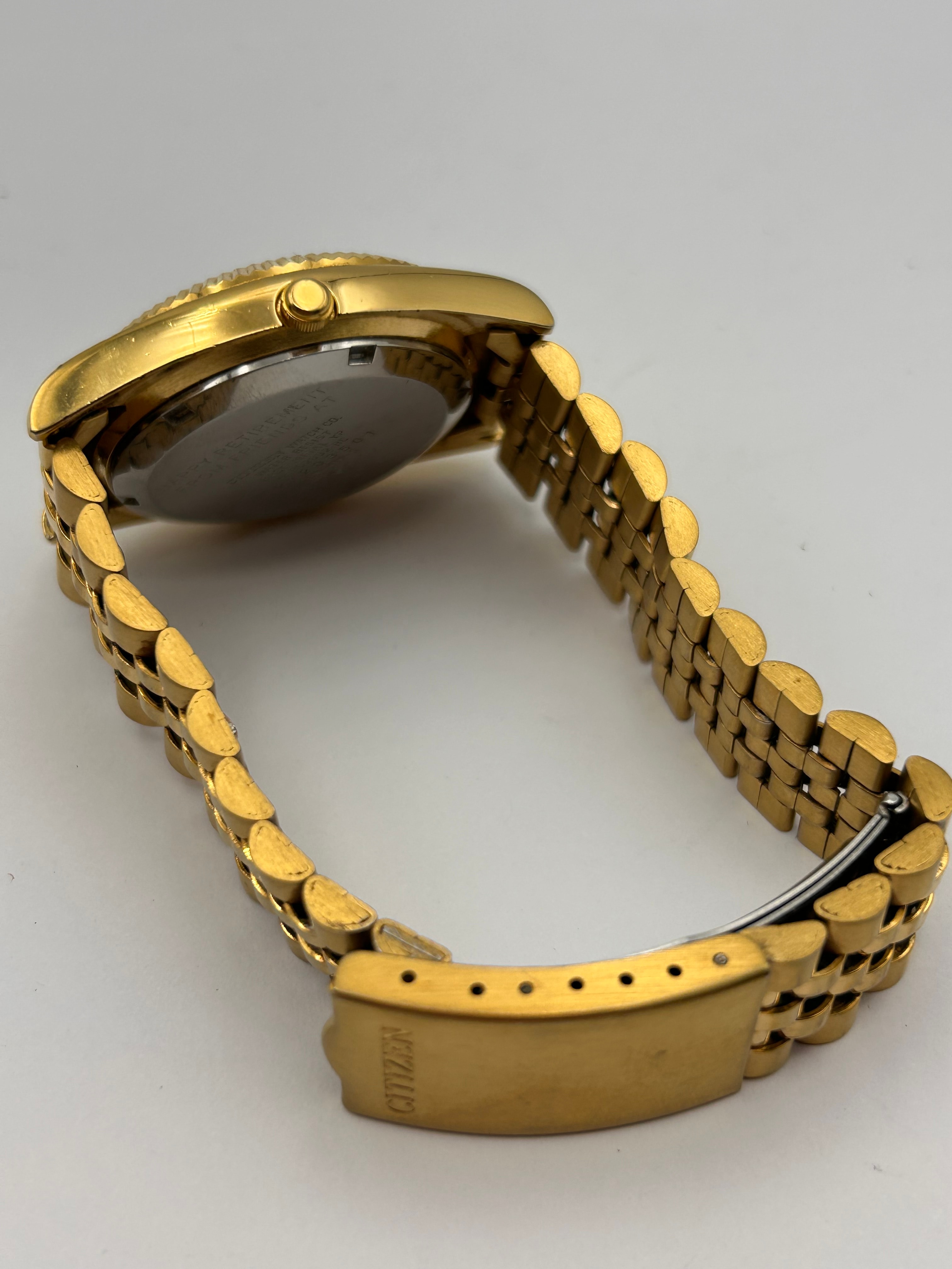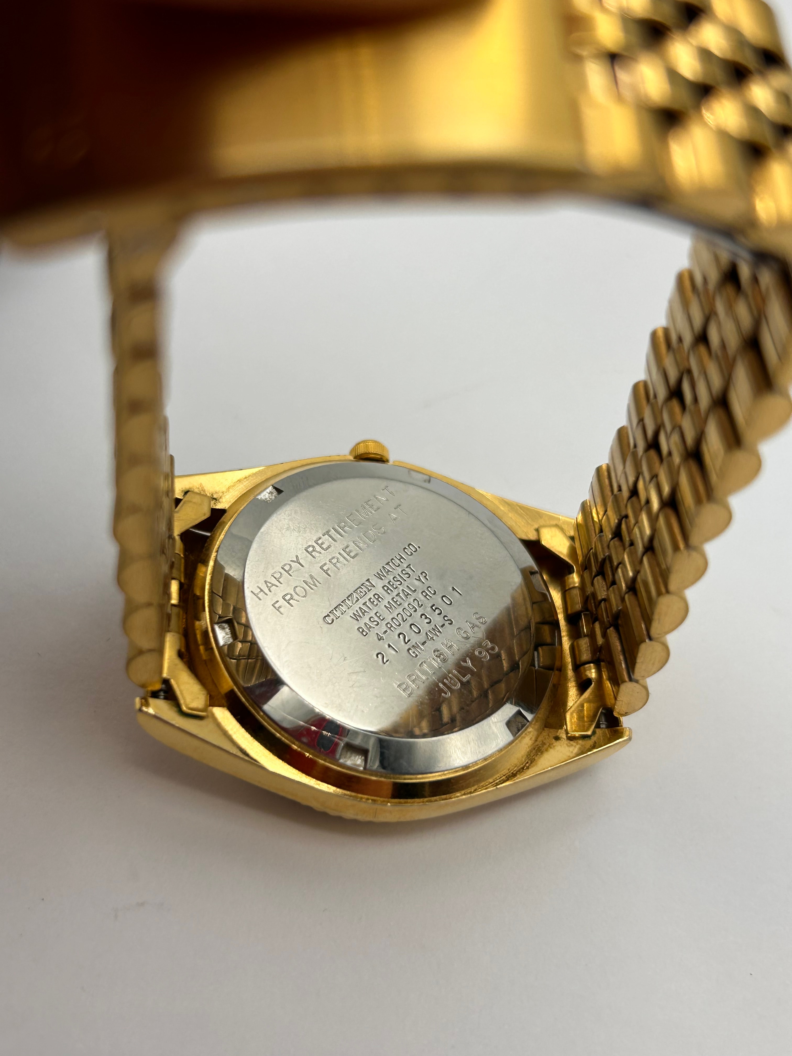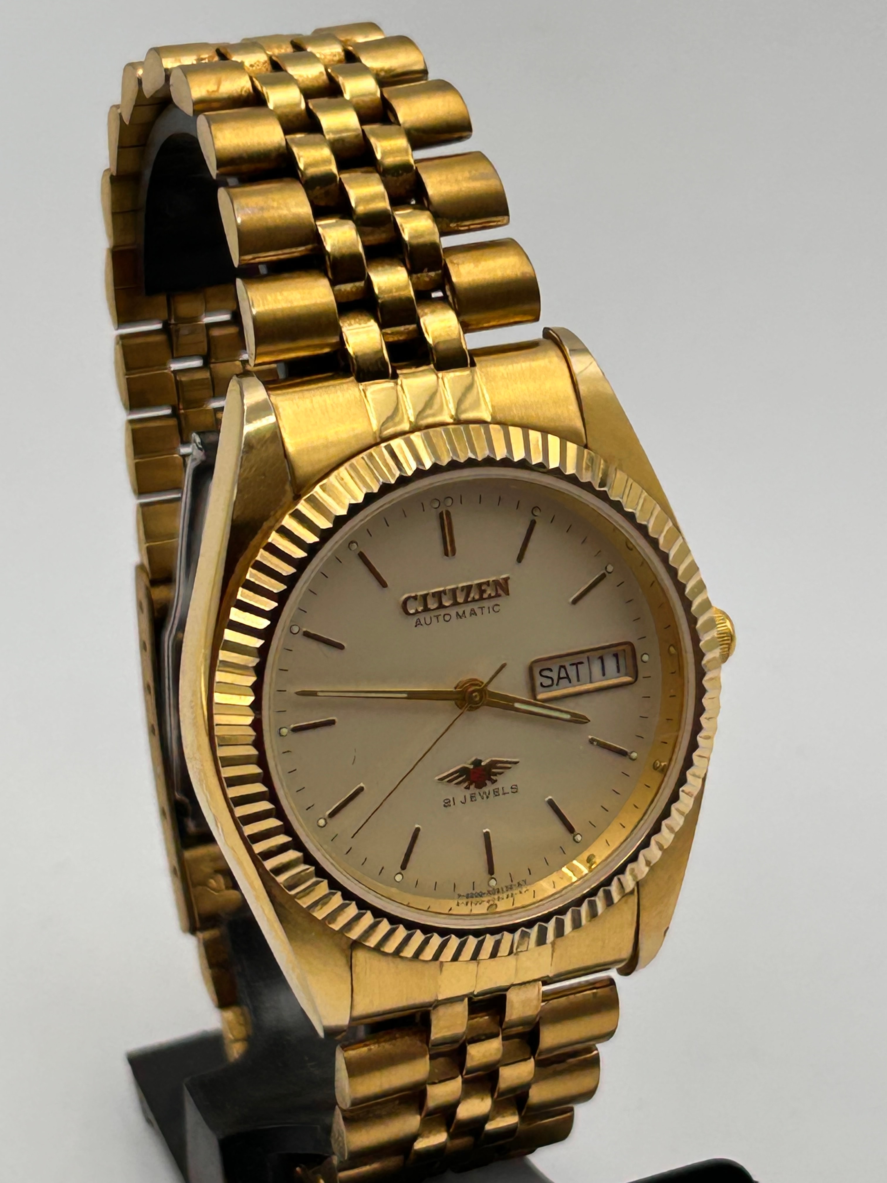 A Citizen Eagle 7 Automatic 21 Jewels gold-tone men’s wristwatch, dating to July 1985 as indicated by a case back engraving. The timepiece presents in a classic dress style with a gold-tone fluted bezel and a Jubilee-style link bracelet. Its champagne-colored dial features gold-tone baton hour markers, three gold-tone hands, a day/date window displaying “SAT 11”, and is marked “CITIZEN AUTOMATIC 21 JEWELS” along with a red eagle logo. The stainless steel case back is engraved with “HAPPY RETIREMENT FROM FRIENDS”, “CITIZEN WATCH CO.”, “WATER RESIST”, and various model/serial numbers including “4-820786-Y GN-4W-S” and “21202501”.