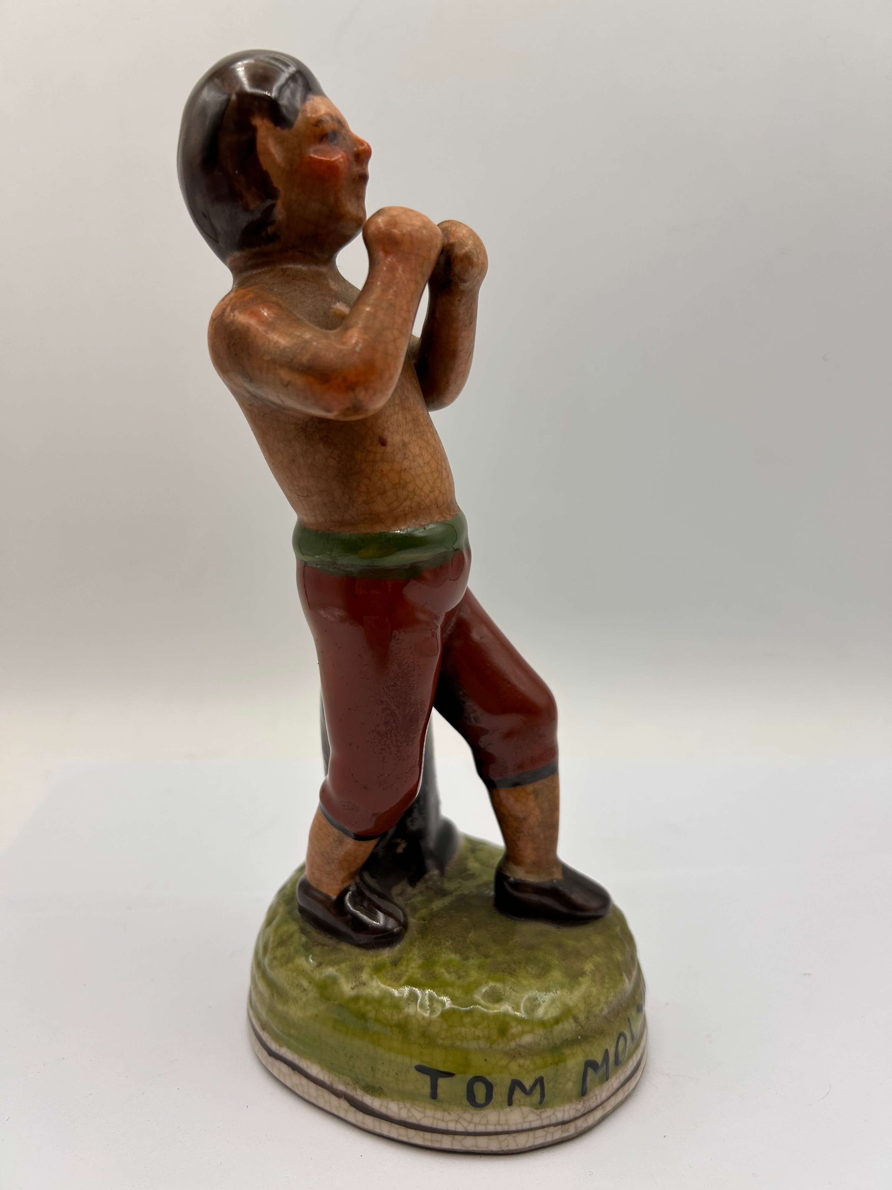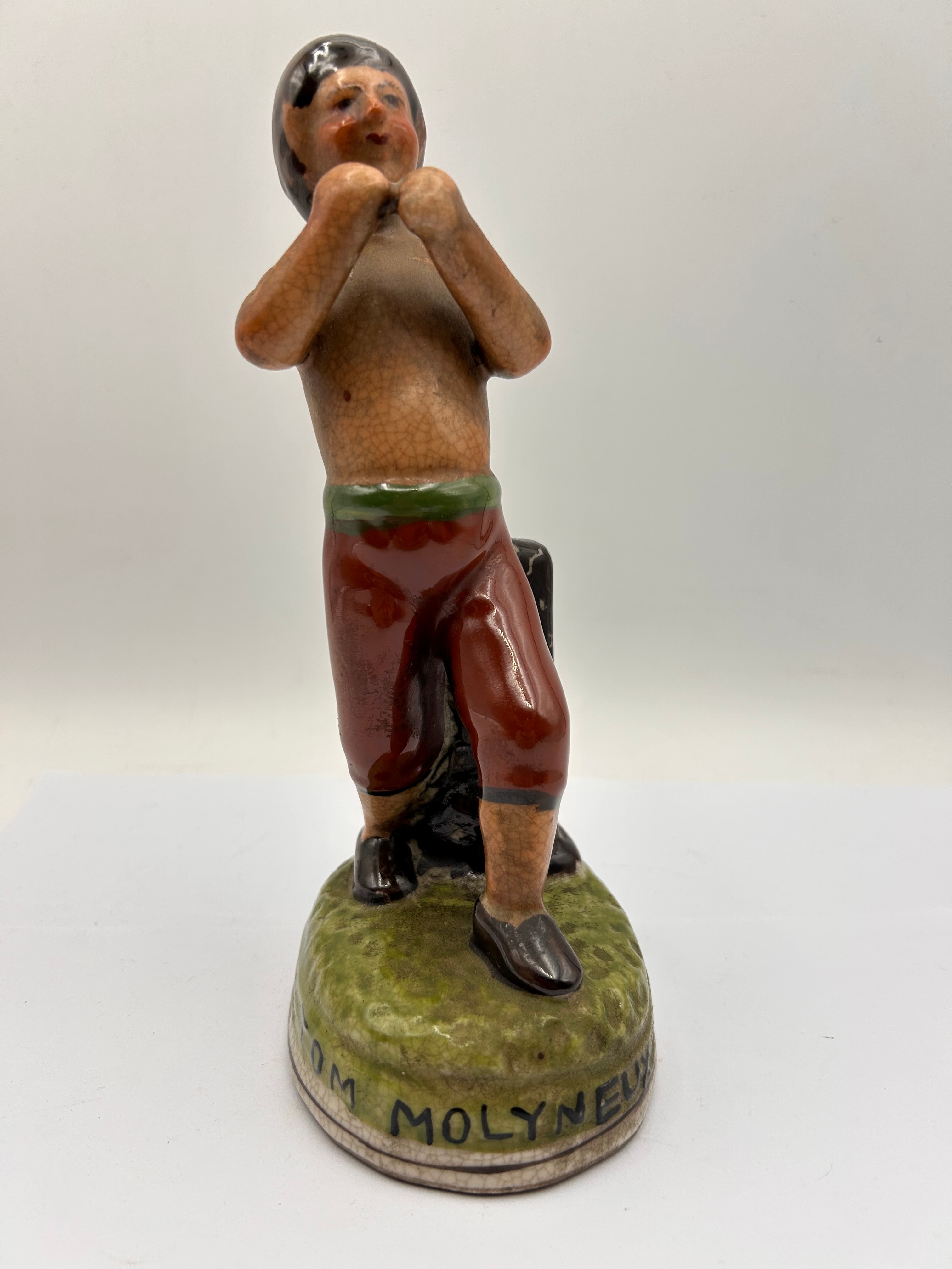 A Tom Molyneux Ceramic Figurine, a glazed earthenware figural pottery piece depicting a male figure, likely a boxer, in a stance with clenched fists and leaning pose against what appears to be a tree stump. The figure wears dark red trousers with a green waistband and dark shoes, with a bare upper torso and arms. The coloring is primarily browns, reds, greens, and black. The base is molded to resemble a grassy mound and bears the raised capital inscription “TOM MOLYNEUX.”