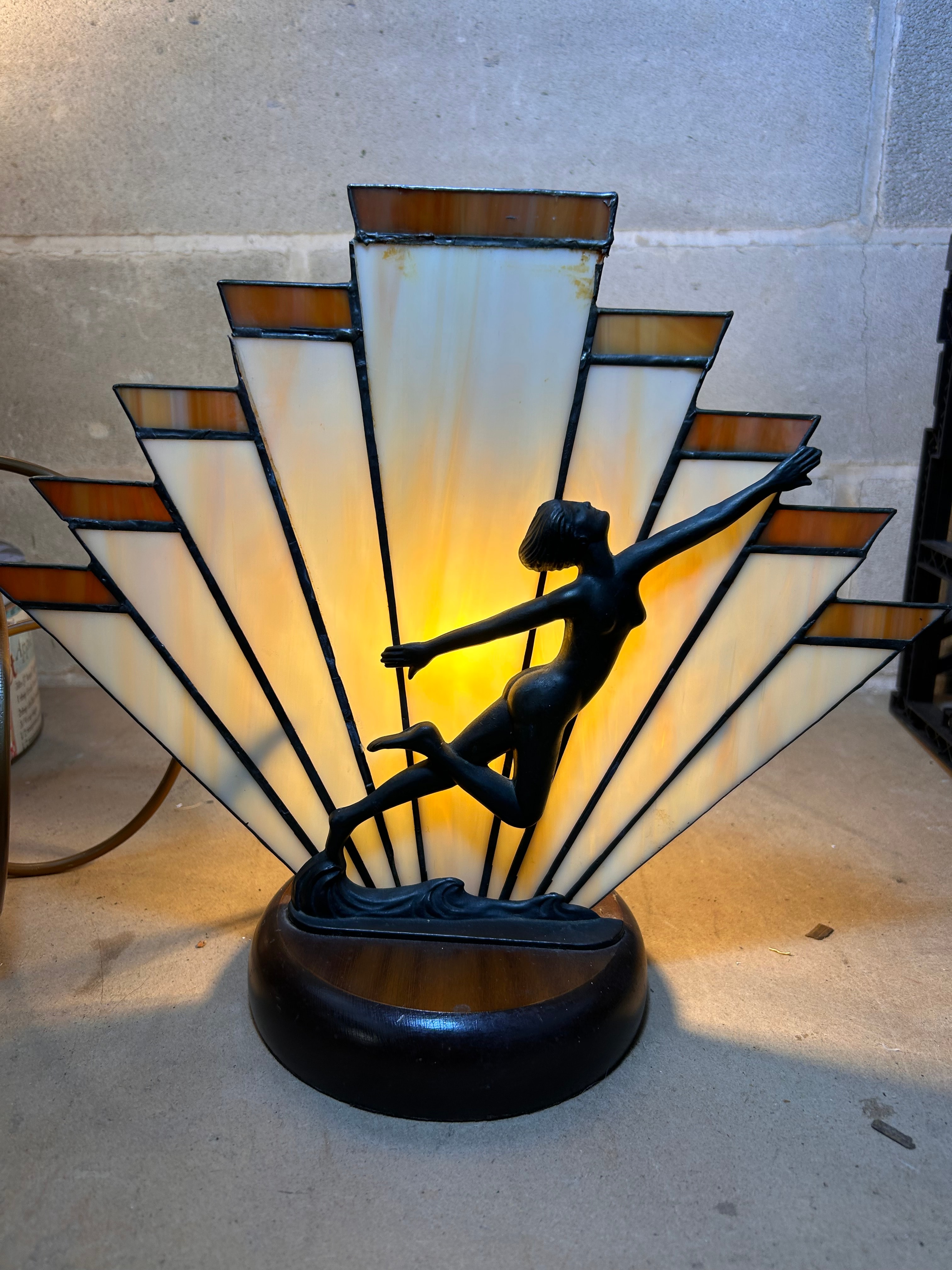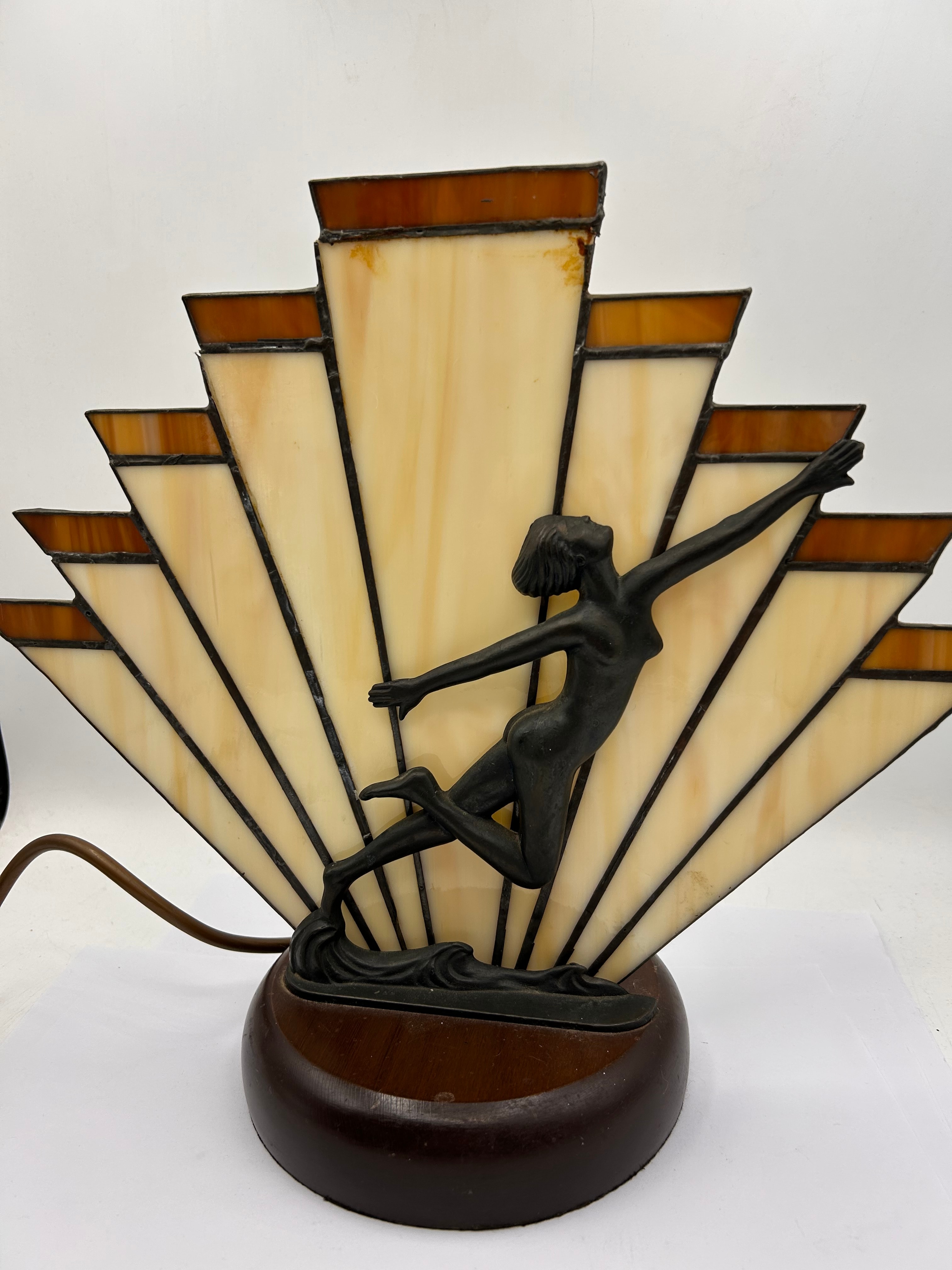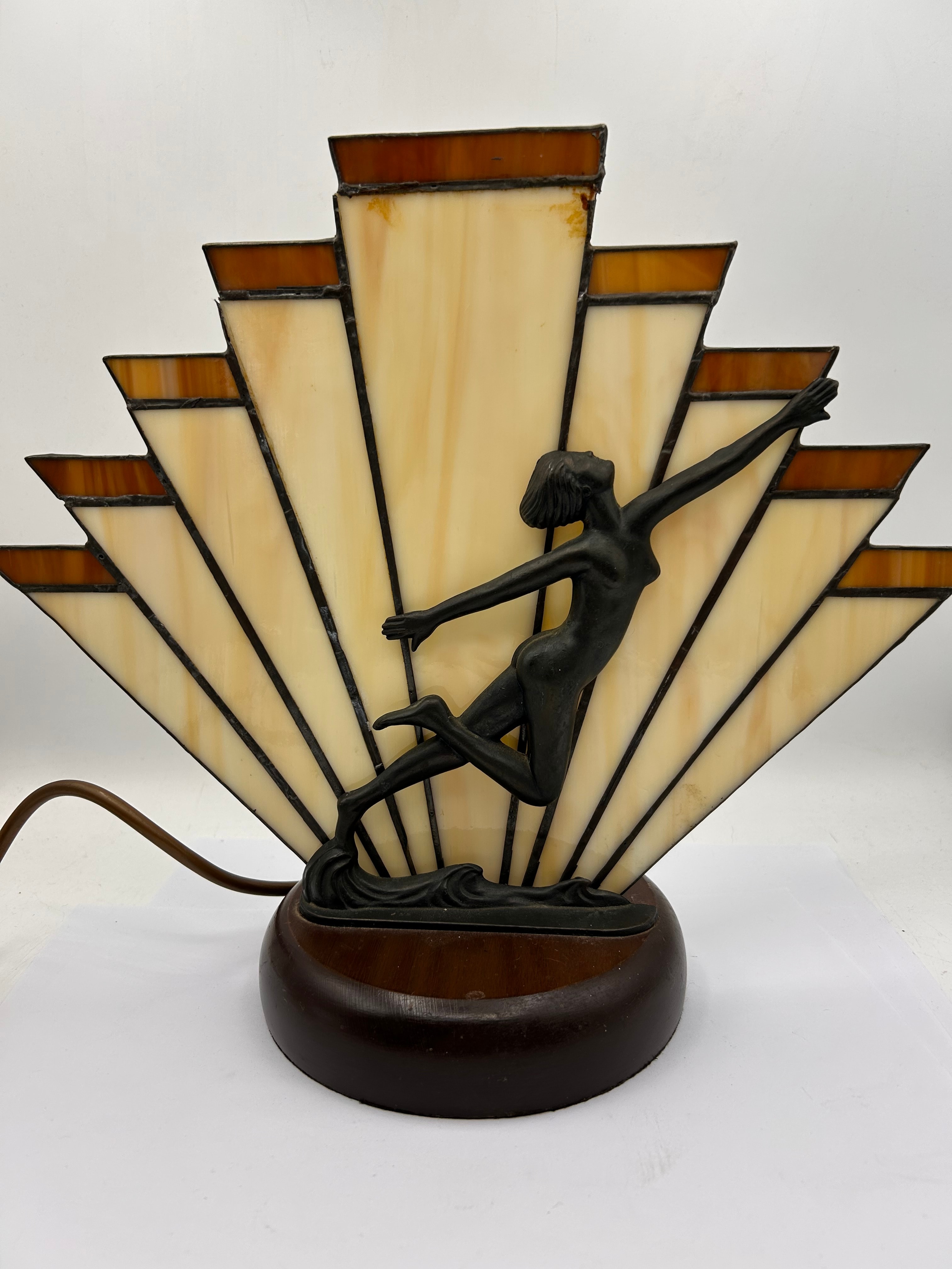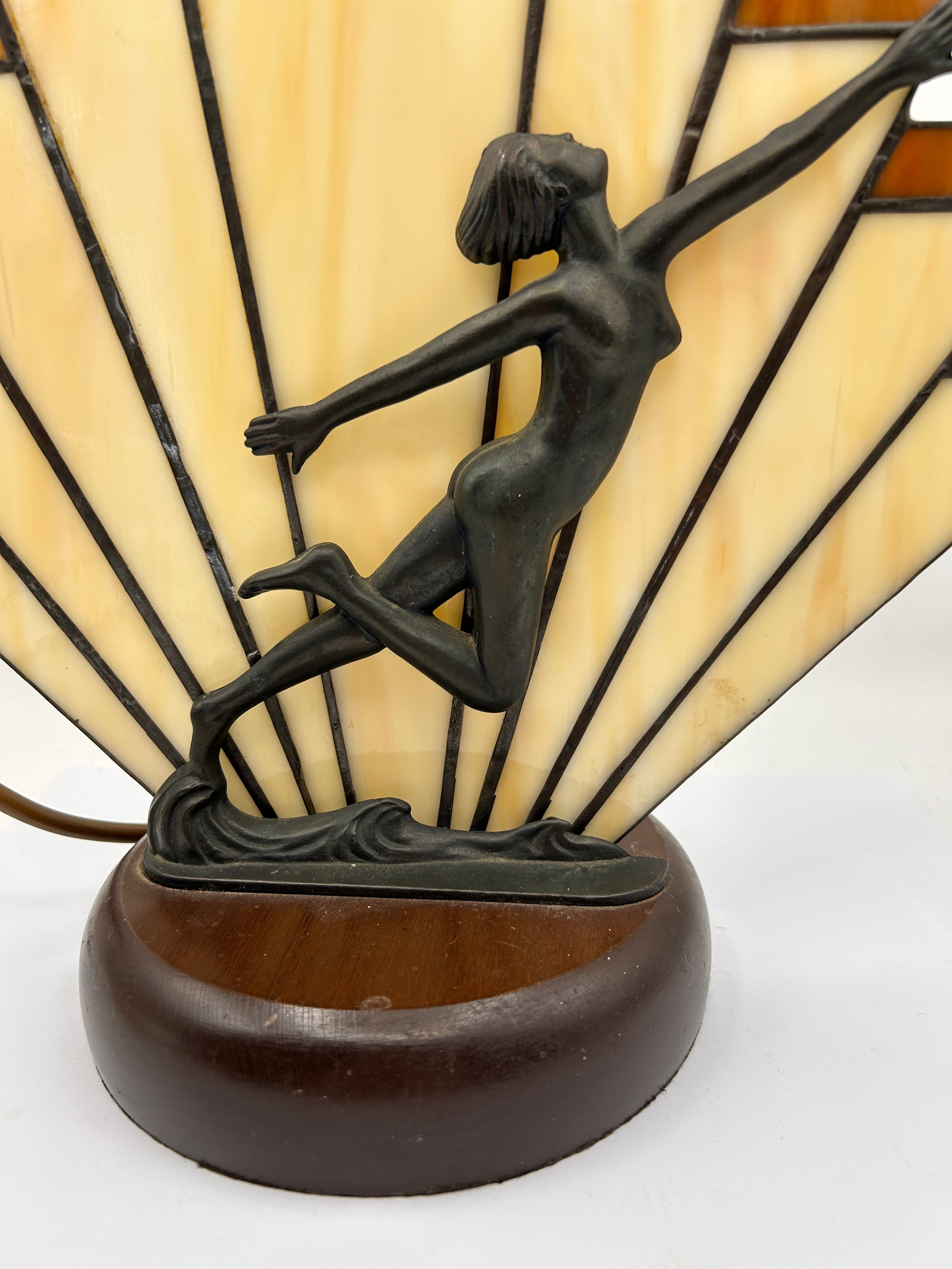 A J.B. Hirsch Style?? Art Deco Woman Stained Glass Fan Table Lamp, likely dating to the early 20th century. This lamp features a prominent dark-patinated metal figural sculpture of a leaping female dancer mounted on a dark-stained rounded wooden base. Behind the figure is a fan-shaped stained glass shade composed of opalescent cream/yellow and amber-brown glass panels, joined by dark leading.