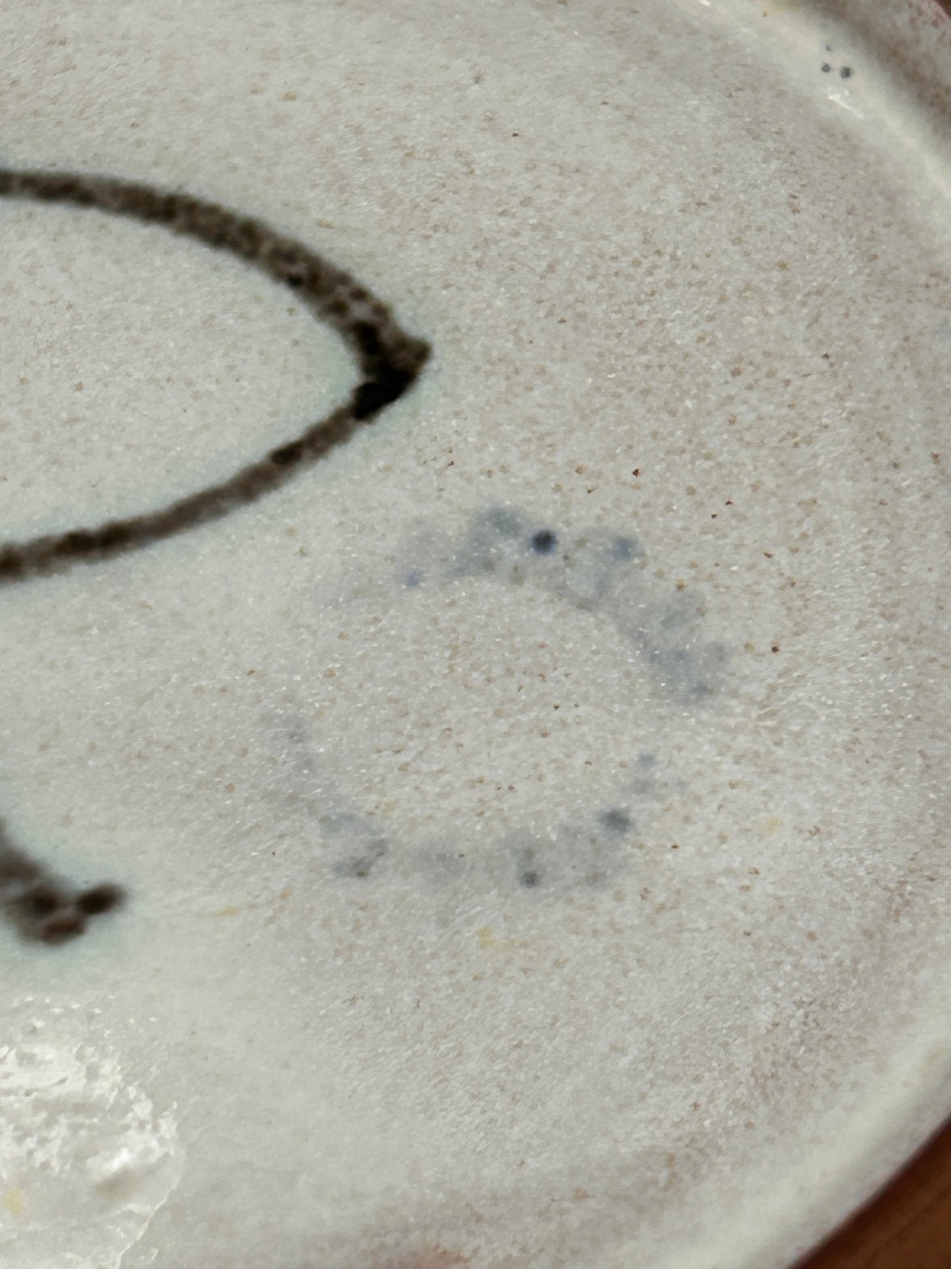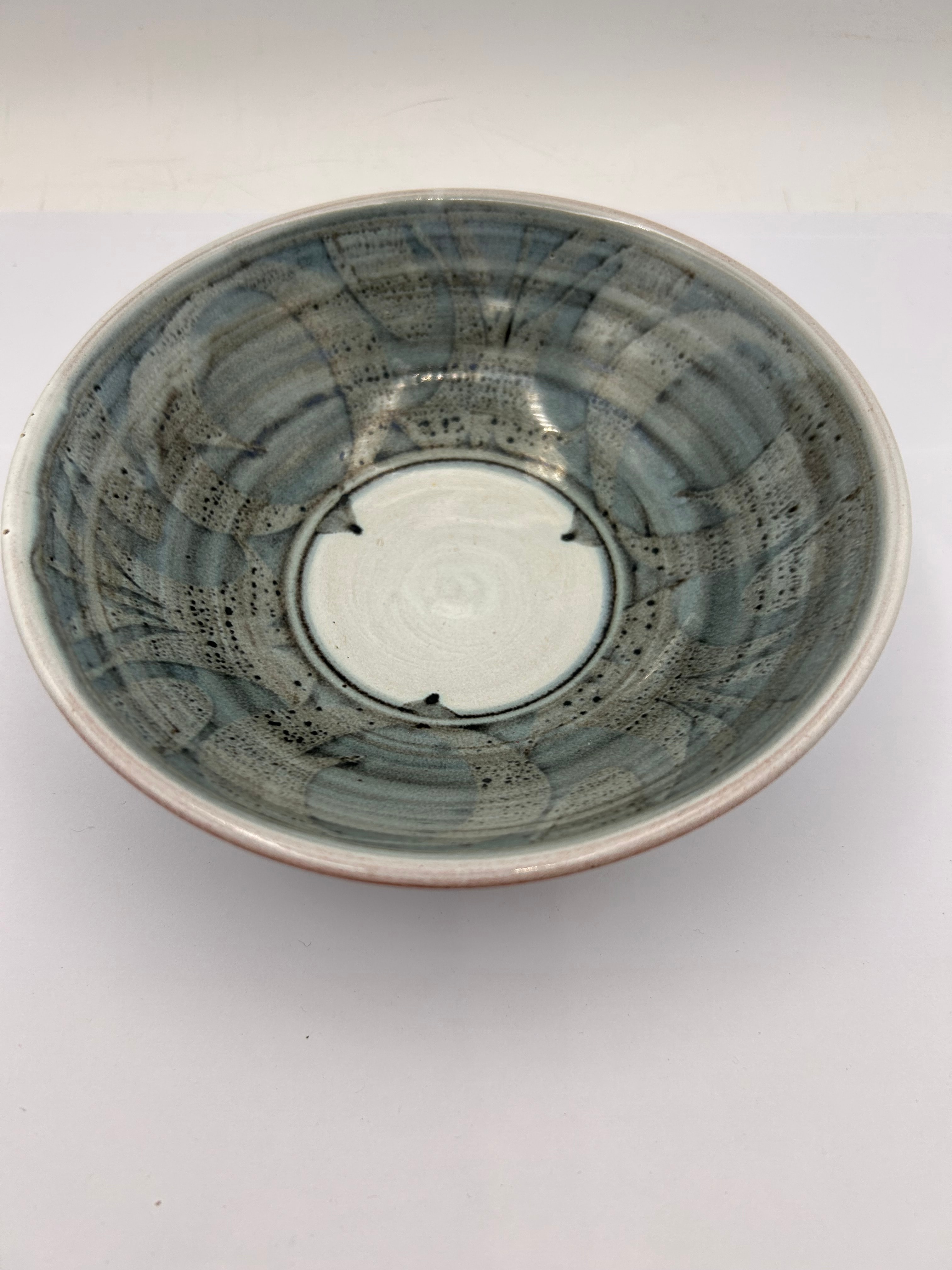 A contemporary studio pottery bowl, likely stoneware, featuring a reactive-style glaze primarily in mottled grey-blue and dark grey tones on its interior. The central area reveals concentric cream-white circles. The rim is a lighter cream or off-white. The unglazed foot rim on the exterior base is a reddish-brown. The base bears a hand-painted dark brown/black mark resembling a stylized ‘R’ or a monogram, accompanied by a faint blue circular mark to its right.
