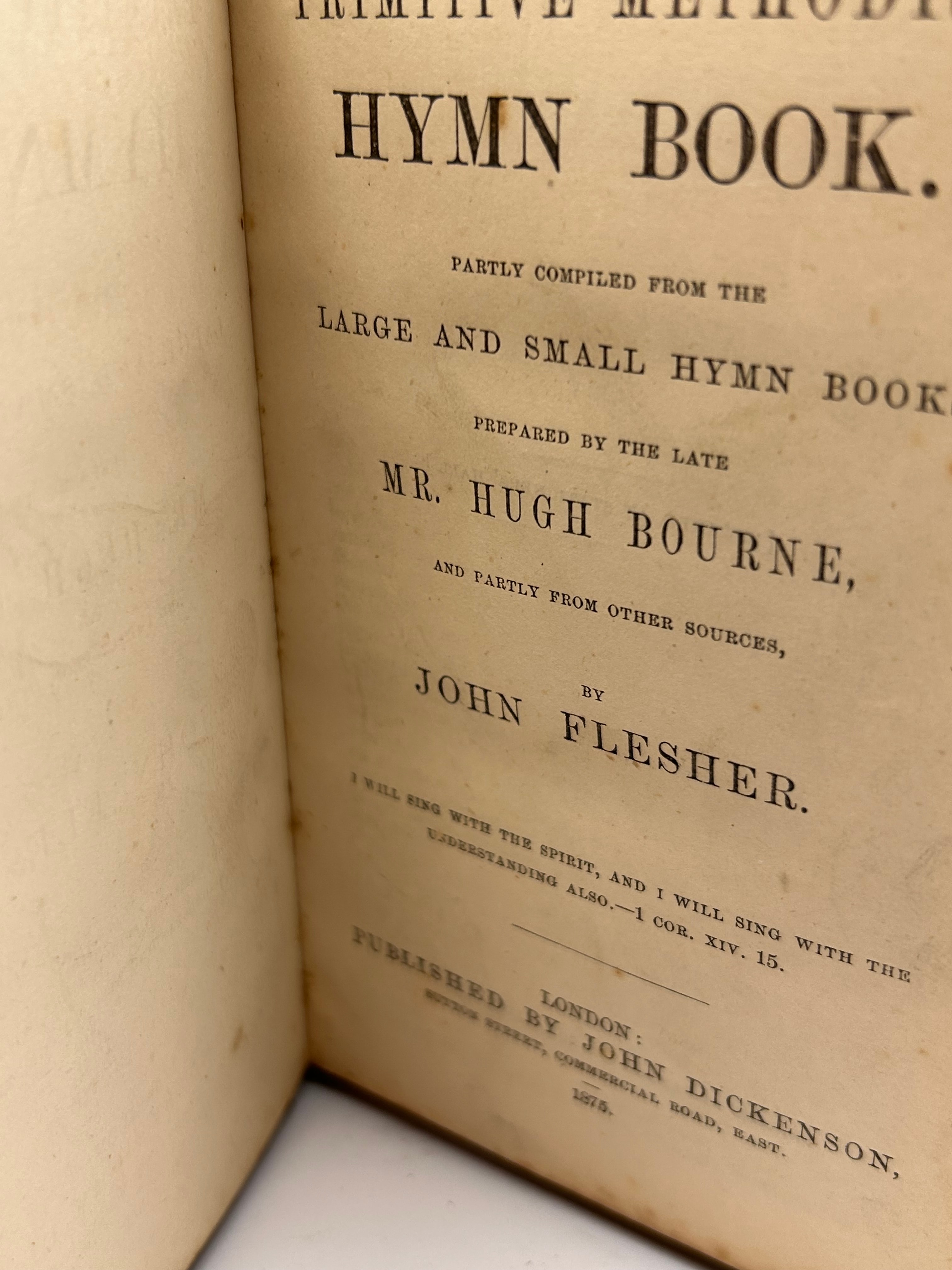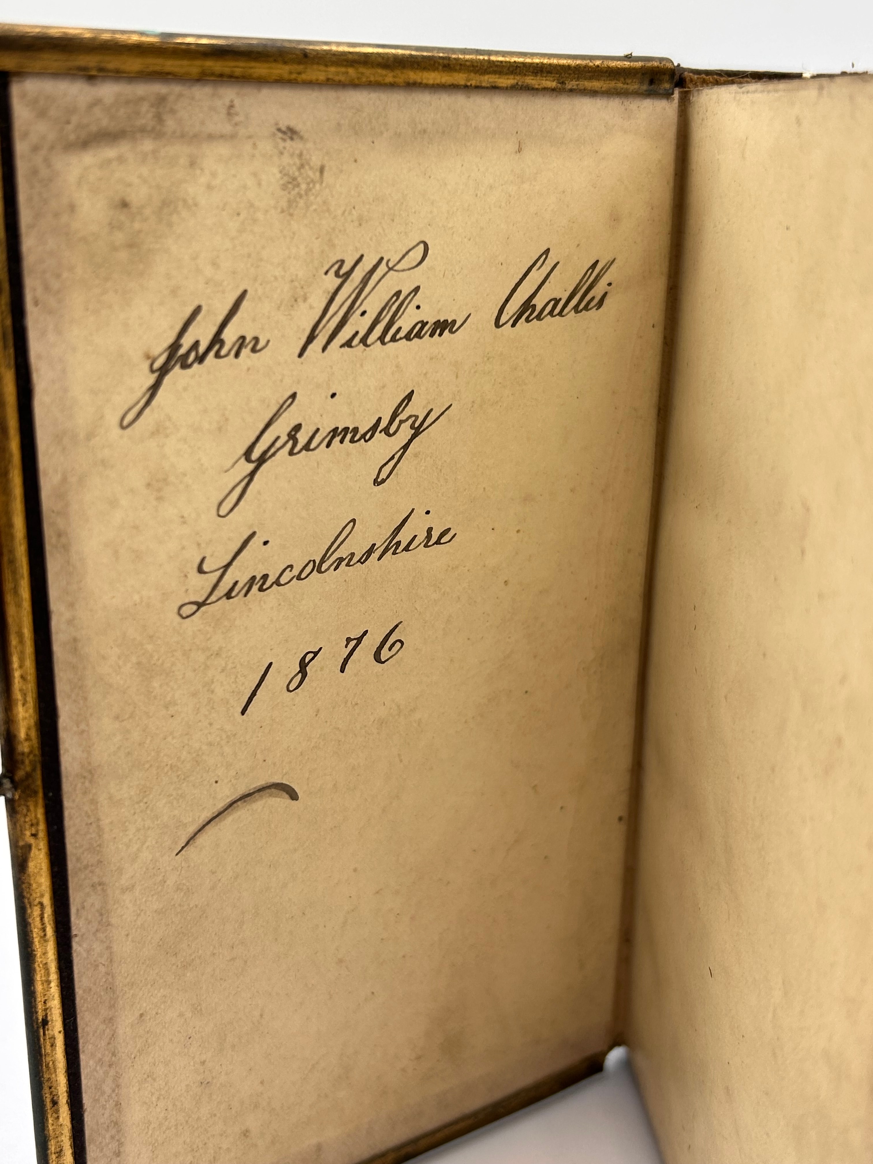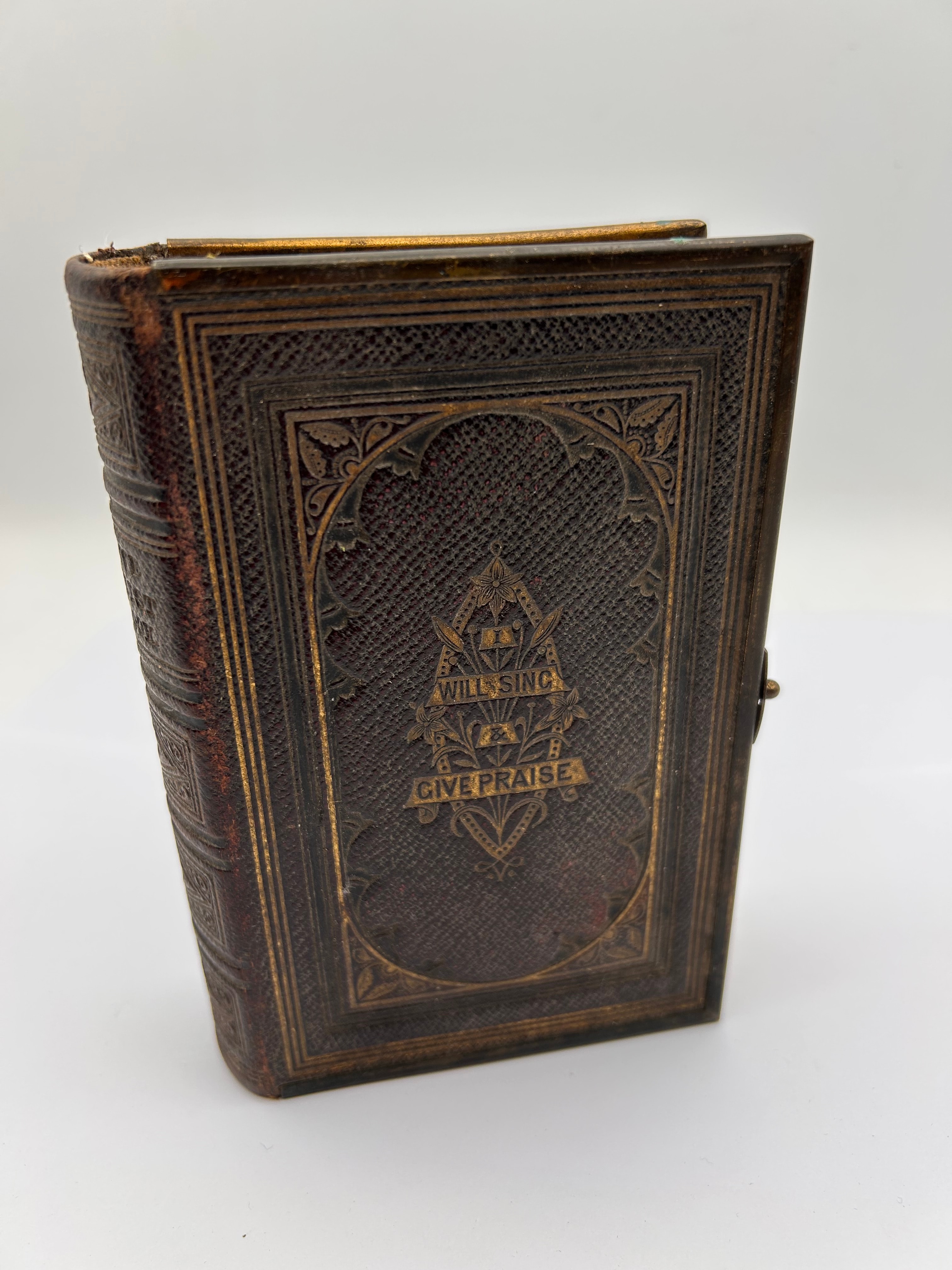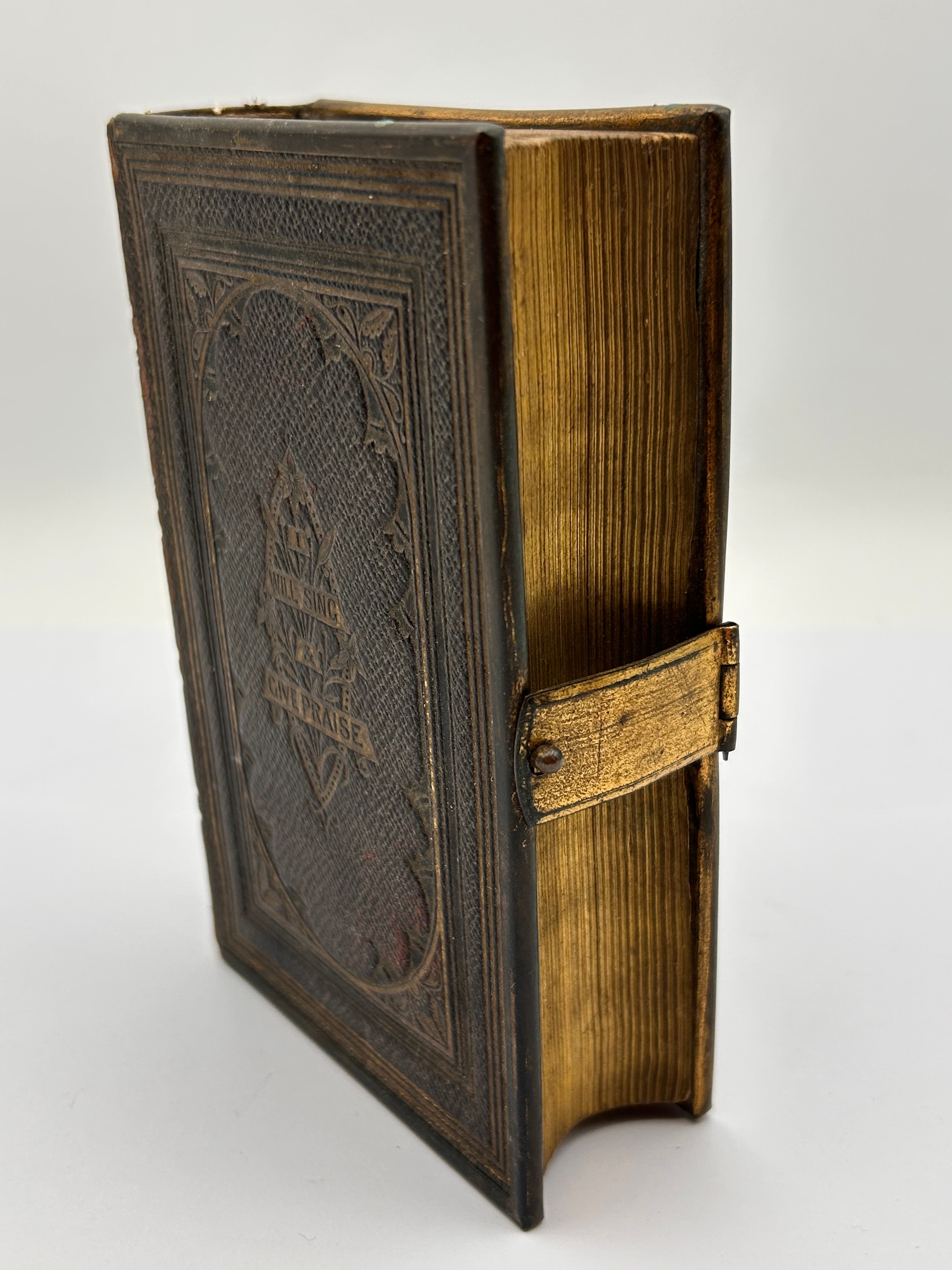 An antique Primitive Methodist Hymn Book, published in London by John Dickenson in 1875. The book features a dark brown leather or imitation leather binding, adorned with ornate gilt tooling and gilded page edges, characteristic of the late Victorian aesthetic. The front cover is decorated with the phrases ‘WILL SING’ and ‘GIVE PRAISE’ encircling a central emblem. It is equipped with a metal clasp. Inside the front cover, a handwritten inscription reads ‘John William Challis, Grimsby, Lincolnshire, 1876’.