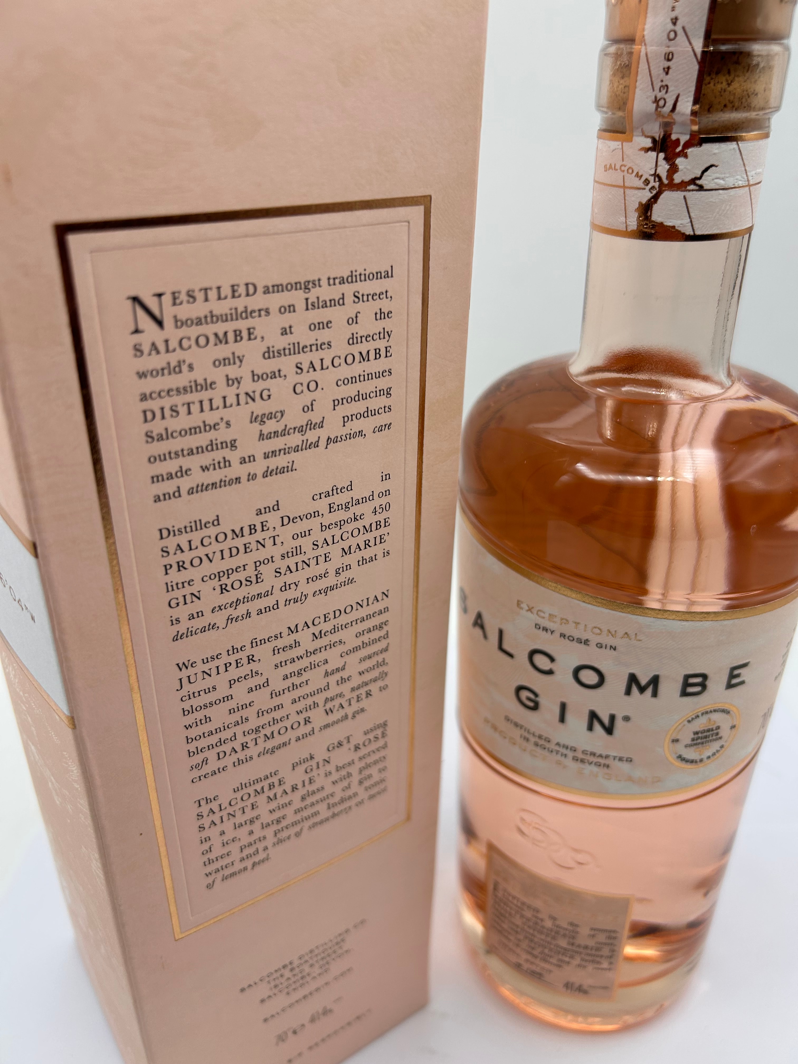 A clear glass bottle of Salcombe Gin Exceptional Dry Rosé Gin, containing a pale rosé pink spirit. The bottle is sealed with a cork stopper, topped by a gold-toned capsule featuring a tree motif, with “SALCOMBE” printed on the cork. It is accompanied by its original pale pink cardboard box. Both the bottle and box labels identify the product as “DISTILLED AND CRAFTED IN SOUTH DEVON. PRODUCT OF ENGLAND,” with the bottle specifically marked “41.4% vol.” and “70cl.” The bottle’s label also displays “IWSC SPIRITS AWARDS 2017 DOUBLE GOLD” and “GREAT TASTE 2018” medallions. Extensive descriptive text, including “SMALL BATCH,” is visible on both components, indicating a contemporary, commercial style.