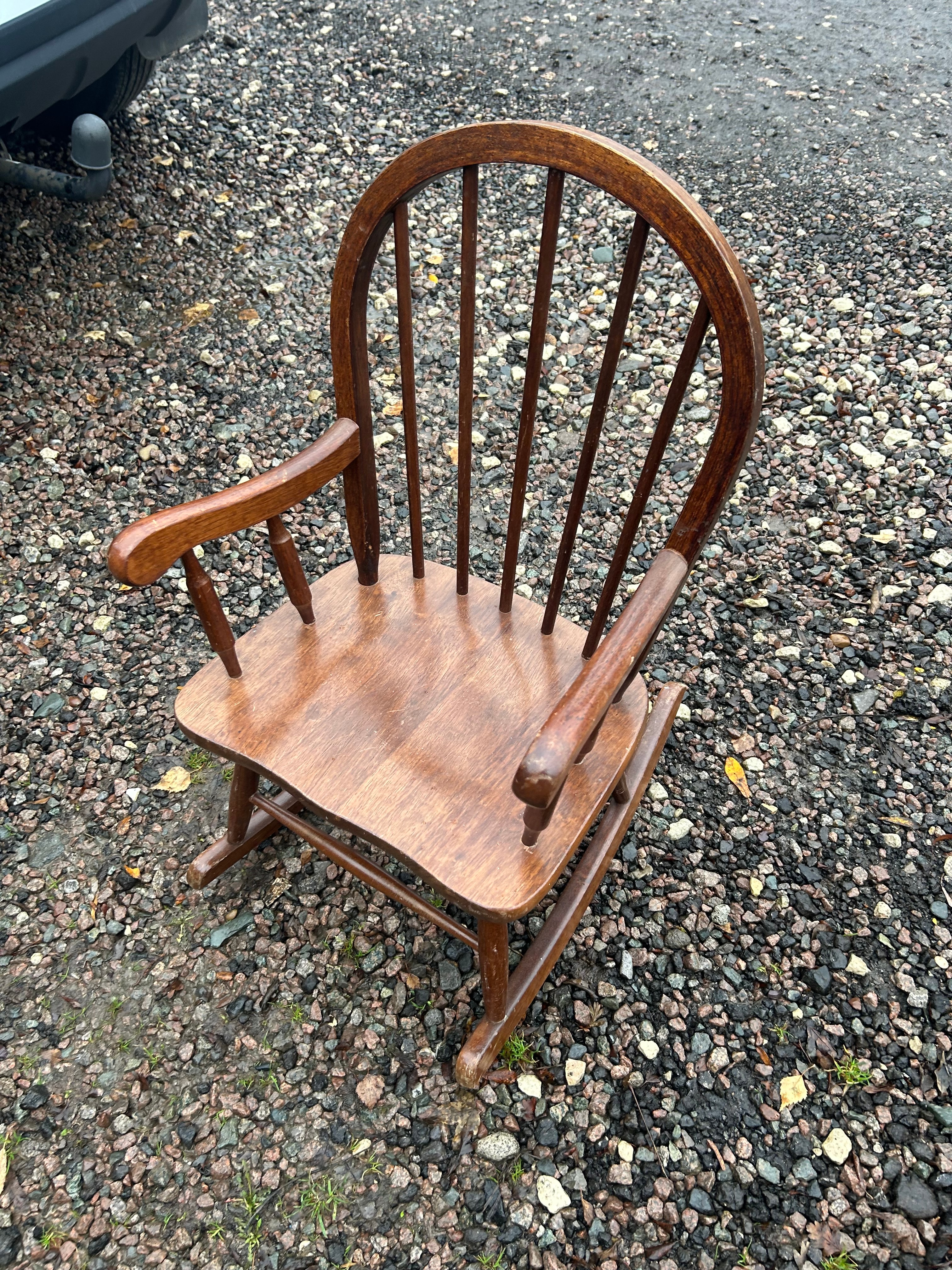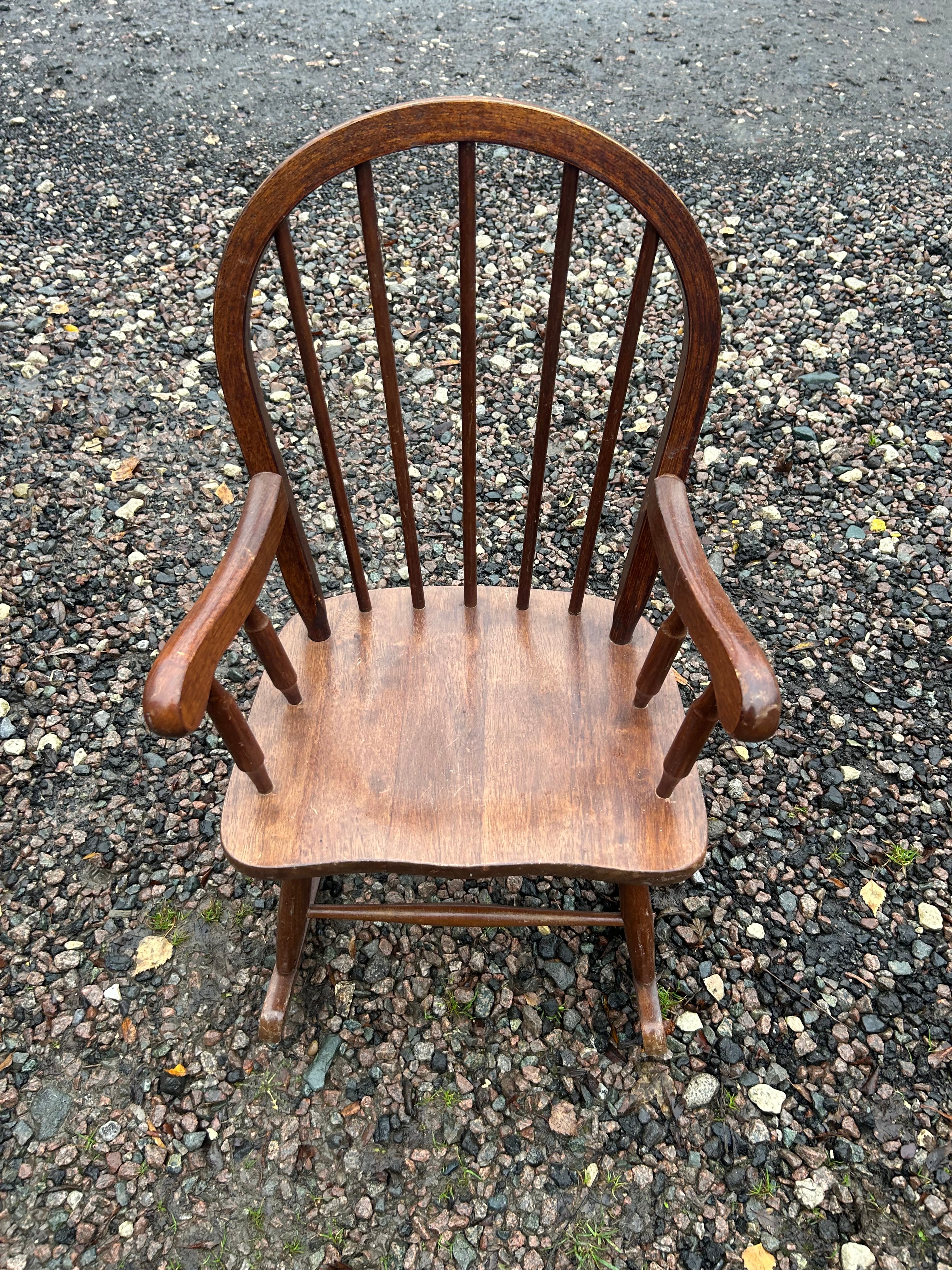 A 19th Century Windsor style spindle back rocking chair. The chair features a curved bentwood crest rail above several turned vertical spindles, turned armrests supported by additional spindles, and a carved saddle-style seat. It is constructed from a medium-brown stained hardwood and rests on two curved wooden rockers. No visible text, labels, or maker’s marks are discernible.