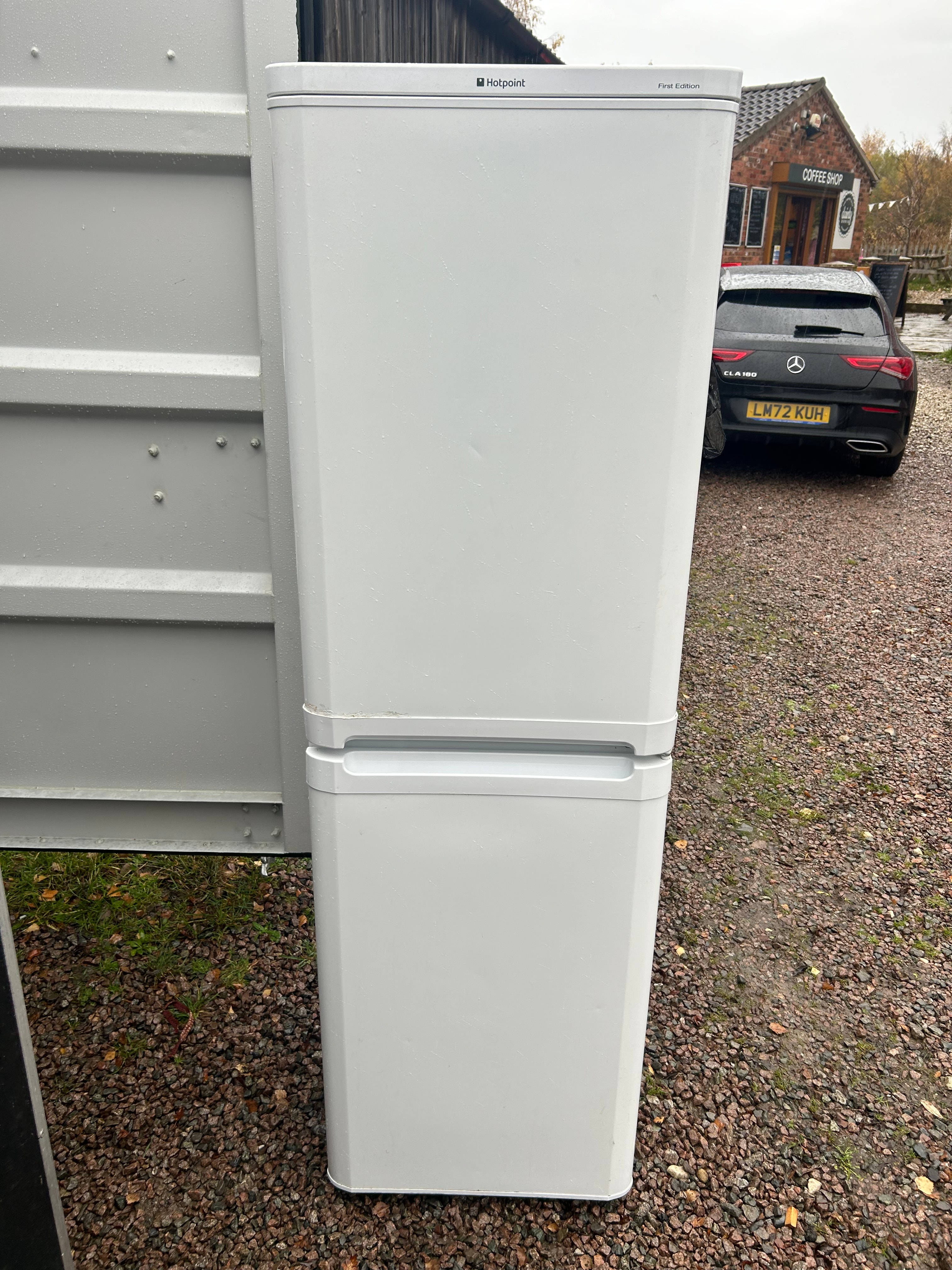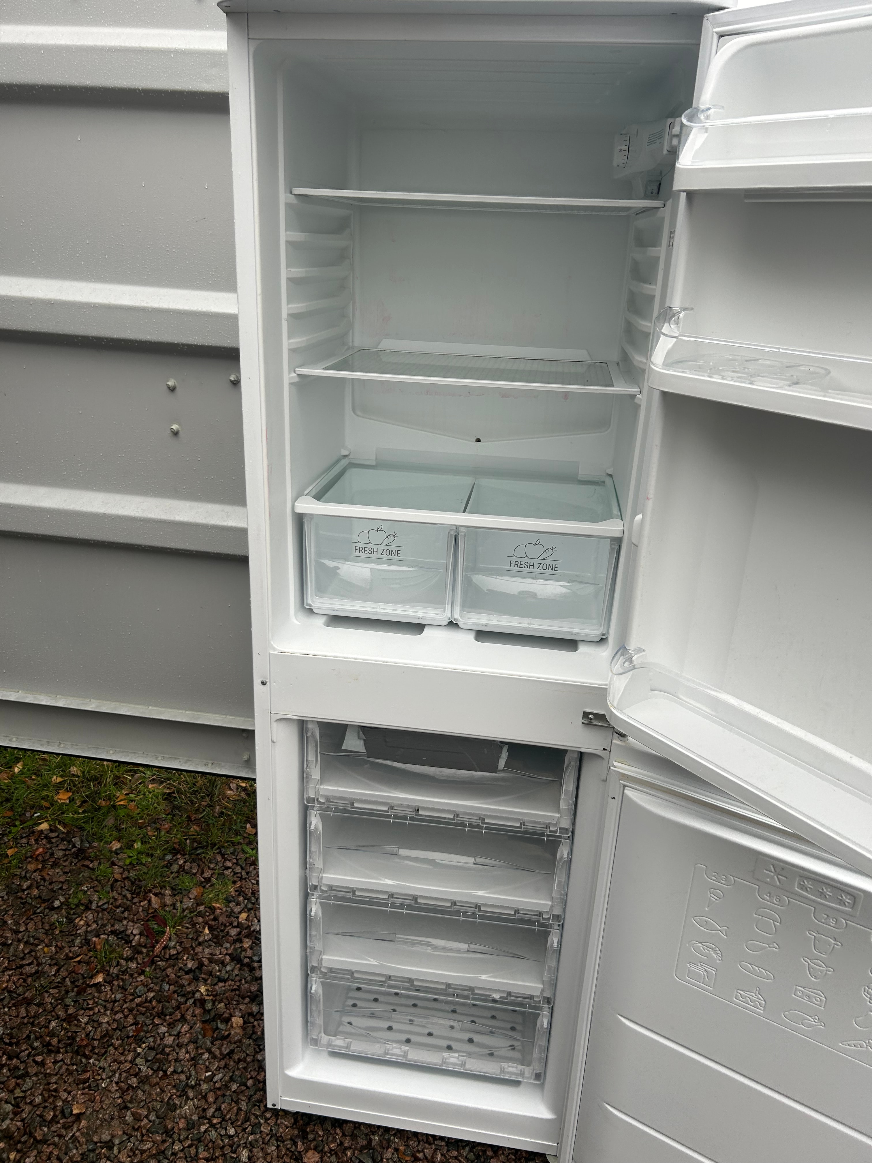 A freestanding refrigerator-freezer combination unit, identified by web intelligence as an Indesit Model IBD5517WUK1, offering approximately 235 litres capacity with a 50/50 split between the refrigerator and freezer sections. This particular example is branded ‘Hotpoint First Edition’ on the exterior. The unit is finished in white enamel or painted metal with complementary plastic trim. The upper refrigerator section features glass shelves and two clear plastic ‘FRESH ZONE’ crisper drawers. The lower freezer section contains multiple clear plastic storage drawers. The interior appears generally clean and complete.