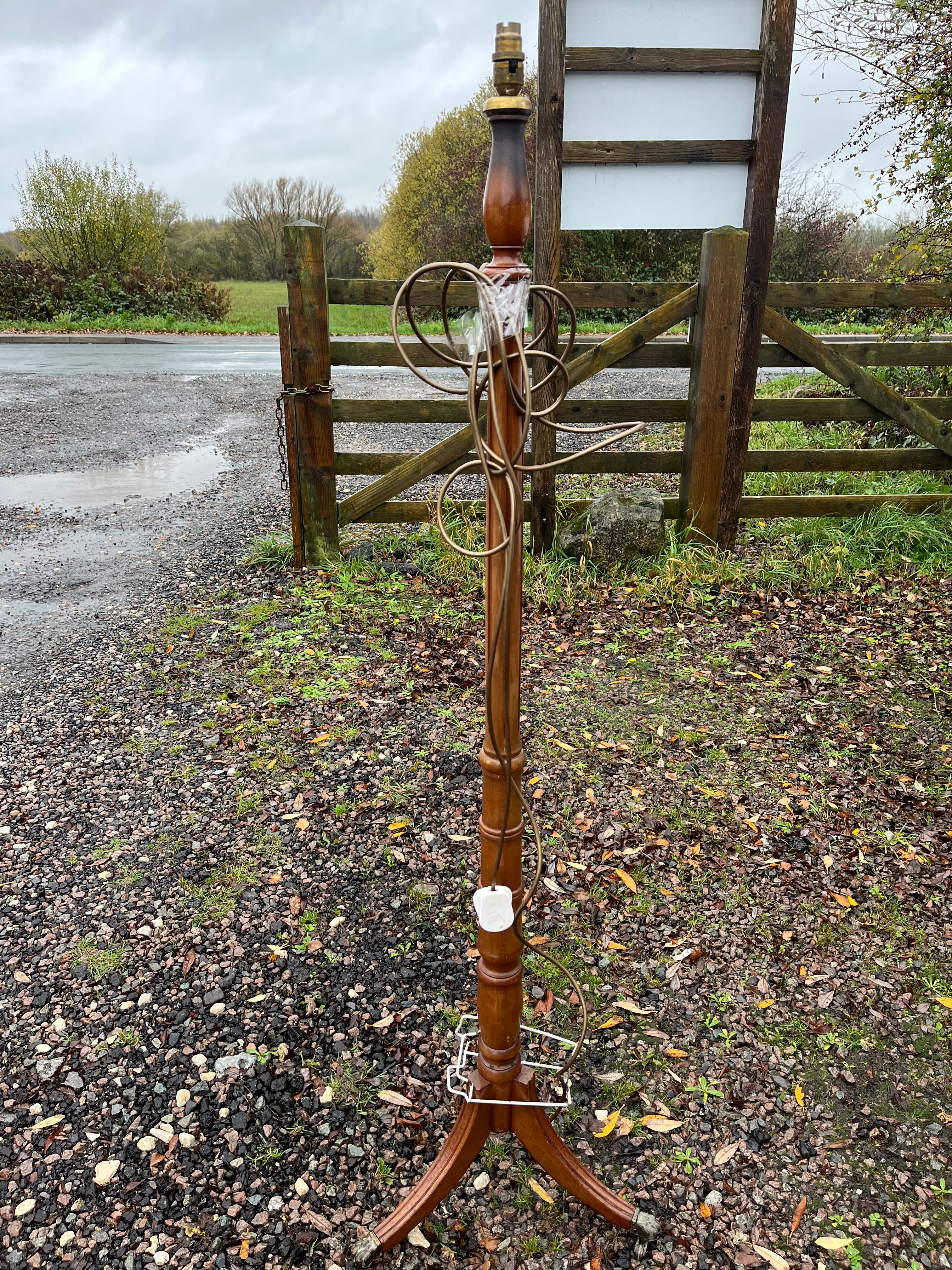 A traditional-style floor lamp, or standard lamp, featuring a turned wooden central column in a reddish-brown tone, likely a hardwood such as mahogany. It is supported by a tripod base with reeded legs terminating in brass-toned metal claw feet. The lamp is fitted with a brass-toned electrical lamp holder at the top, currently accompanied by a coiled electrical flex and a white plastic plug. A small white metal rack is present near the base.