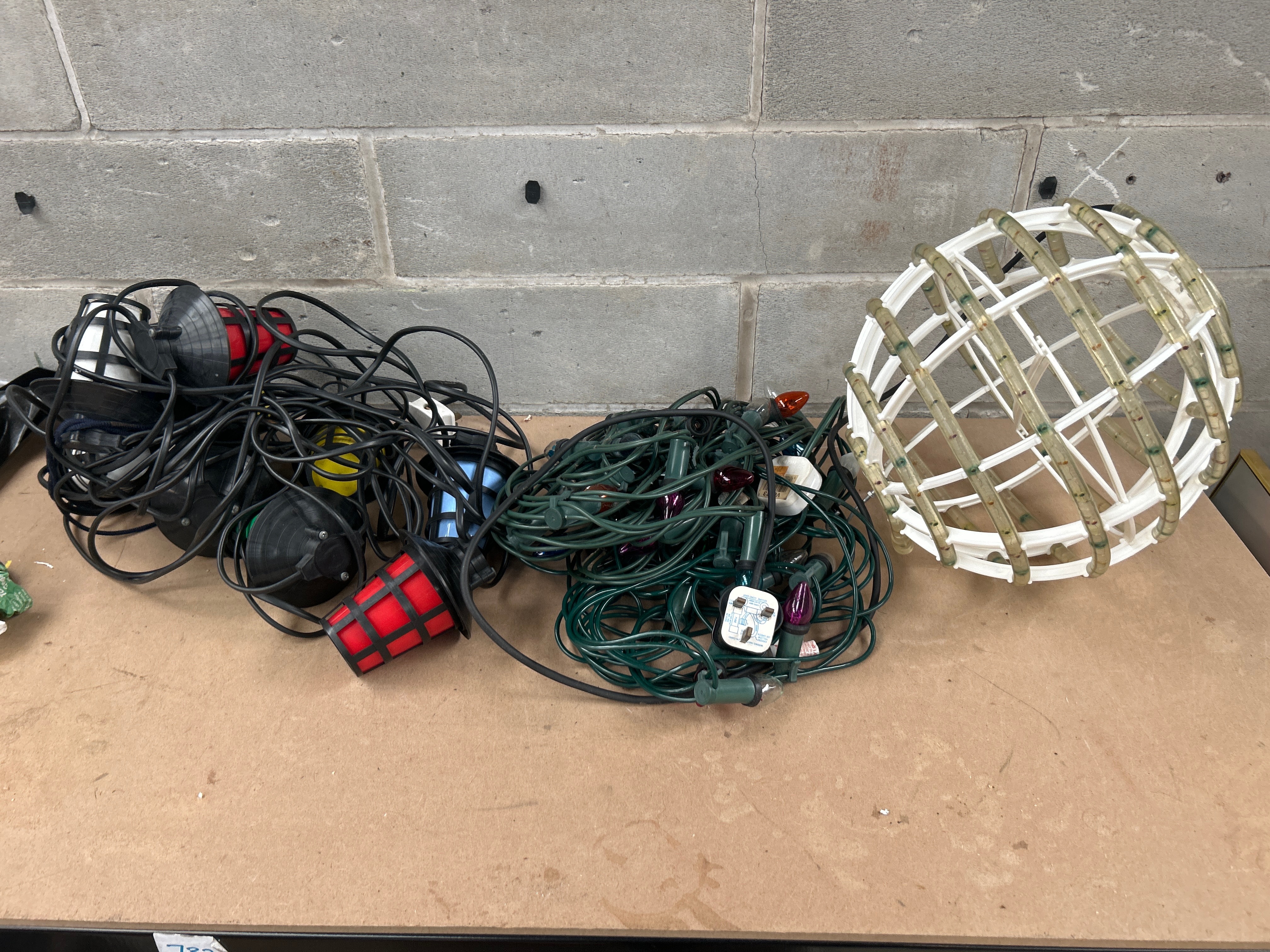 A varied collection of modern electrical lighting items, primarily constructed from plastic and electrical components. The lot comprises a group of approximately six industrial or utility-style lights, each featuring black cords and individual caged bulb housings in varied colors including red, white, blue, and yellow. Also included is a collection of decorative string lights with green cords and multi-colored bulbs. One strand is fitted with a UK-style three-pin plug, while another plug bears partial text “V 23” and a “WARNING: DO NOT…” label. These string lights align with market descriptions of ‘Vintage Christmas Lights’. The third distinct item is a large white plastic spherical lattice frame, approximately 18-24 inches in diameter, fitted with clear plastic tubing containing numerous small lights, suggesting a decorative light globe. All items are presented in a loose and tangled state.