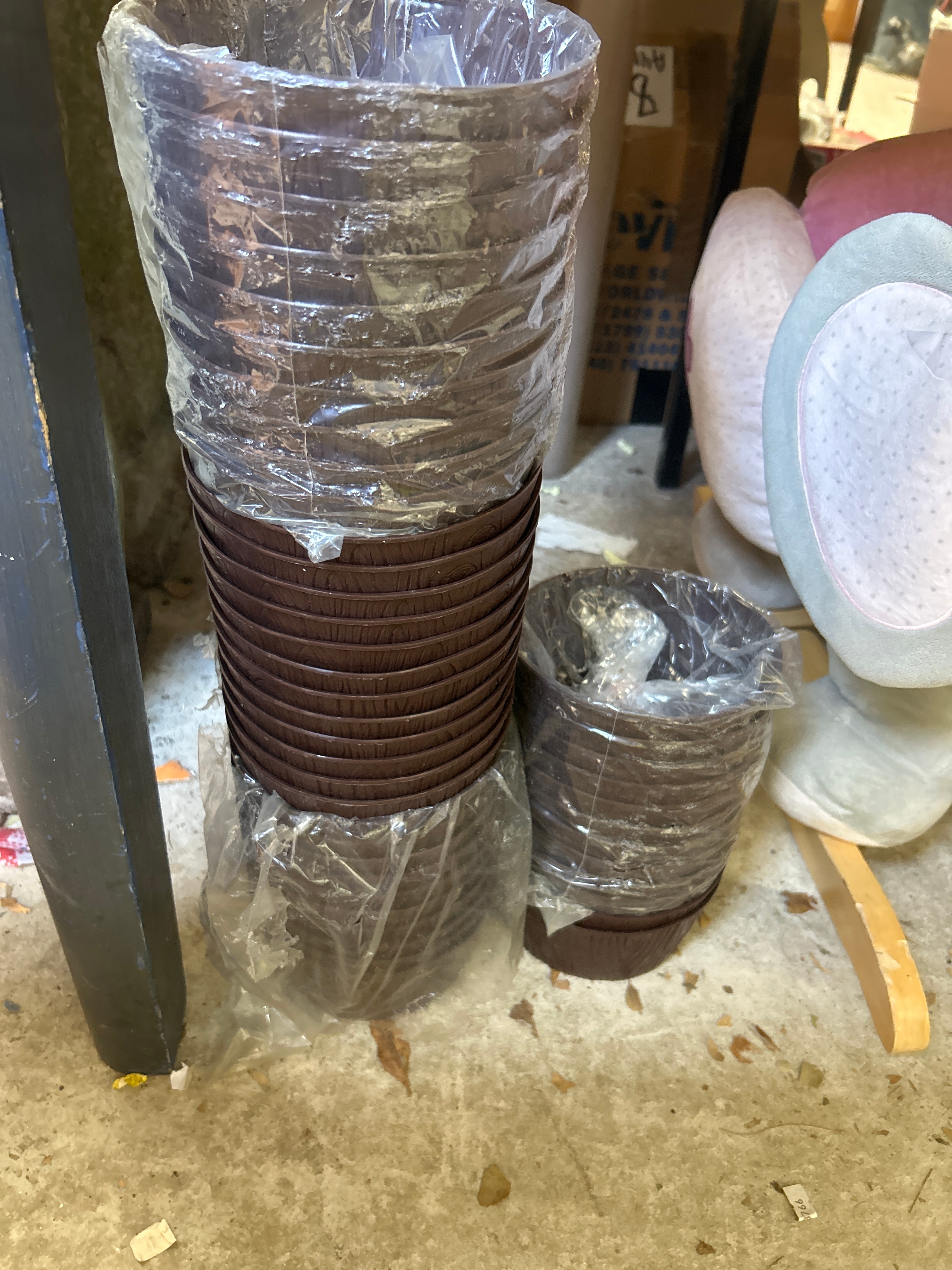 A group of multiple stacks of dark brown, ribbed plastic containers, appearing to be plant pots or planters. Each stack is individually wrapped or bundled in clear plastic film. The containers feature a textured, possibly wood-grain inspired, exterior with a slightly flared rim, and a subtle embossed circular motif is discernible on some units.