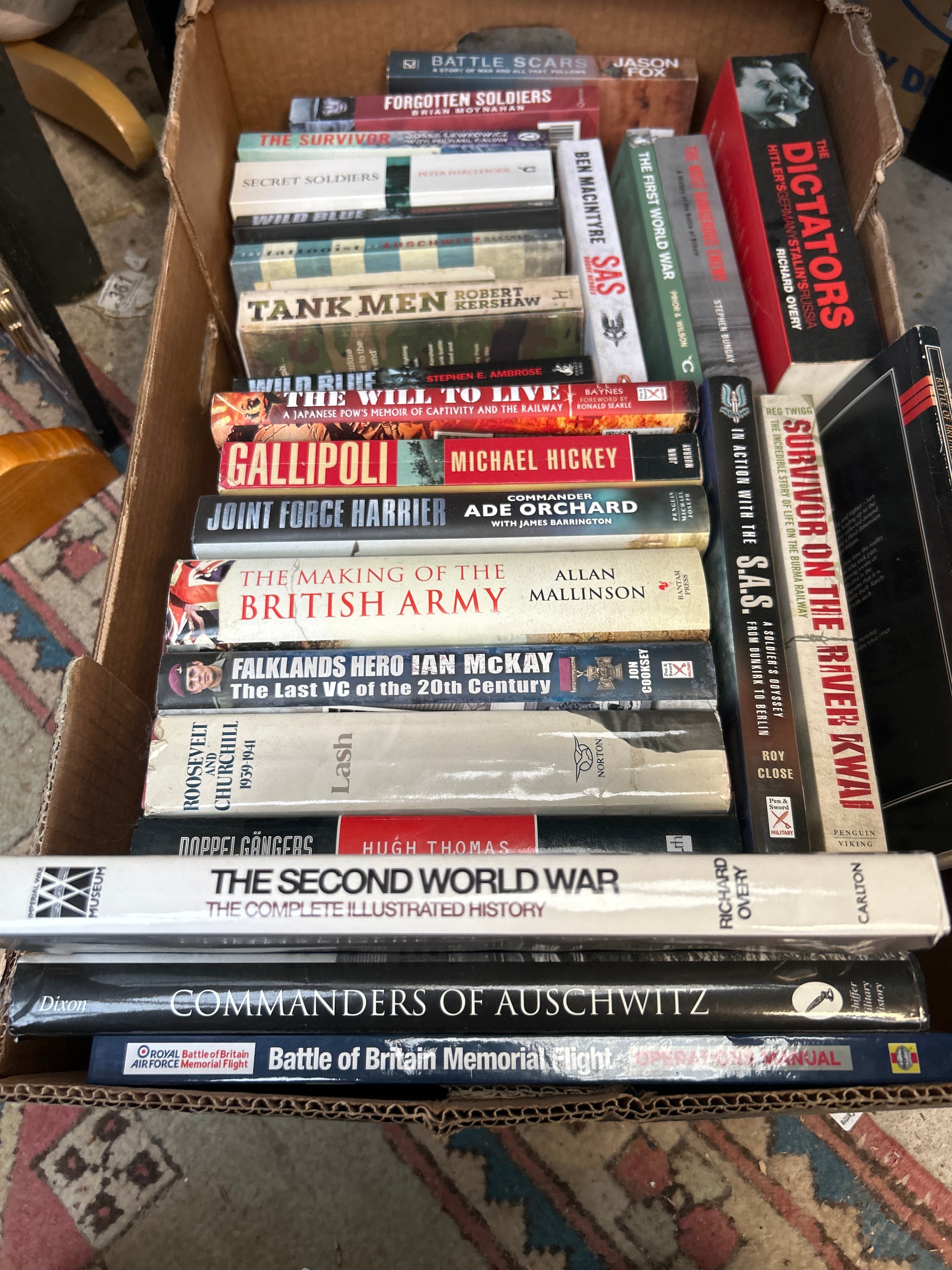A collection of approximately two dozen English-language non-fiction books, predominantly hardcovers with some softcovers, focused largely on military history, biographies, and significant historical events from the 20th century, including World War I and II, and later conflicts. Visible titles include “The Second World War” by Richard Overy, “The Dictators,” “Commanders of Auschwitz,” “The First World War,” “Gallipoli,” “Tank Men,” “Falklands Hero Ian McKay,” and several relating to “SAS” and special forces operations. Authors such as Stephen E. Ambrose, Ben Macintyre, and Michael Hickey are noted, with publishers like Penguin, Osprey, and Carlton visible.