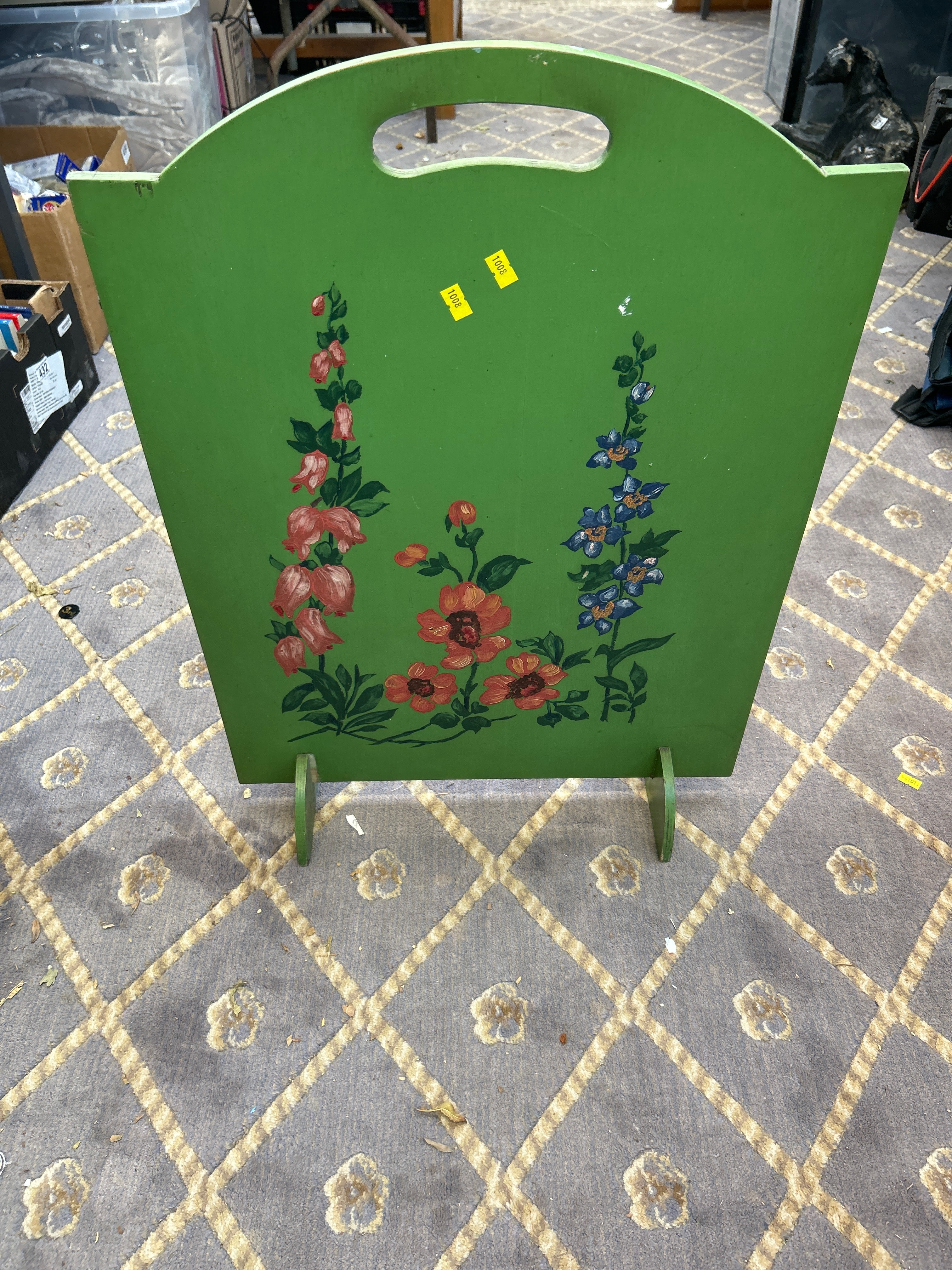 A freestanding decorative screen or panel, likely constructed from painted wood or a wood-composite material, featuring a vibrant green finish. The rectangular panel has a curved top edge with an integrated oval handle cutout and is supported by two small, rounded feet at its base. The front surface is adorned with a hand-painted floral motif in a folk art or vintage style, depicting vertical arrangements of reddish-orange bell-shaped flowers on the left and blue blossoms on the right, complemented by smaller reddish-orange flowers at the bottom center, all with green foliage. Two yellow stickers, each marked “1008”, are applied to the upper central area, and a faint, indistinct marking is visible near the top left corner.