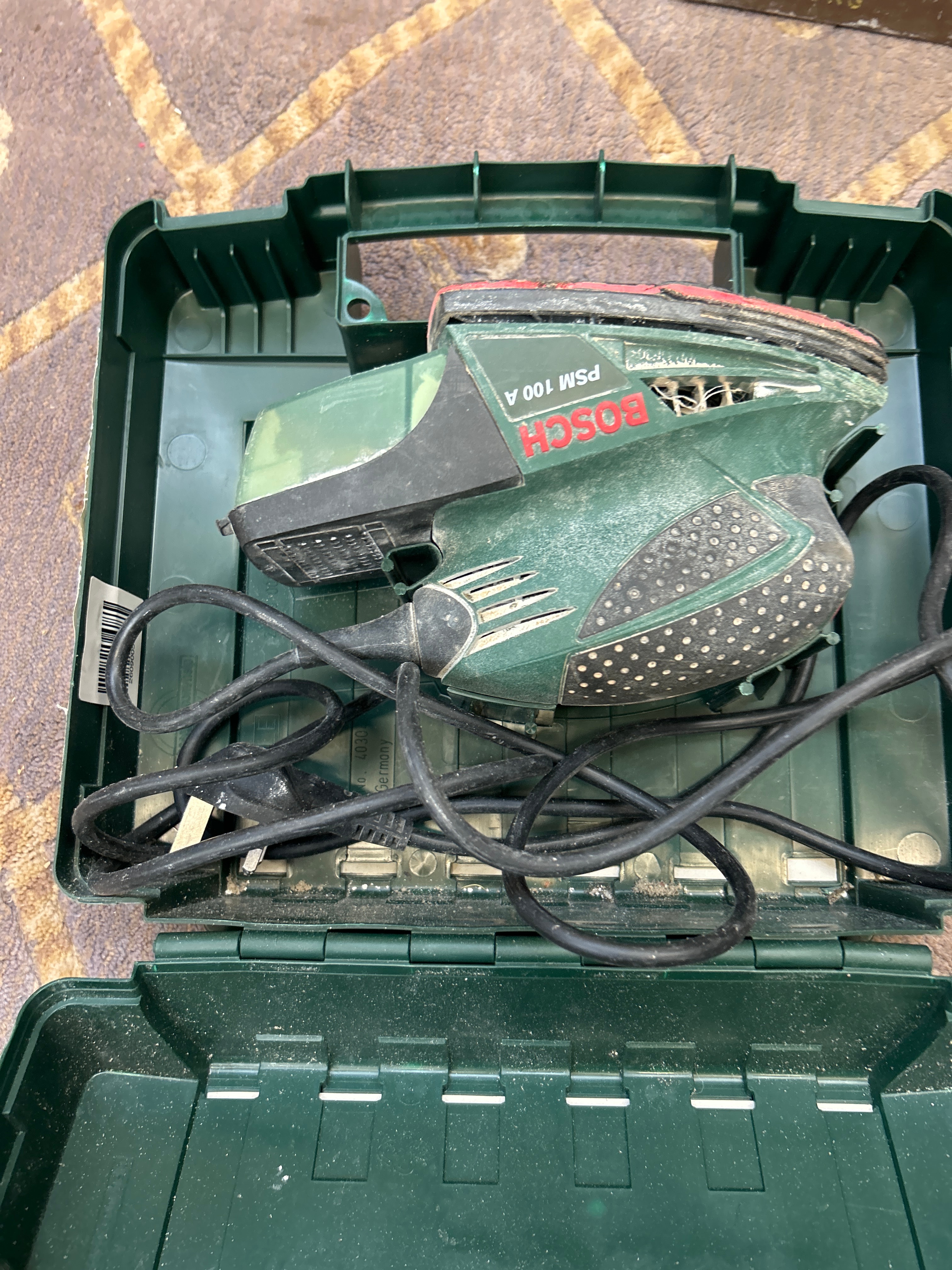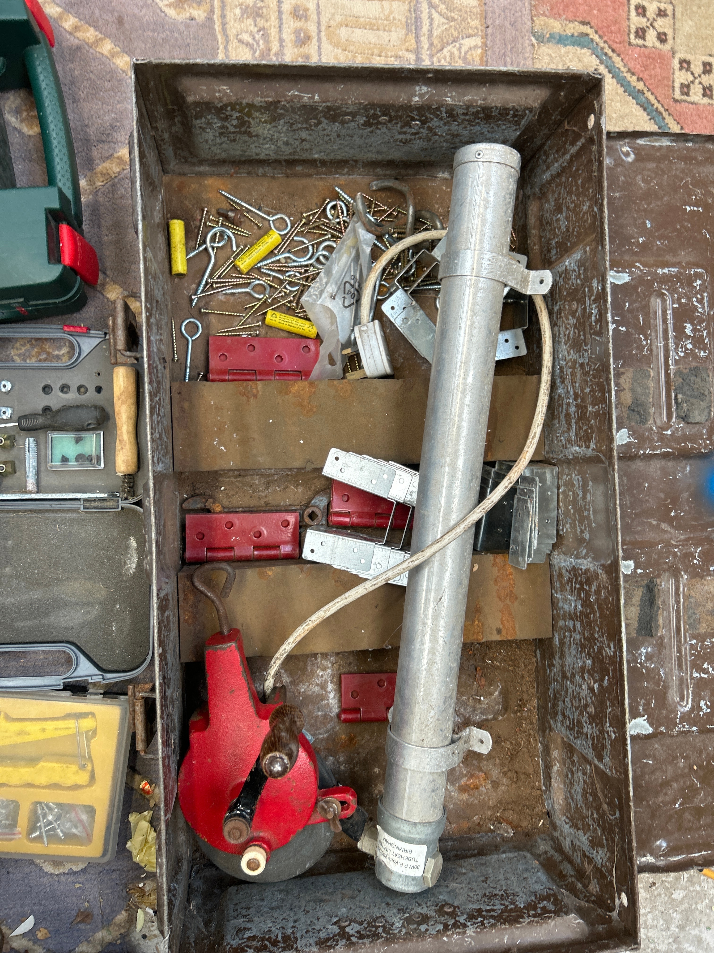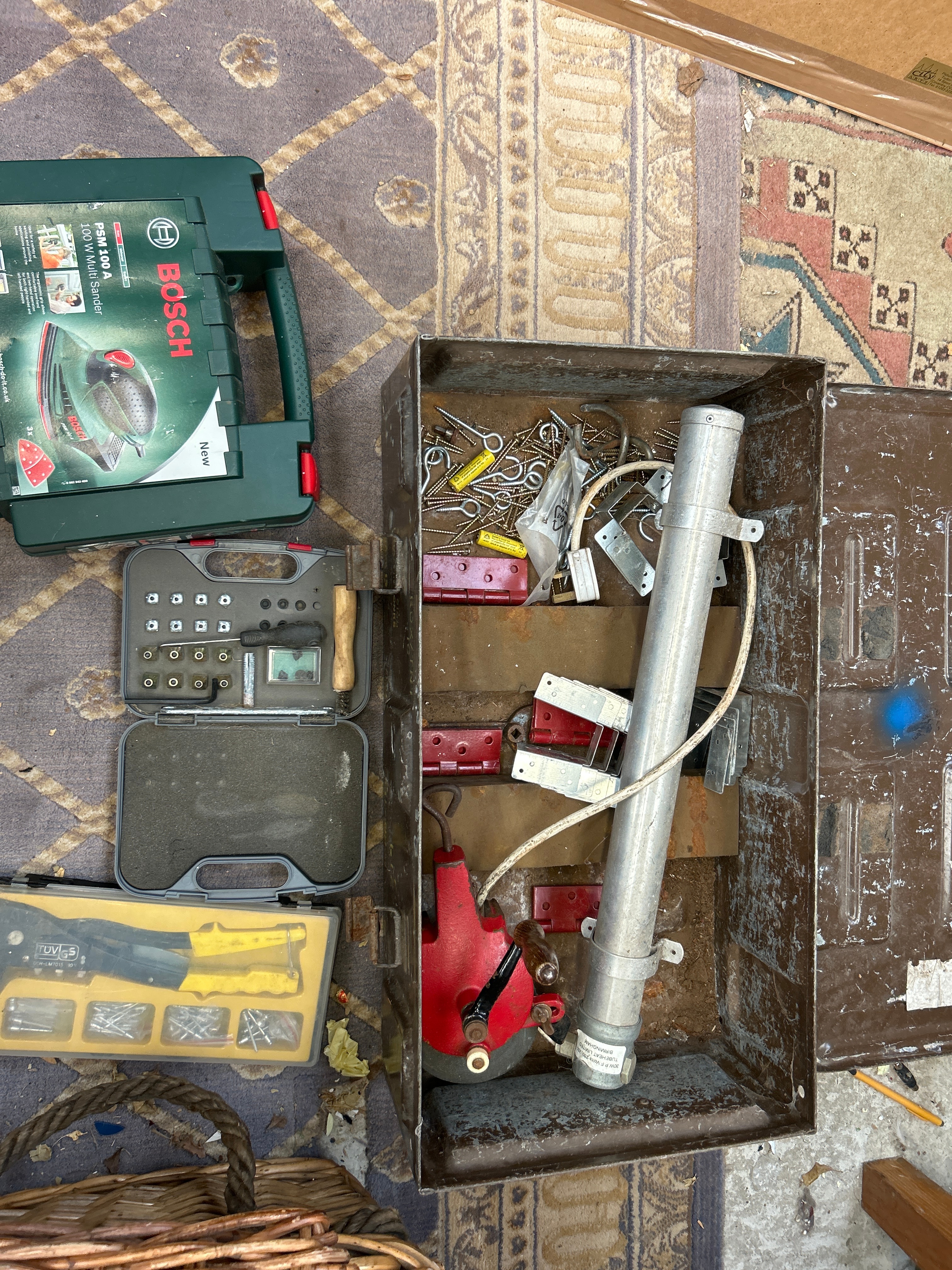 A robust, dark brown metal storage crate, stenciled “30MM CANNS”, “RDDTNT/XTNT 1C”, and “3154.0 MHB-4-2,” indicative of a military-issue ammunition can. Contained within the crate is a silver cylindrical component, identified by a label with “Betriebstemperatur -40C bis +60C” (Operating temperature -40C to +60C), “Maximale Windgeschwindigkeit 30m/s” (Maximum wind speed 30m/s), and an “IP67” rating, suggesting an outdoor-rated mechanical or electronic component. Also present are a red hand-cranked mechanical device, various metal brackets, and an assortment of screws and wall plugs. Adjacent to the crate is a Bosch PSM 100 A 100W Multi-Sander, appearing new in its original green plastic case. The lot further includes a smaller grey plastic tool case filled with assorted bits, and a yellow plastic organizer containing fasteners and a crimping tool.