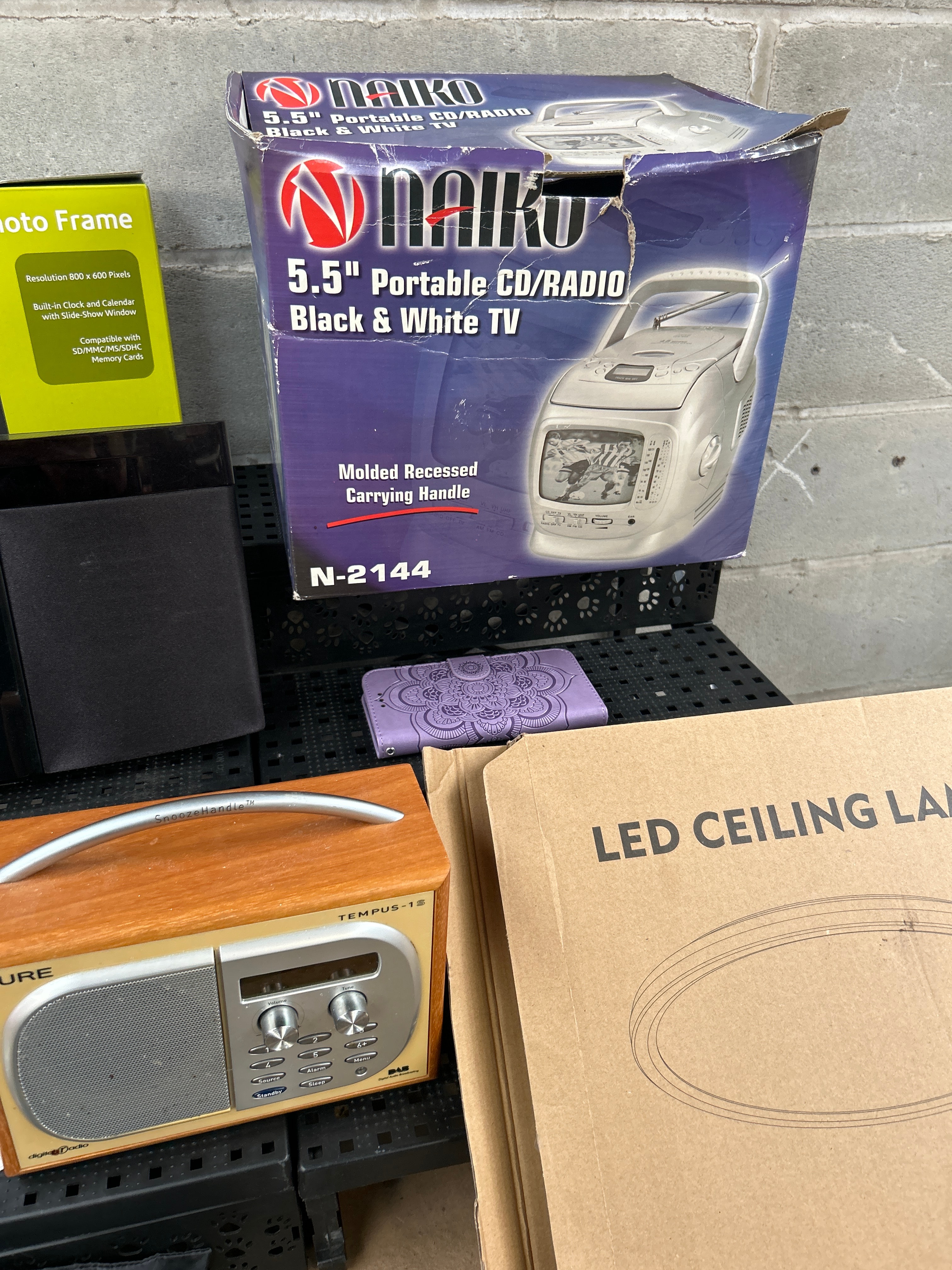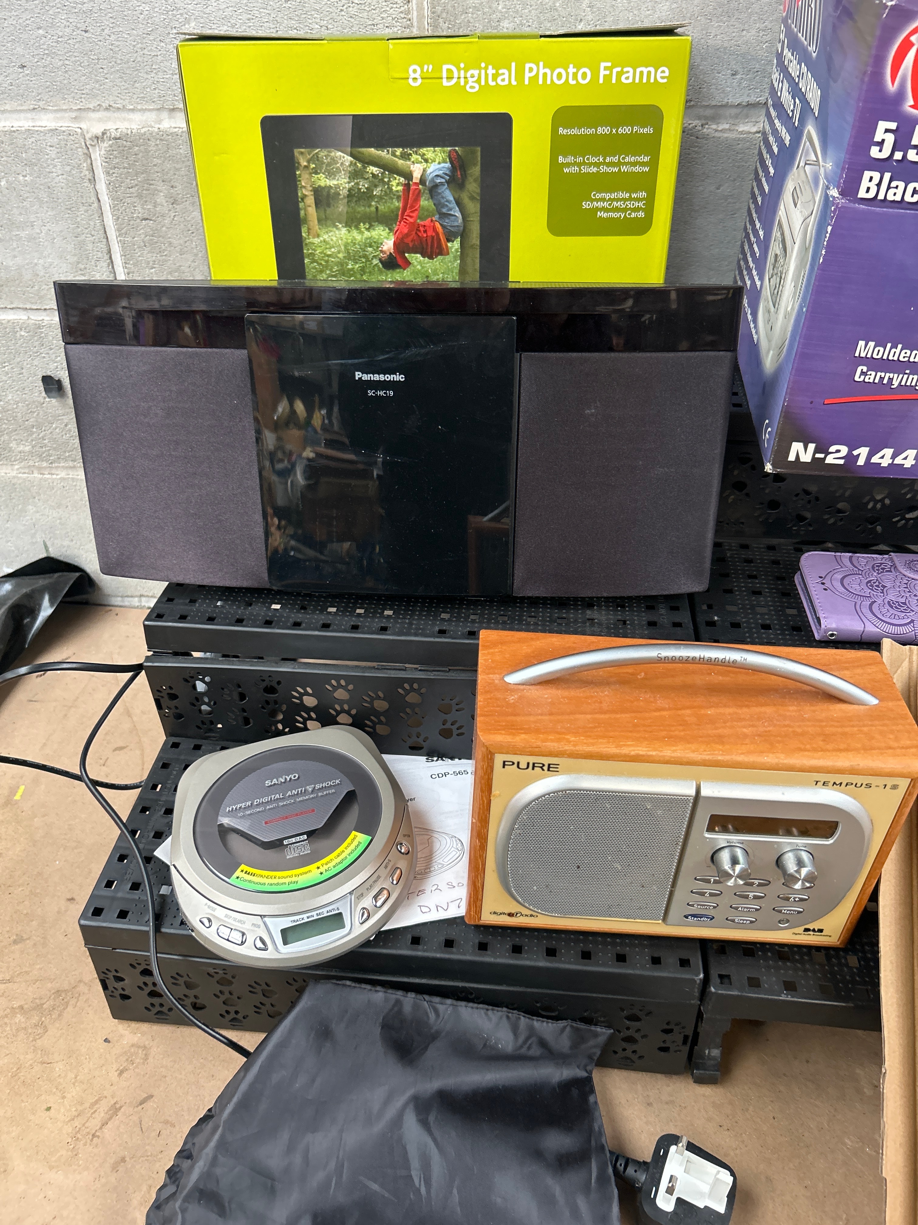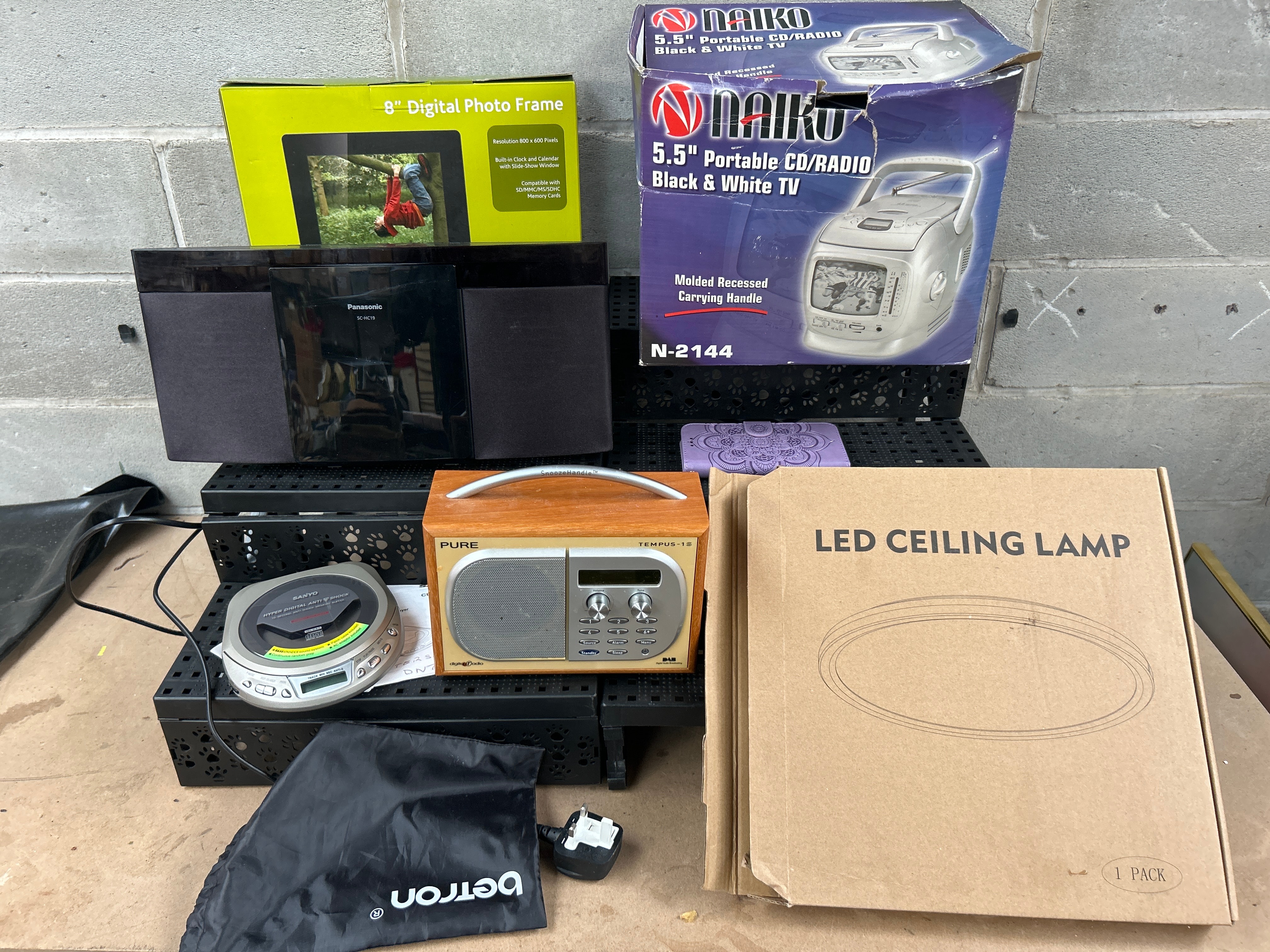 A diverse collection of late 20th to early 21st-century consumer electronic devices and their original packaging. The lot includes an 8″ Digital Photo Frame in its box, a black Panasonic SC-HC19 micro hi-fi system, a silver Sanyo Hyper Digital Anti-Shock portable CD player (model CD-P505), a Pure Tempus-1S DAB radio featuring a wooden housing, and a black “Betron” branded pouch containing a charger. Also present is a Naiko 5.5″ Portable CD/RADIO Black & White TV (model N-2144) in its box, and an “LED CEILING LAMP” in an unopened cardboard box marked “1 PACK.” The primary materials are plastic for most electronics, wood for the Pure radio, and cardboard for packaging.