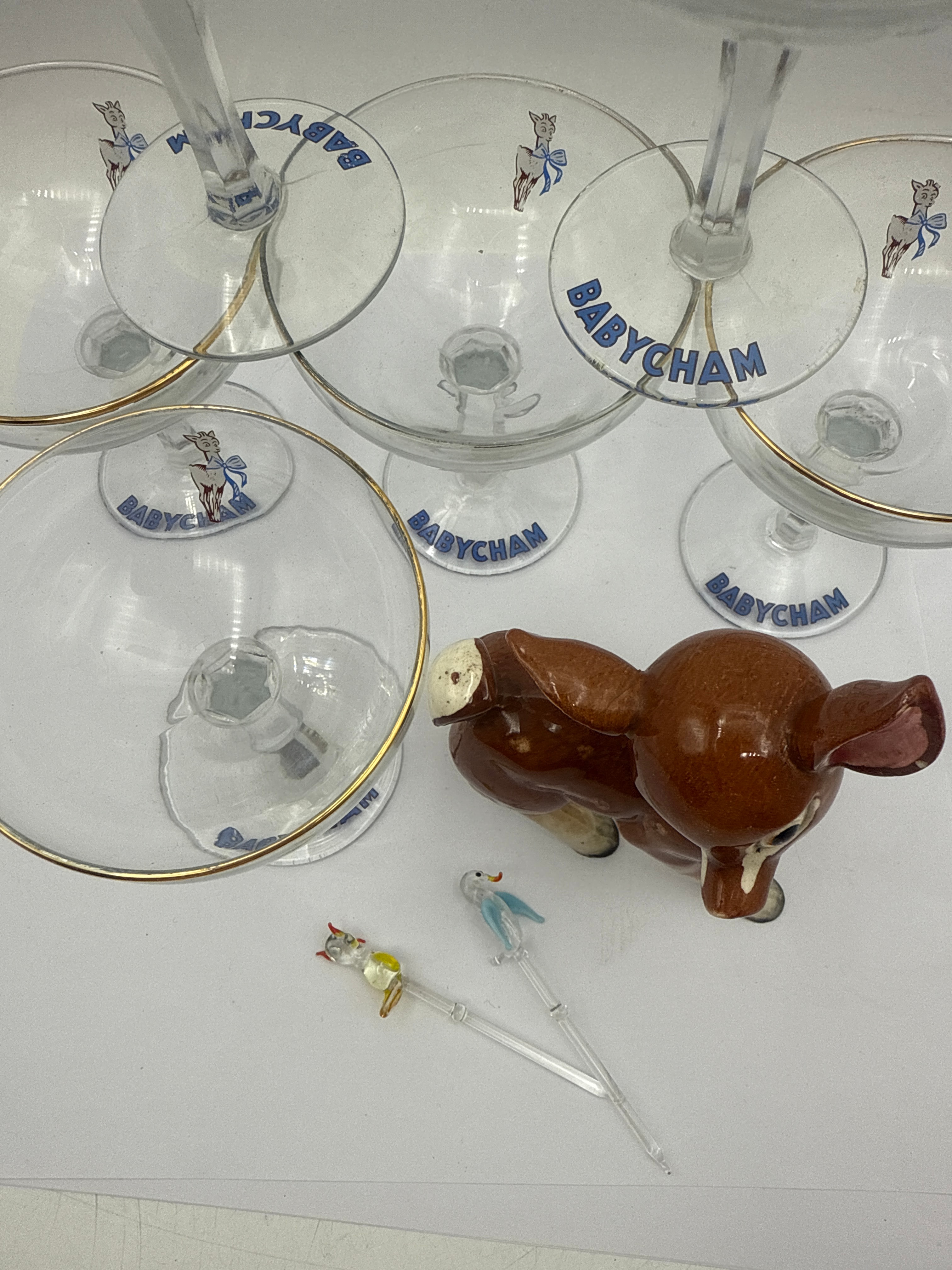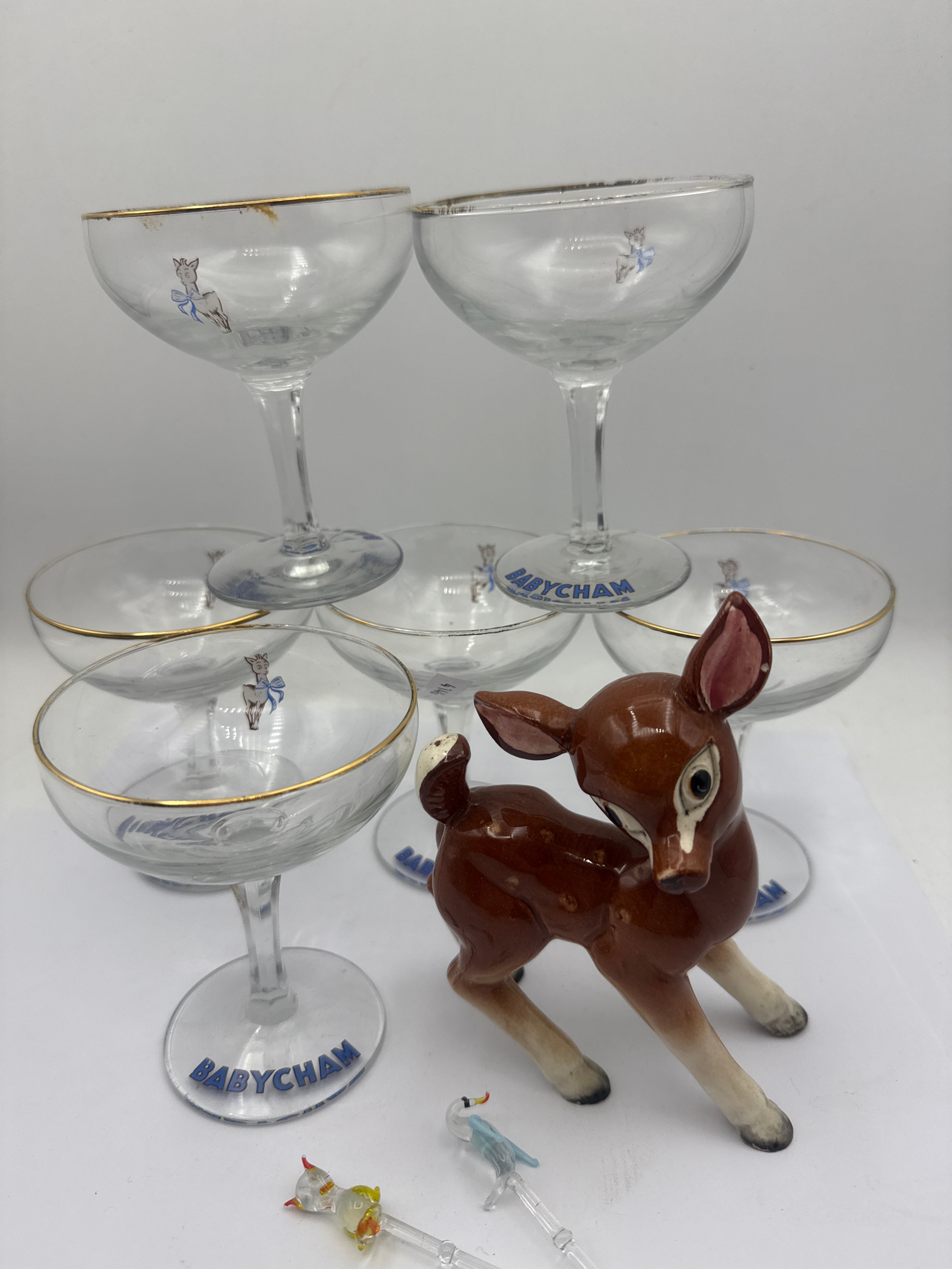 Lot 408: Six Babycham Champagne Glasses, a Fawn Figurine, and Cocktail Picks