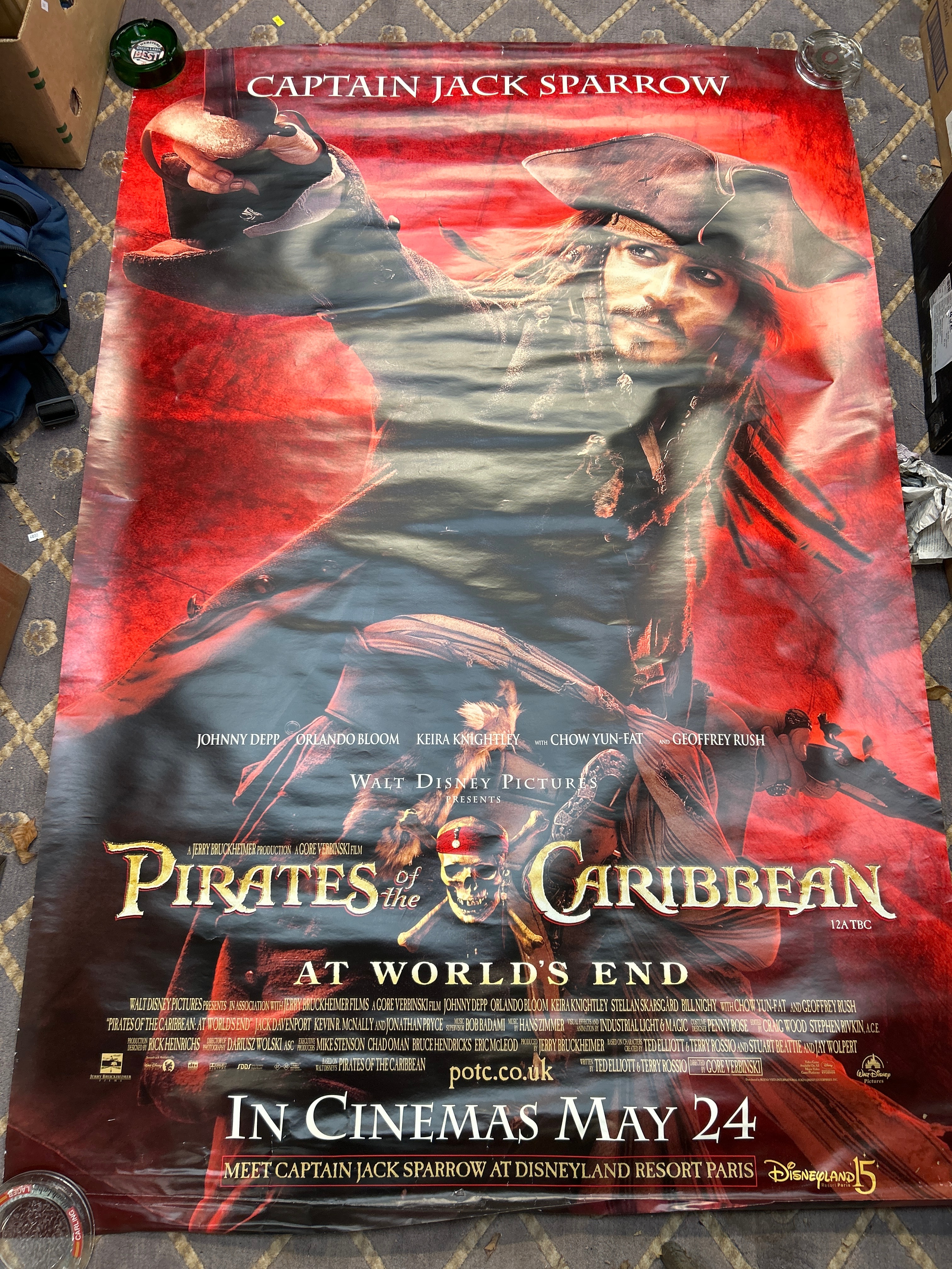 An original promotional movie poster for ‘Pirates of the Caribbean: At World’s End’ (2007). This full-color poster, issued during the film’s theatrical release period around May 2007, features Captain Jack Sparrow against a red background. It includes the “IN CINEMAS MAY 24” release date, the “Disneyland 15 Resort Paris” logo, and credits for actors Johnny Depp, Orlando Bloom, Keira Knightley, Chow Yun-Fat, and Geoffrey Rush. Further text identifies the main title, “CAPTAIN JACK SPARROW,” “WALT DISNEY PICTURES PRESENTS,” “A JERRY BRUCKHEIMER PRODUCTION,” a “12A TBC” rating, the website “potc.co.uk,” and extensive film credits. The poster is printed on glossy paper or lightweight cardstock.