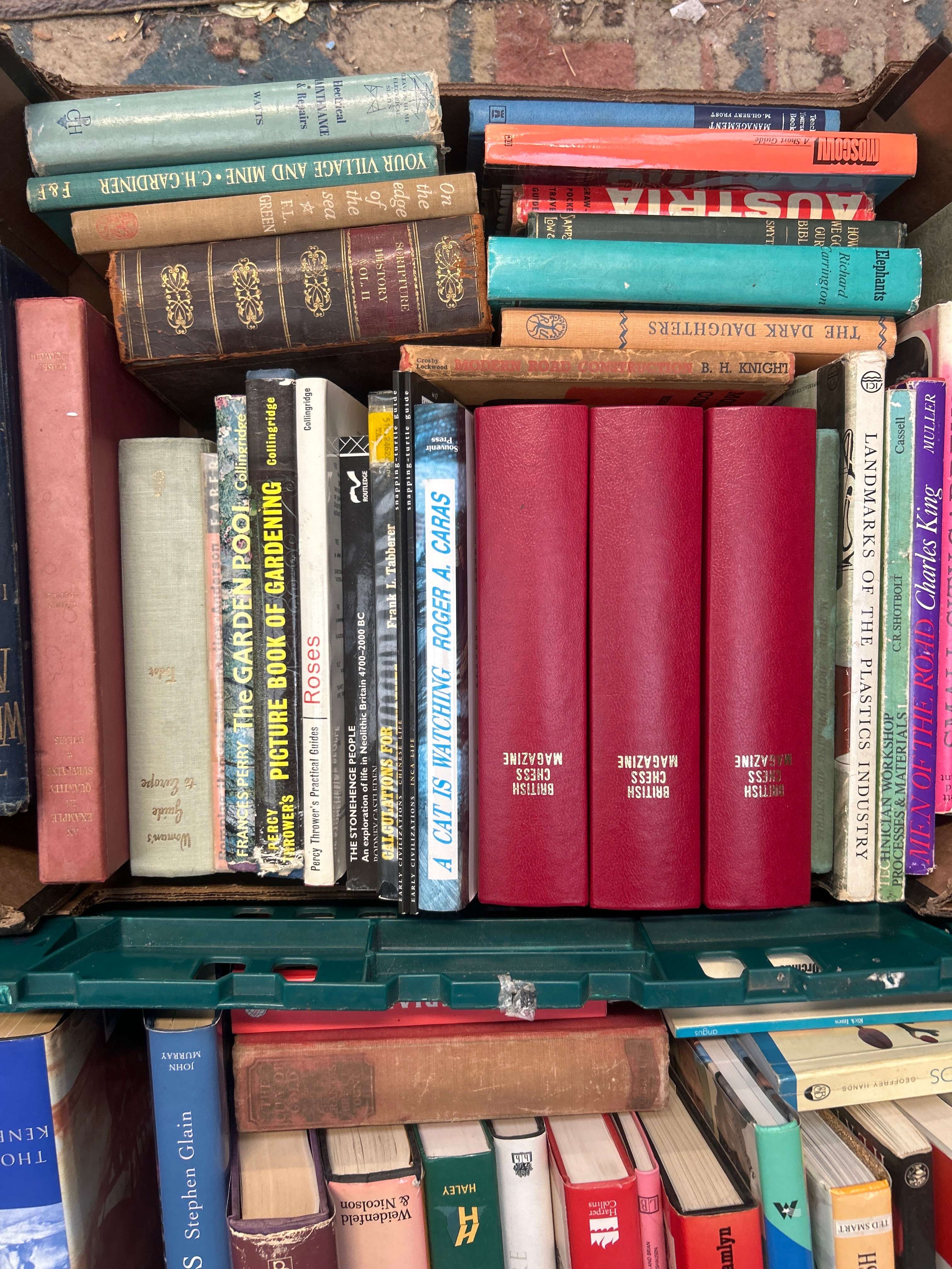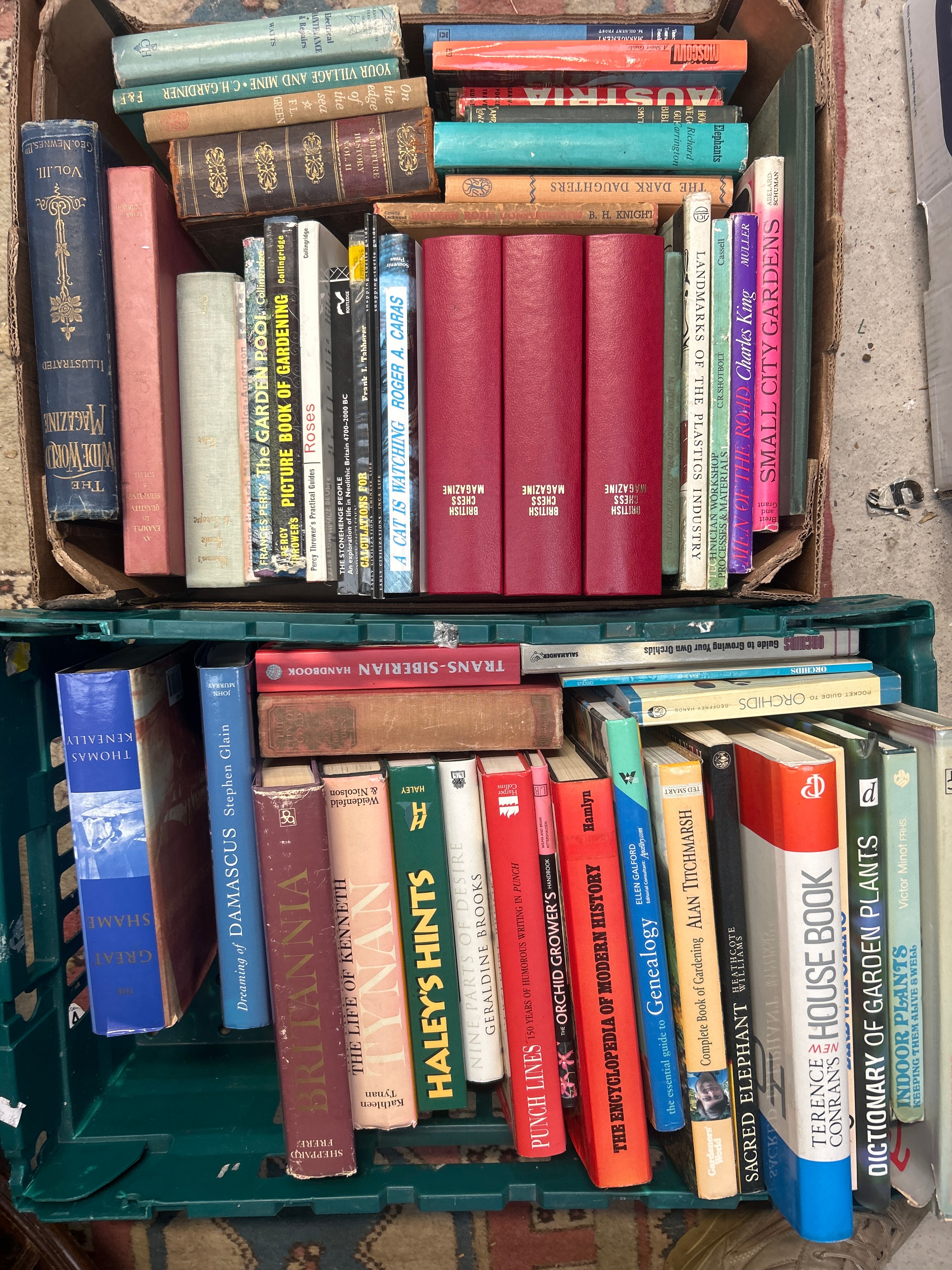 A diverse collection of books presented in one cardboard crate and one green plastic crate. The collection comprises primarily hardcover volumes with various cloth, paper, and embossed bindings, alongside some softcover books. Subjects covered are eclectic and include gardening (e.g., “The Garden Pool,” “Picture Book of Gardening,” “Complete Book of Gardening,” “Dictionary of Garden Plants,” “Indoor Plants,” “Orchids”), history (e.g., “The Encyclopedia of Modern History,” “Britannia,” “Your Village and Mine”), geography (e.g., “Austria,” “Trans-Siberian Handbook,” “Damascus”), natural history (e.g., “A Cat Is Watching”), biographies (e.g., “The Life of Kenneth Grahame”), and specialized topics such as “British Chess Magazine” (three uniform red spines visible) and “Landmarks of the Plastics Industry.” Visible authors include Roger A. Caras, Alan Titchmarsh, Stephen Glain, and John Murray. Bindings range in period from older ornate designs to more contemporary plain and pictorial covers.