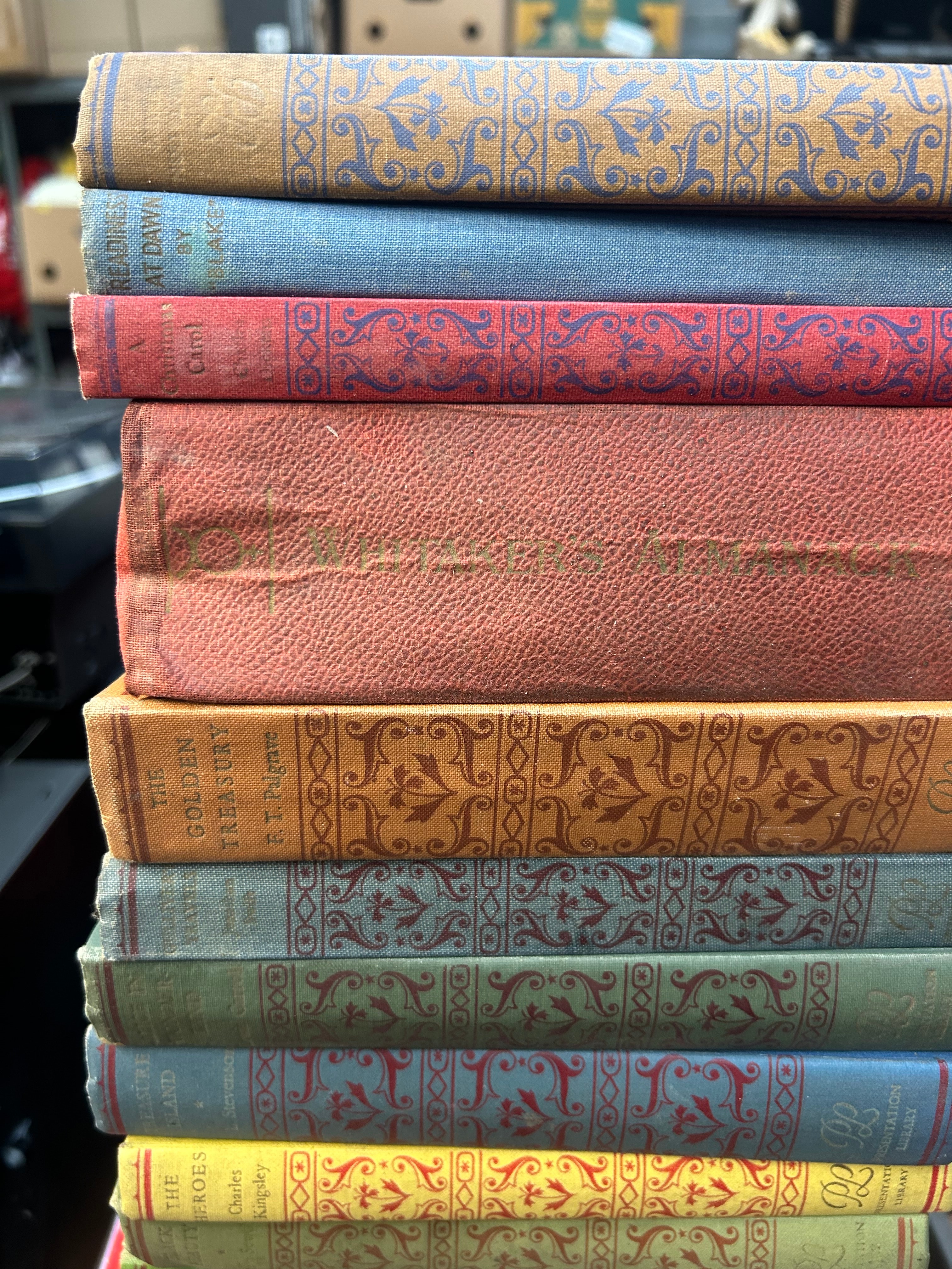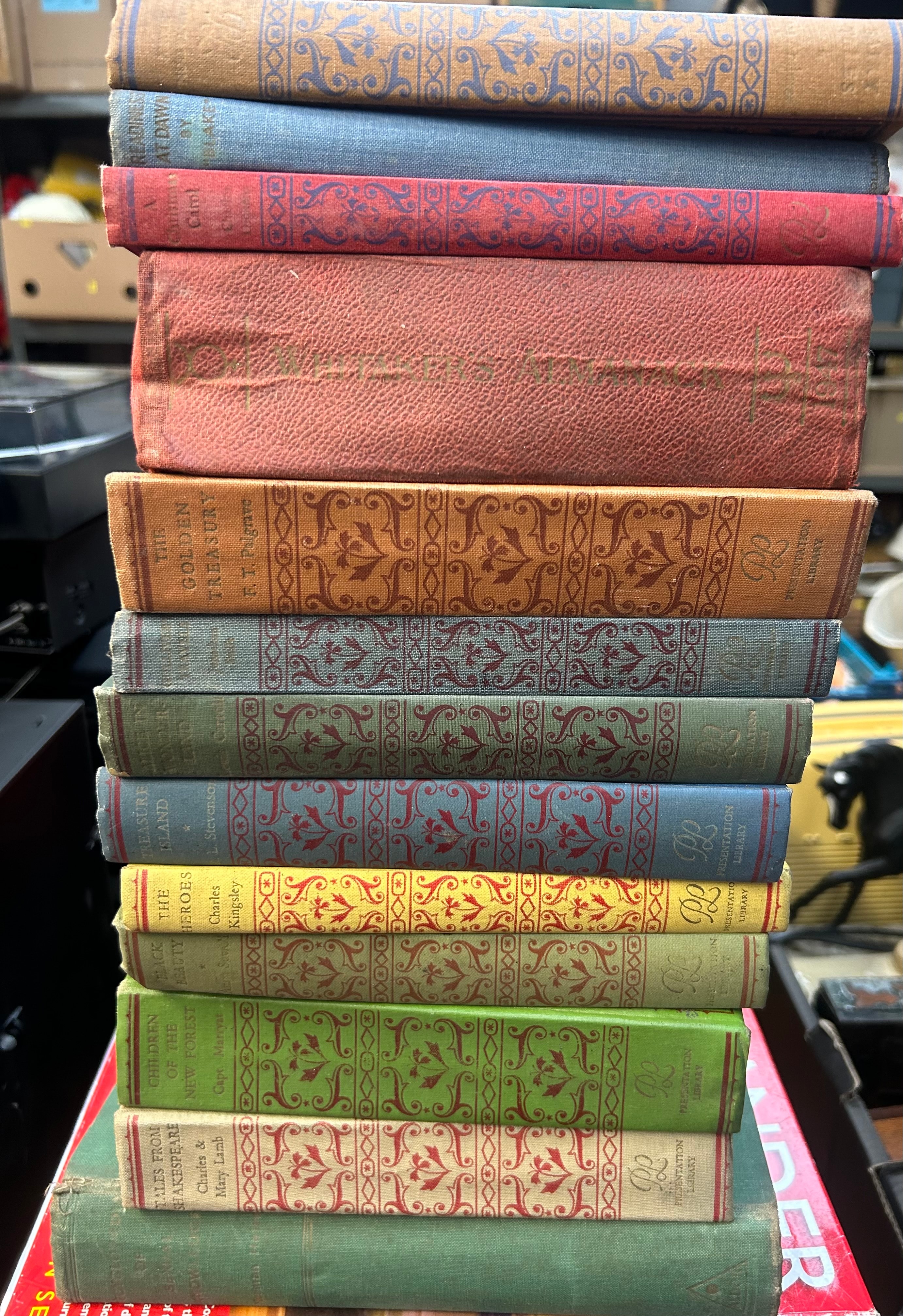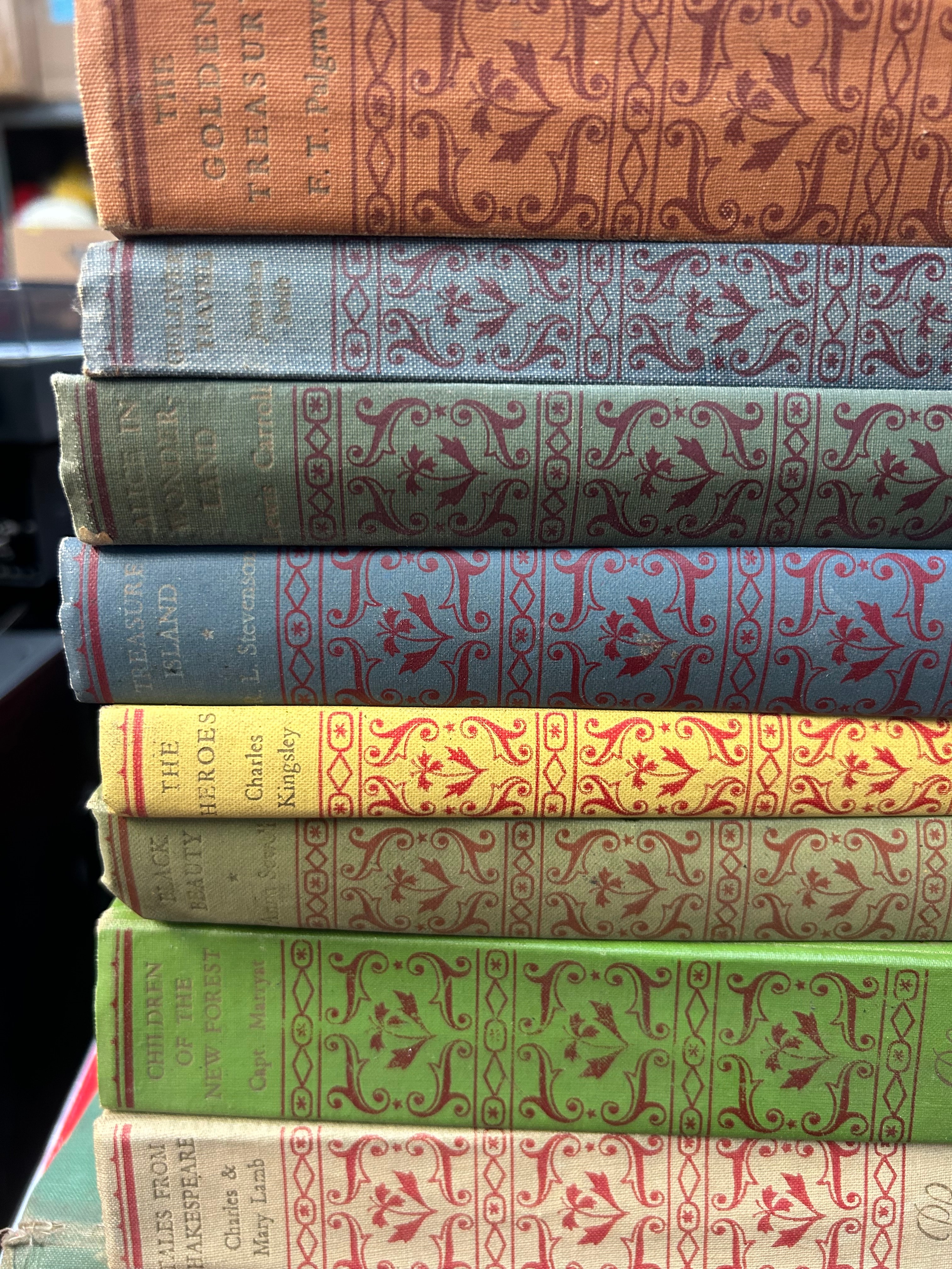 A collection of thirteen volumes from the Everyman’s Library series, published by J. M. Dent and Sons. Each volume is cloth-bound hardcover, likely dating from the late 19th to early 20th century, consistent with publisher’s decorative series bindings. The books feature distinct colors (brown, blue, red, green, orange, yellow) and intricately patterned spines, some with gilt or embossed details. Visible titles and authors include “The Golden Treasury” by F. T. Palgrave, “Little Women” by L. M. Alcott, “Alice in Wonderland” by L. Carroll, “Treasure Island” by R. L. Stevenson, “The Heroes” by Charles Kingsley, “Black Beauty” by A. Sewell, “Children of the New Forest” by Capt. Marryat, and “Tales From Shakespeare” by Charles & Mary Lamb.