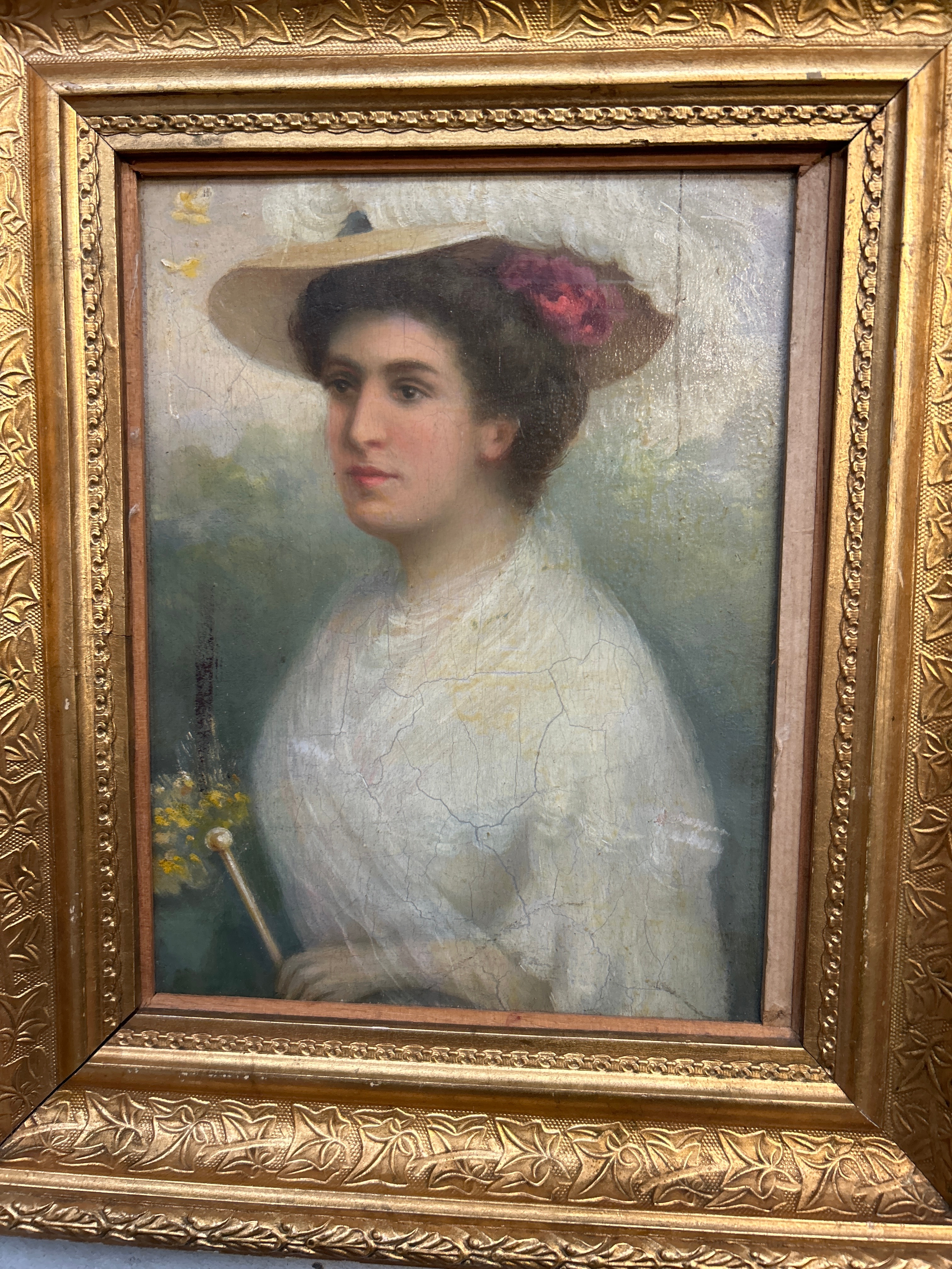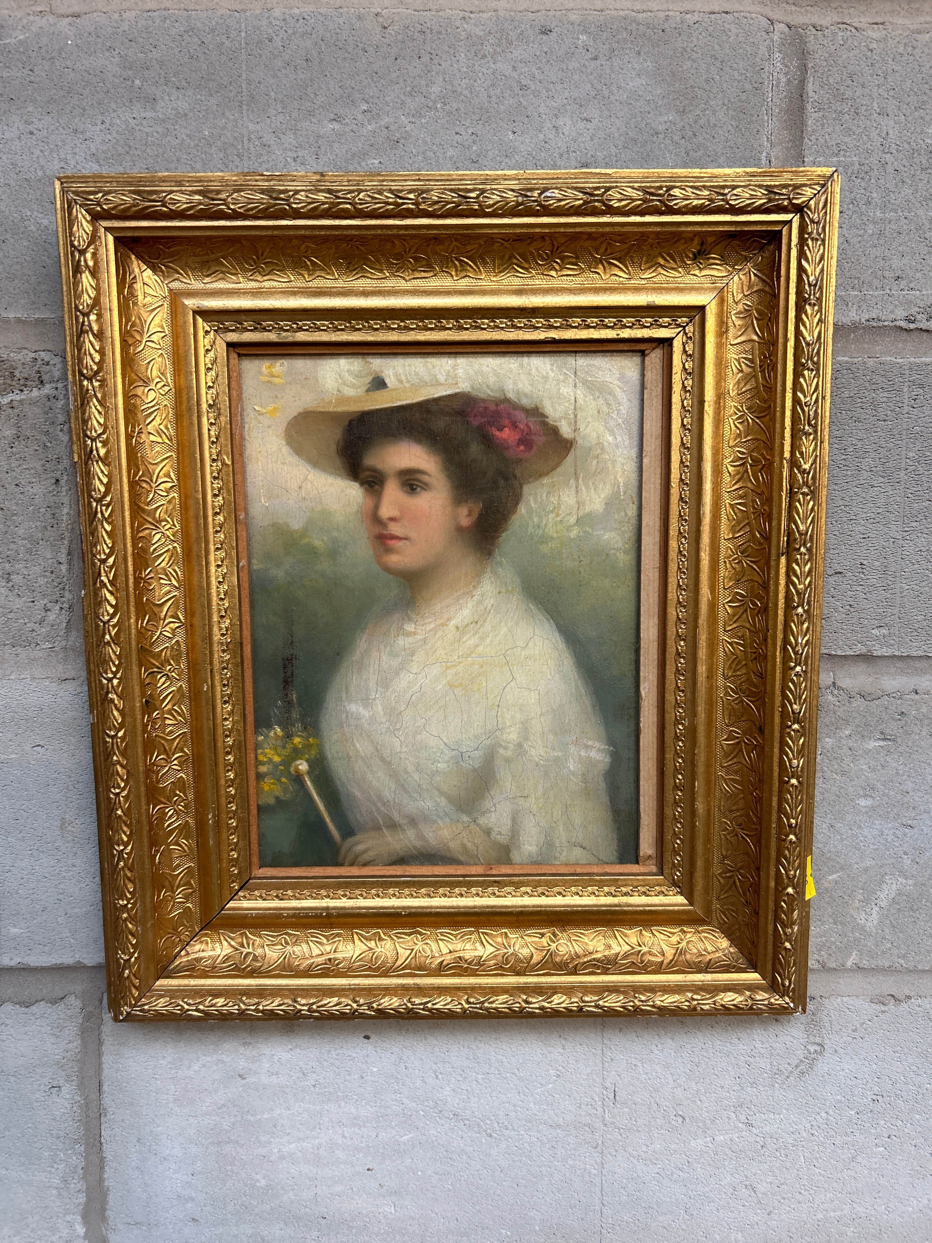 An early 20th-century oil on canvas portrait depicting a half-length young woman in an academic or traditional style. The subject wears a wide-brimmed hat adorned with feathers and a reddish floral element, a light-colored ruffled garment, and holds a small bouquet of yellow flowers. The painting is housed in an ornate giltwood frame featuring repetitive leaf and scroll motifs. No visible artist’s signature or other markings are discernible from the front.