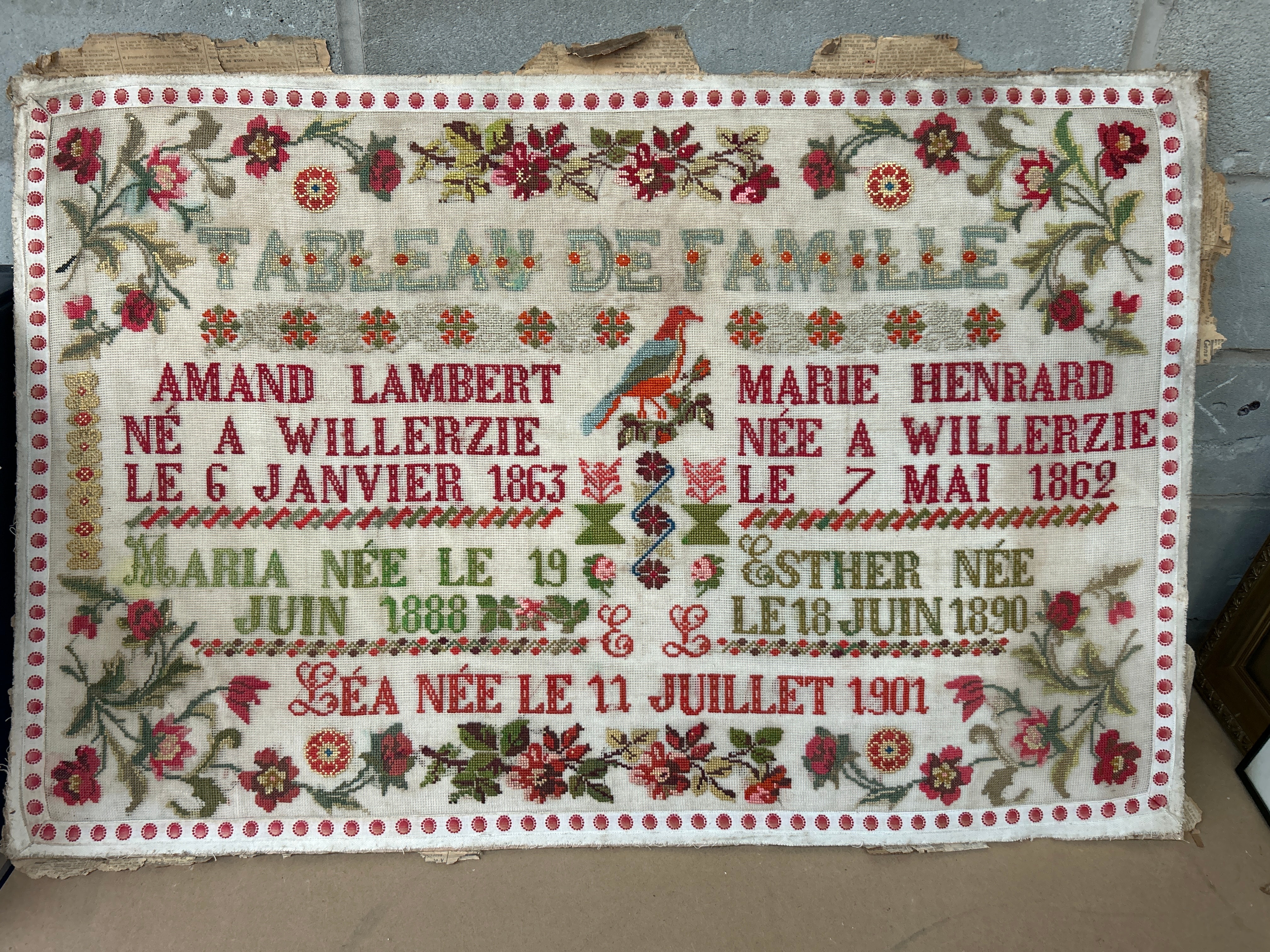 This folk art embroidered textile, identified as a “Tableau de Famille” (Family Picture/Record), is executed in cross-stitch on a cream-colored linen or cotton ground using multi-colored wool or silk threads. The central French text details birth information for Amand Lambert, born January 6, 1863, in Willerzie, and Marie Henrard, born May 7, 1862, also in Willerzie. Their children’s birth dates are also recorded: Maria, born June 19, 1888; Esther, born June 18, 1890; and Léa, born July 11, 1901. The composition features floral motifs flanking the central text, a vibrant central bird motif, and a decorative border of stylized floral elements in red, green, and gold tones, accented by a continuous red circular pattern.