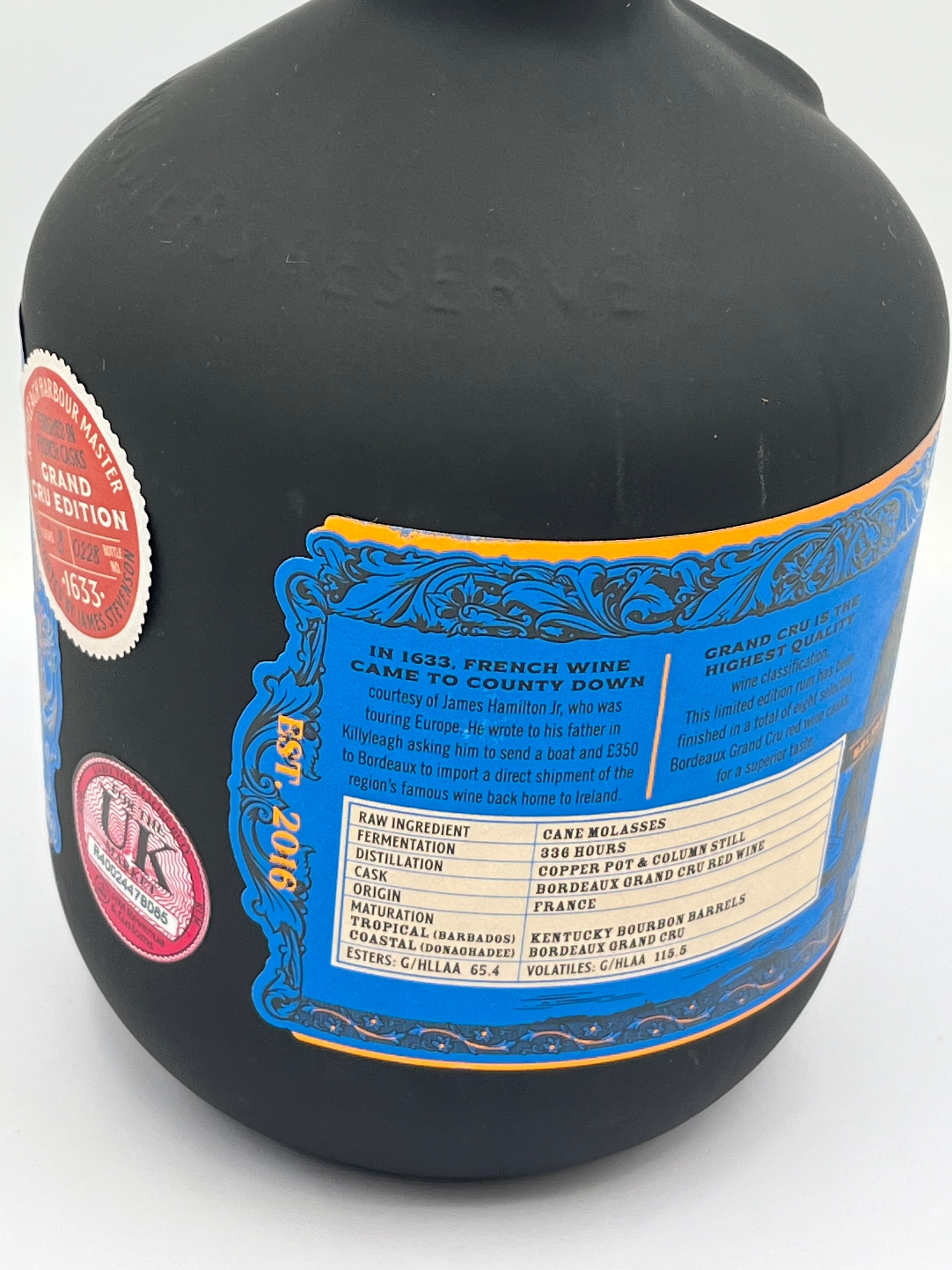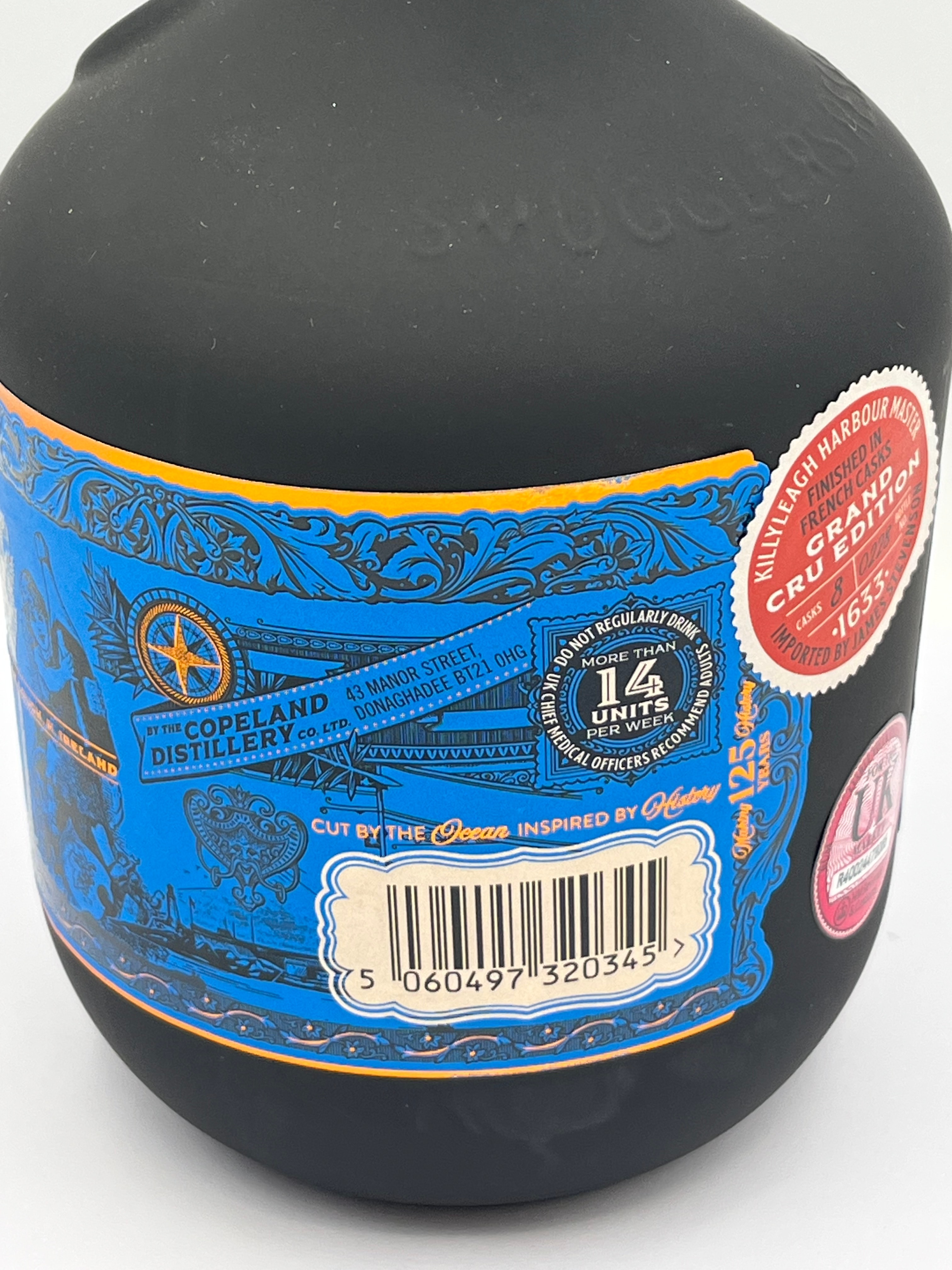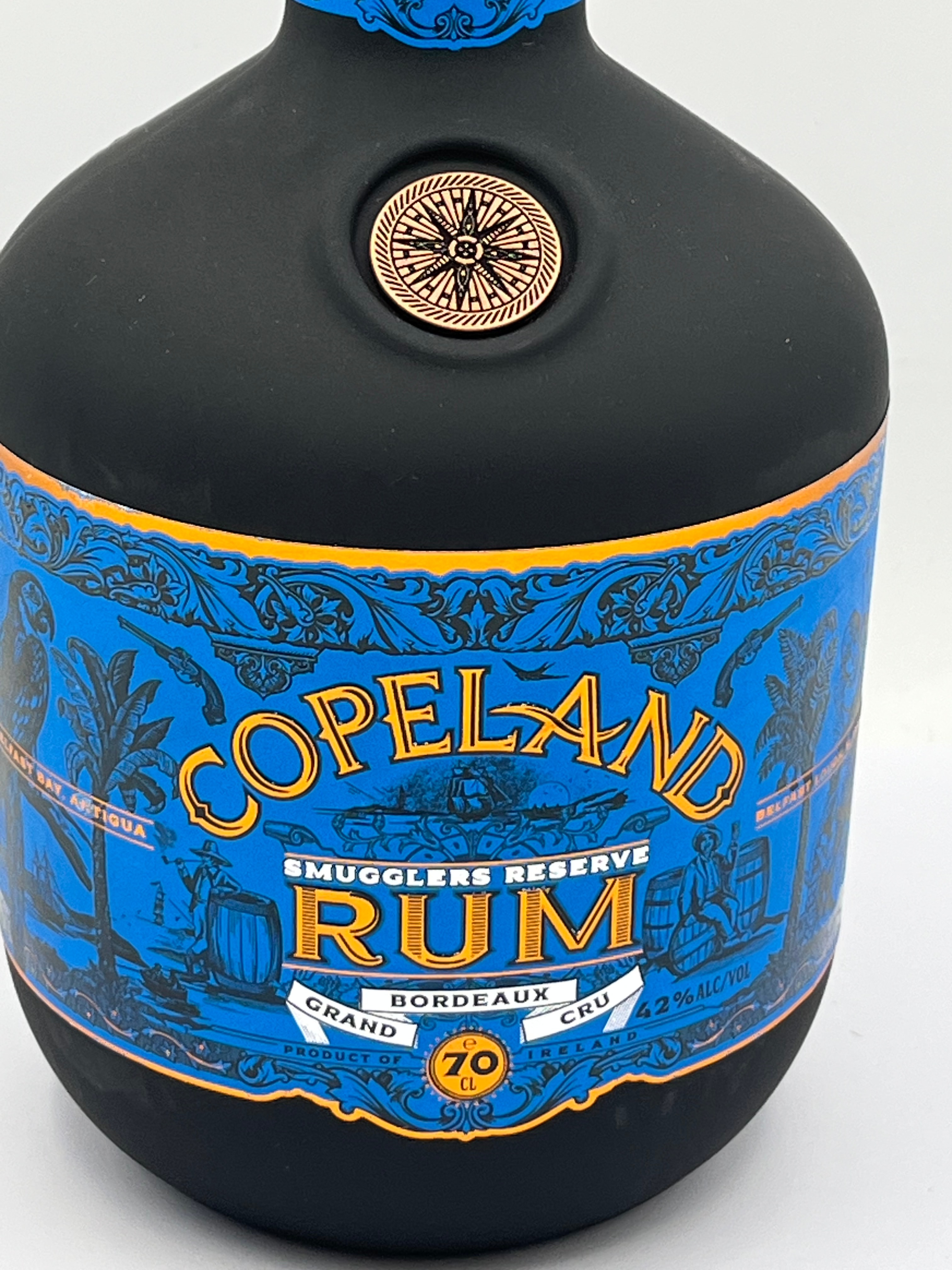 Copeland Smugglers Reserve Bordeaux Grand Cru Rum, 70 CL, 42% ALC/VOL. This contemporary matte black glass bottle features a prominent blue label with gold/orange accents, decorated with maritime and tropical motifs including palm trees, sailing ships, and barrels. A metallic, bronze-toned compass rose emblem is set into the shoulder. Labels identify it as a “Grand Cru Edition,” referring to its finish in Bordeaux Grand Cru red wine casks. Production details indicate it is made from cane molasses sourced from Barbados and Antigua, with a stated origin in France, and finished by The Copeland Distillery Co. Ltd. in Ireland (established 2016). Further text provides historical context regarding French wine coming to County Down in 1633 and detailed production specifications.