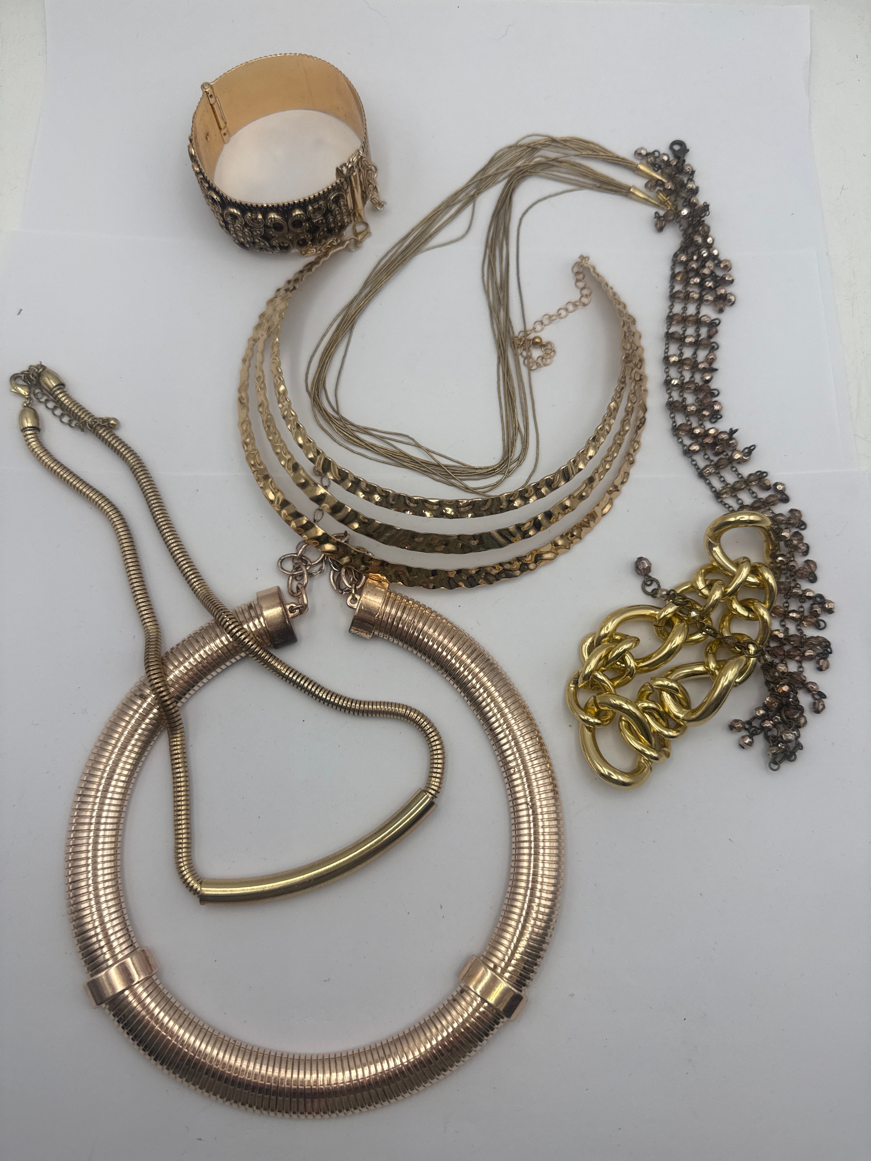 A Silpada ‘Dreamy Details’ multi-strand necklace, featuring rigid decorative bands. Further comprising a collection of costume jewelry, including a wide, ribbed choker-style necklace, a thinner chain necklace with a curved bar accent, a chunky chain-link piece, a mesh-style necklace with small dangling elements, and a wide cuff bracelet with an intricate openwork design. The pieces are predominantly in yellow gold-tone metallic finishes, with some exhibiting a rose gold-tone and one necklace in a darker, possibly bronze-tone.