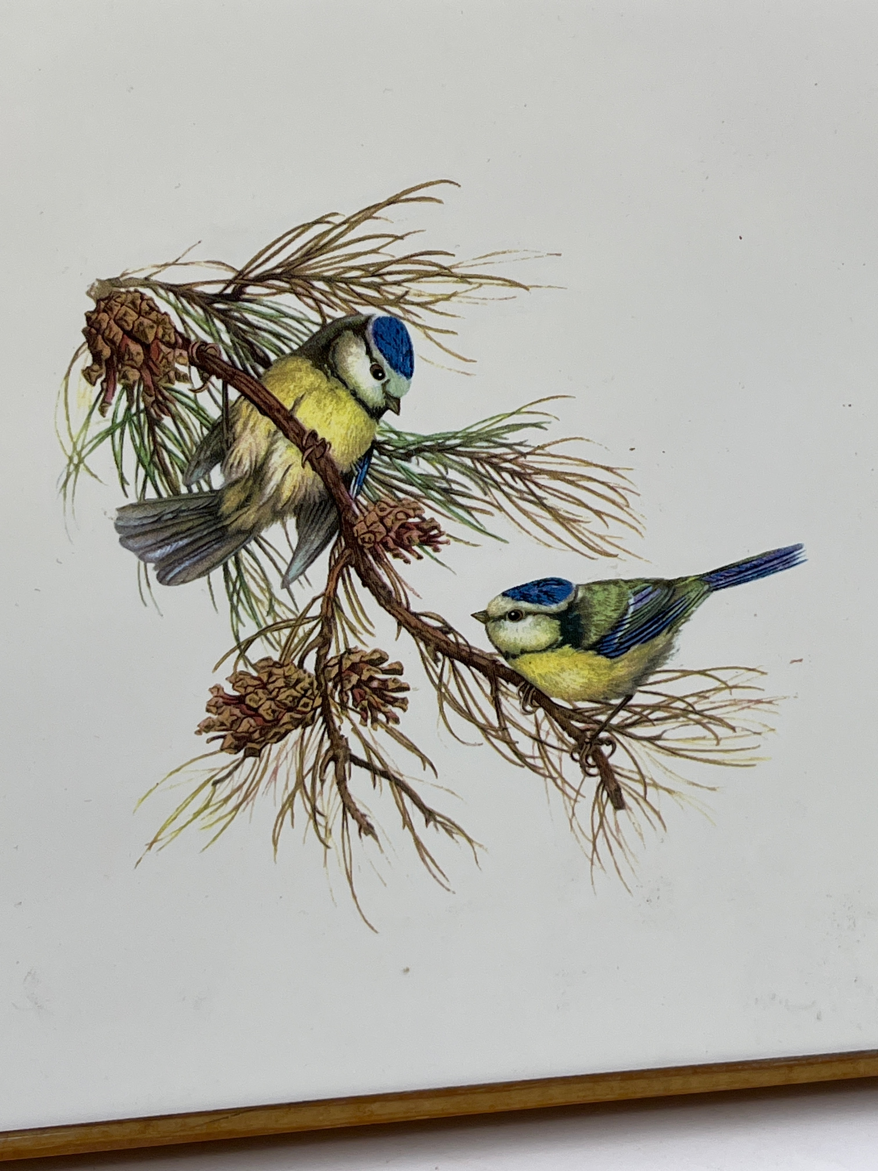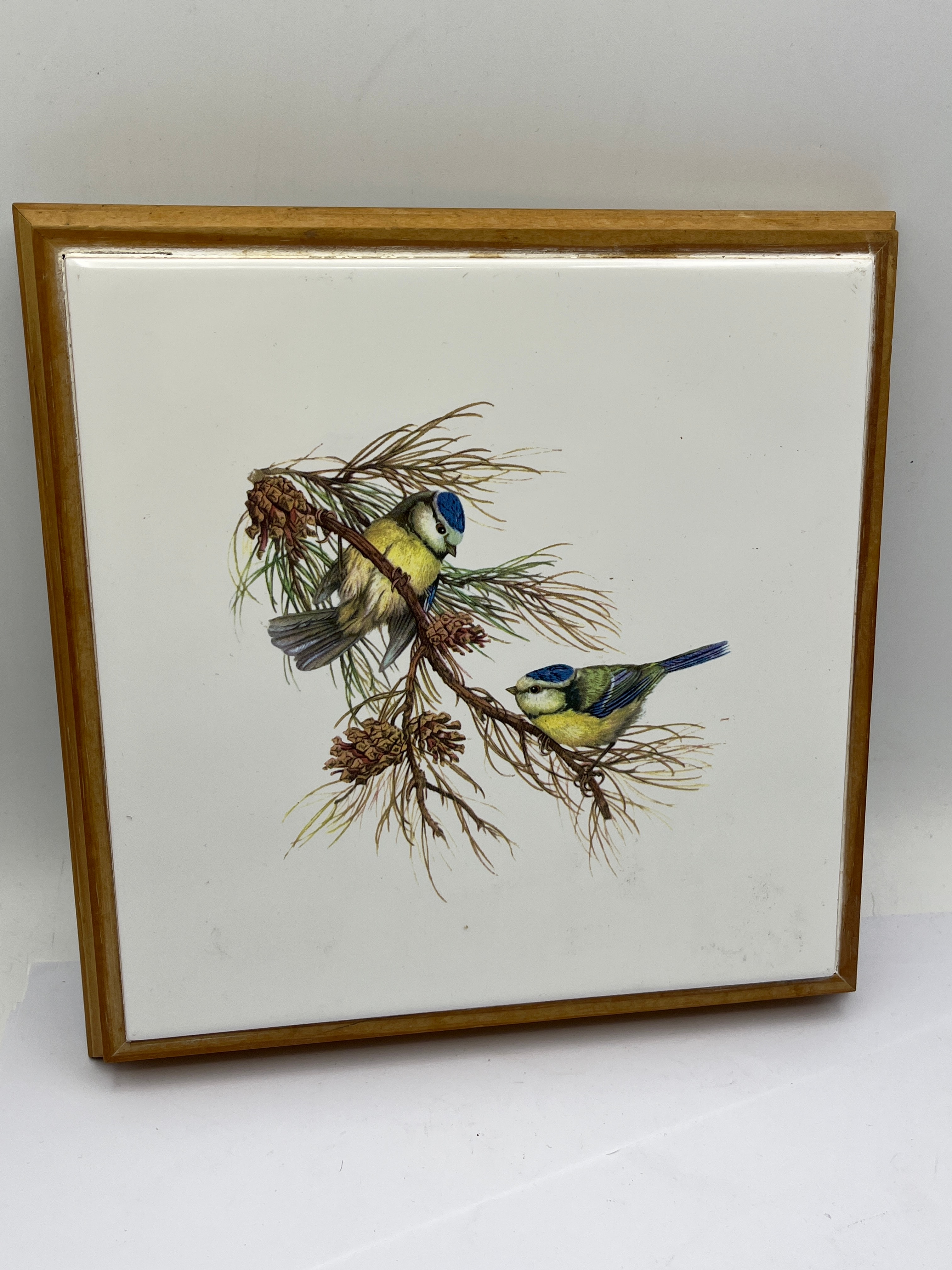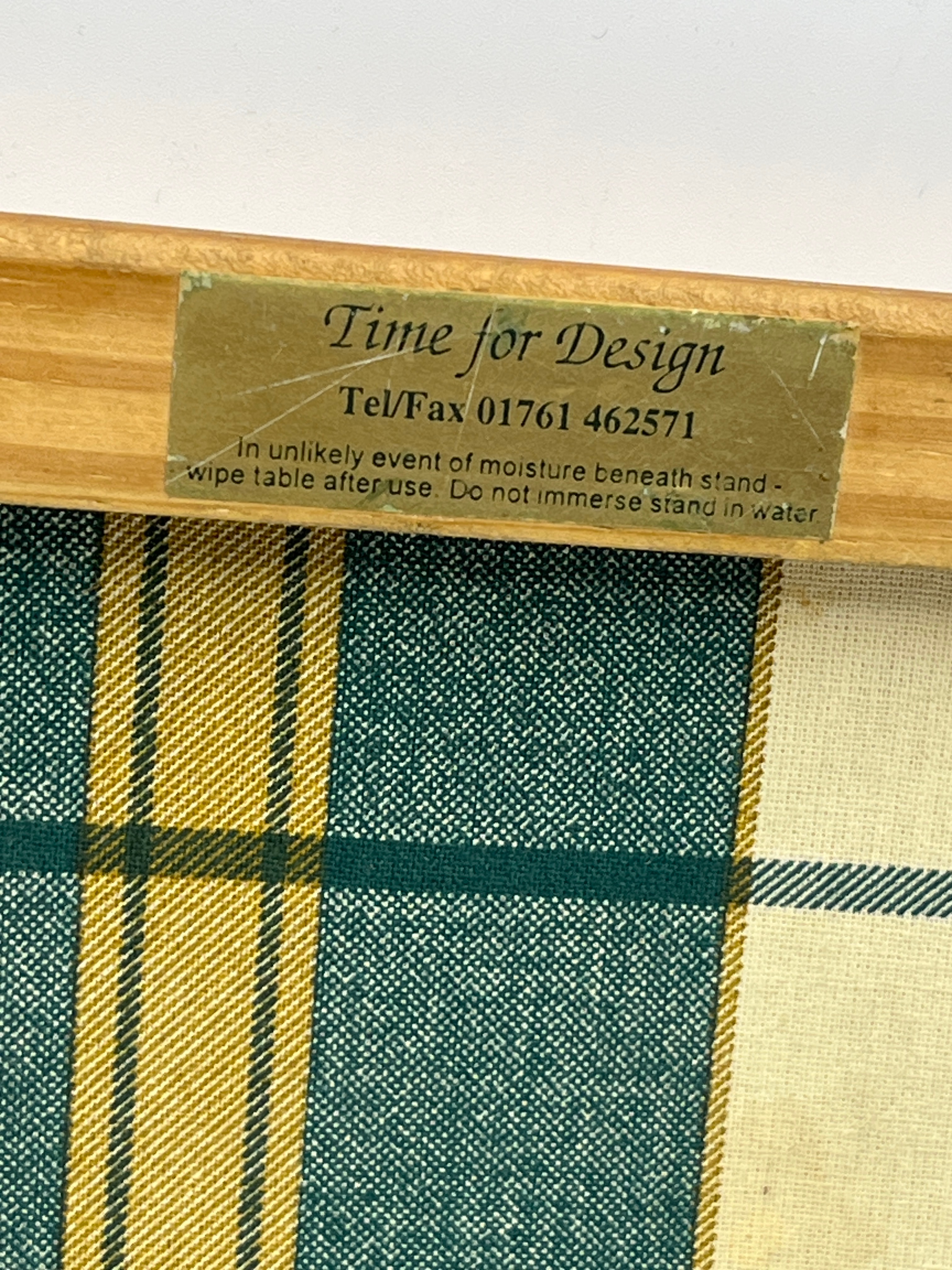 A decorative trivet or stand by Time for Design, comprising a central ceramic tile set within a light-toned wooden frame. The tile features a naturalistic illustration of two blue tits perched on a pine branch with visible pine cones, against a plain white background. The reverse side is covered with a green, yellow, and white plaid fabric, and bears a gold-colored label stating “Time for Design,” a contact number (Tel/Fax 01761 462571), and care instructions in English (“In unlikely event of moisture beneath stand – wipe table after use. Do not immerse stand in water”). Suggesting a modern or mid-to-late 20th-century period.