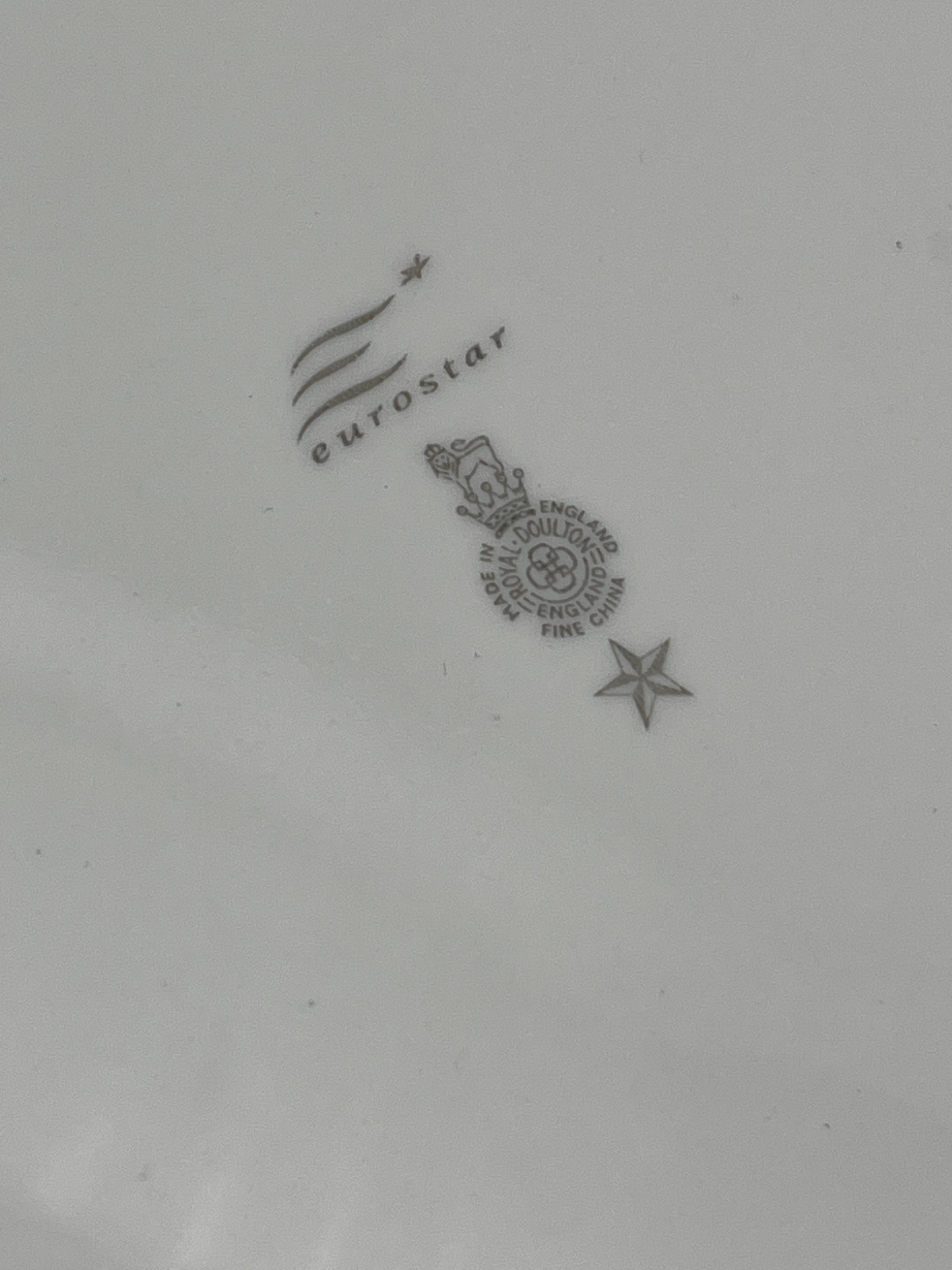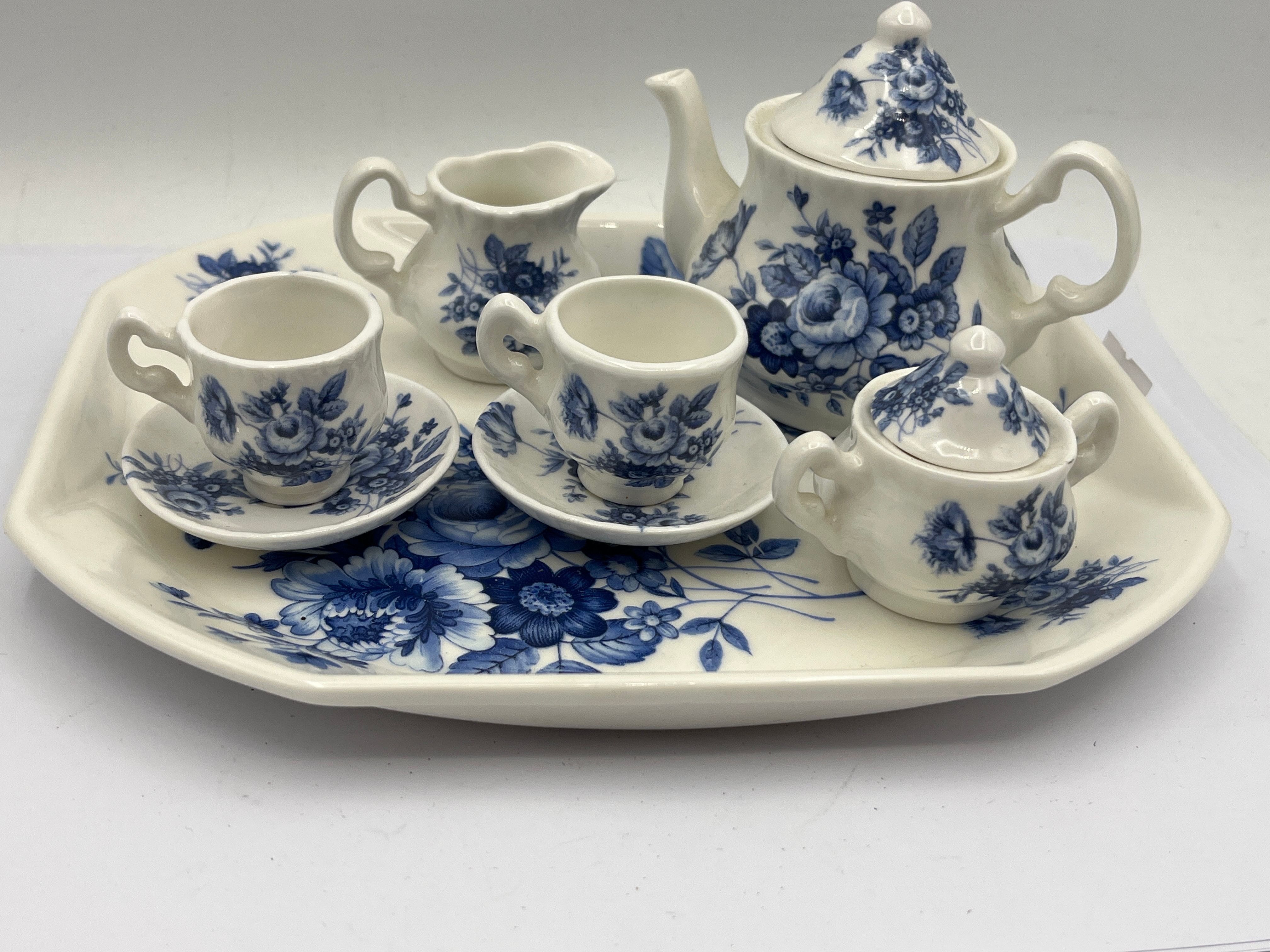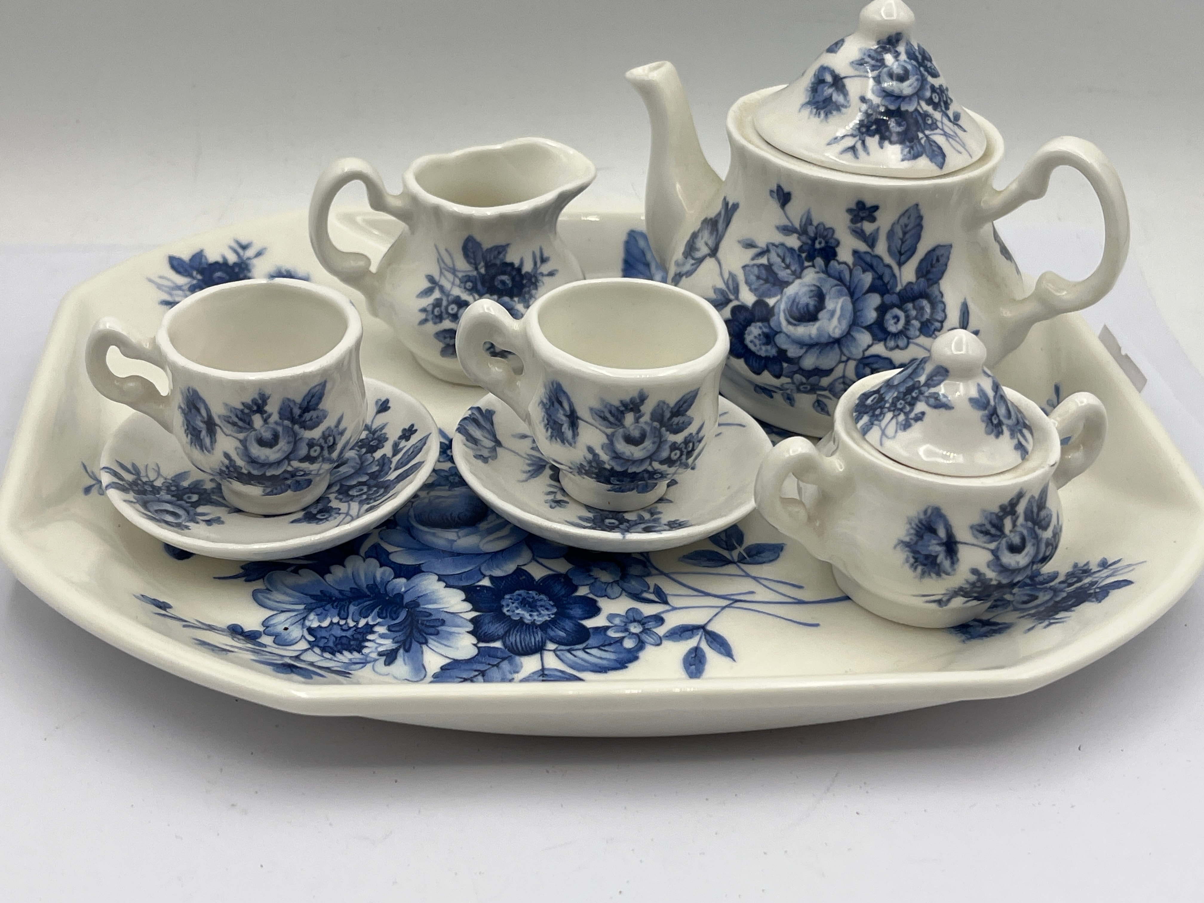 A Royal Doulton Norfolk pattern miniature tea set, comprising a rectangular serving tray, a lidded teapot, a lidded sugar bowl, a creamer, two cups, and two saucers. The set features a consistent blue and white transferware floral pattern, predominantly depicting roses and foliage. Crafted from fine china. The underside of one piece is marked with “Eurostar” and a stylized star logo, alongside a circular mark that reads “ROYAL DOULTON & CO LTD ENGLAND” beneath a crown, encircled by “MADE IN ENGLAND FINE CHINA,” with an additional star symbol below.