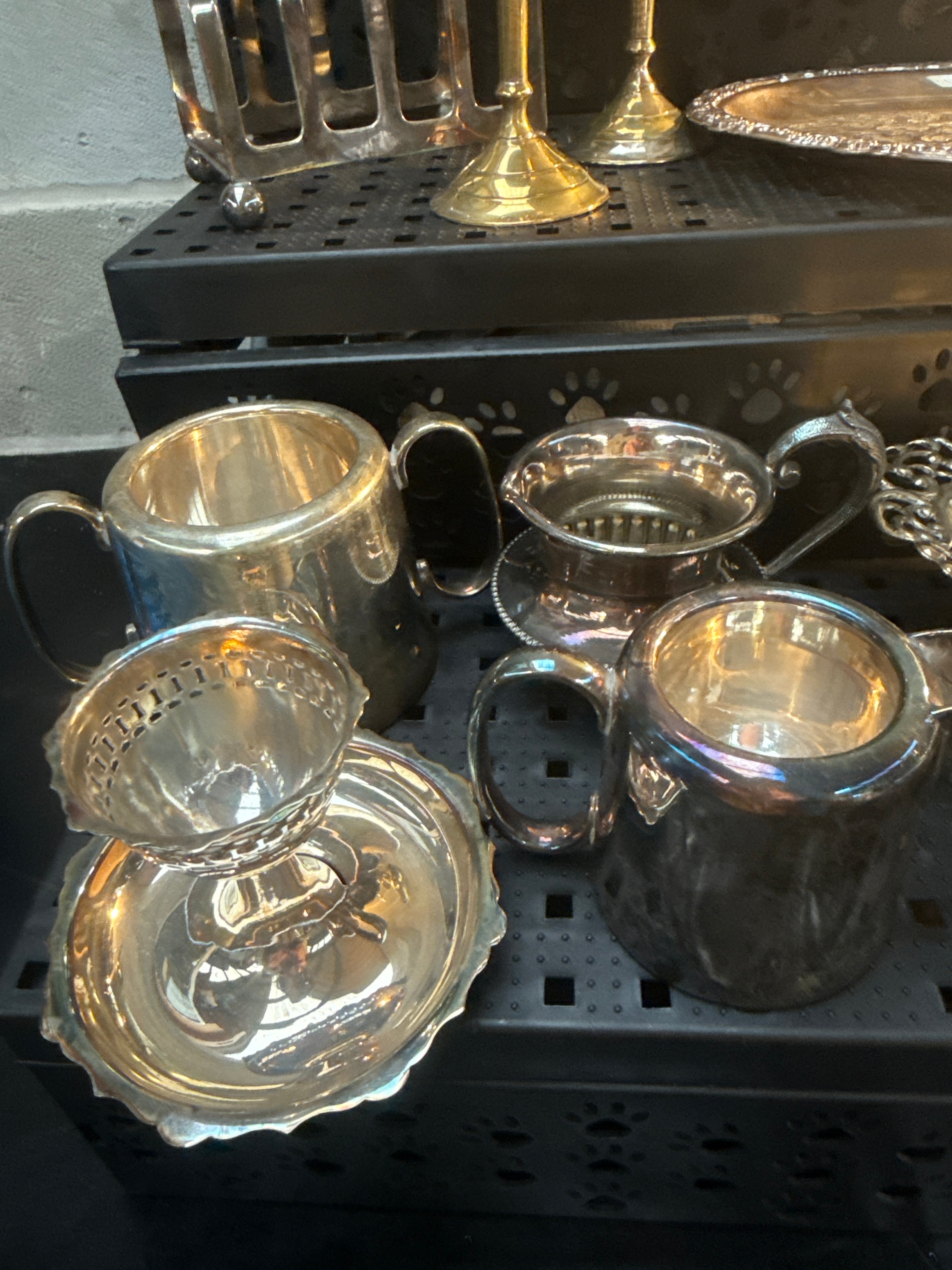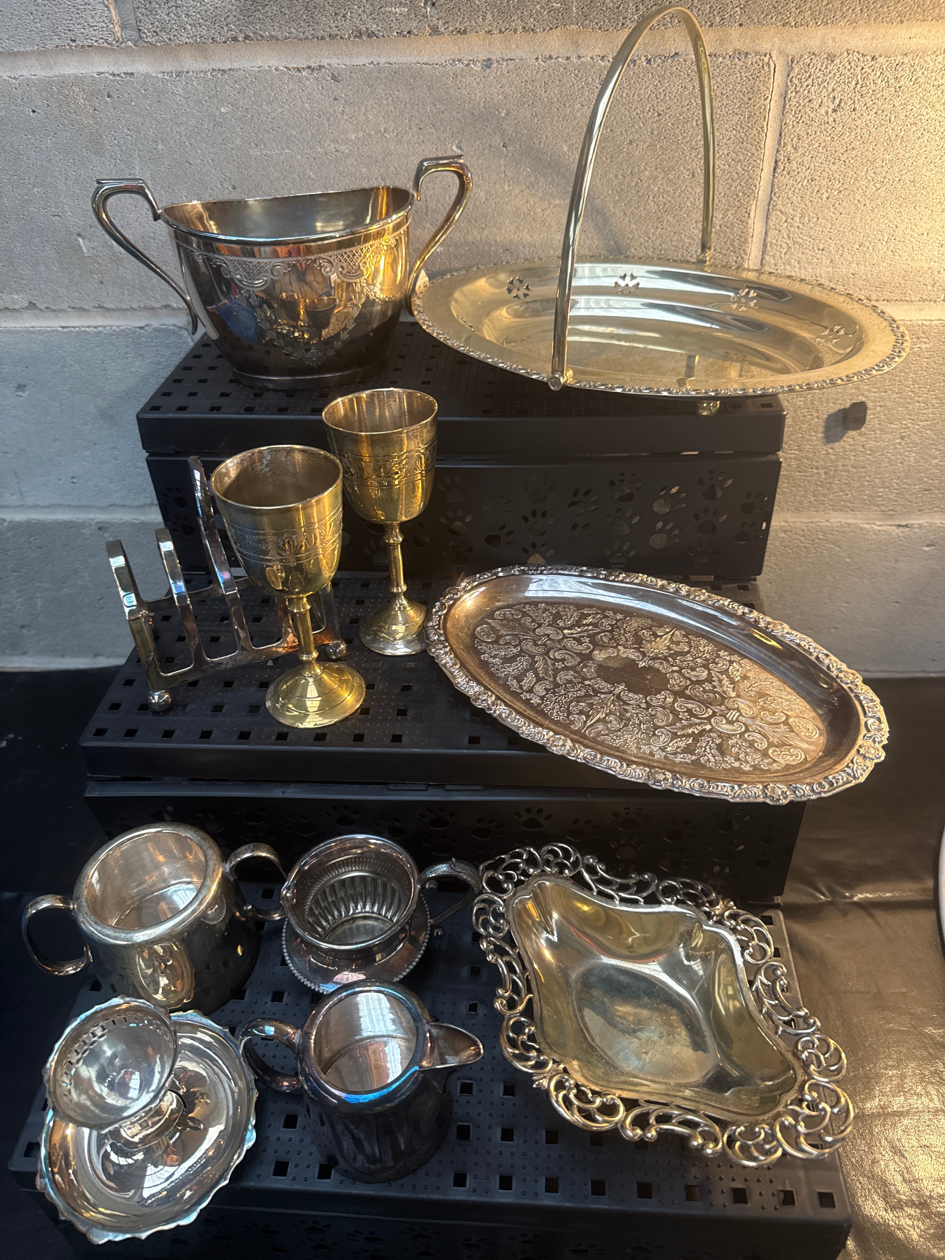 A collection of silver-plated tableware and decorative items, comprising a large two-handled bowl, two lidded pitchers, two small handled mugs, two stemmed goblets, a handled serving basket, an oval serving tray, a rectangular ruffled-edge dish, a small footed dish with an underplate, and a four-slot rack. The items feature ornate embossed and chased decoration, scrollwork, floral motifs, and scalloped or ruffled edges, consistent with traditional or Rococo-influenced designs. Predominantly silver-toned, with some brass-toned elements visible on the goblets.