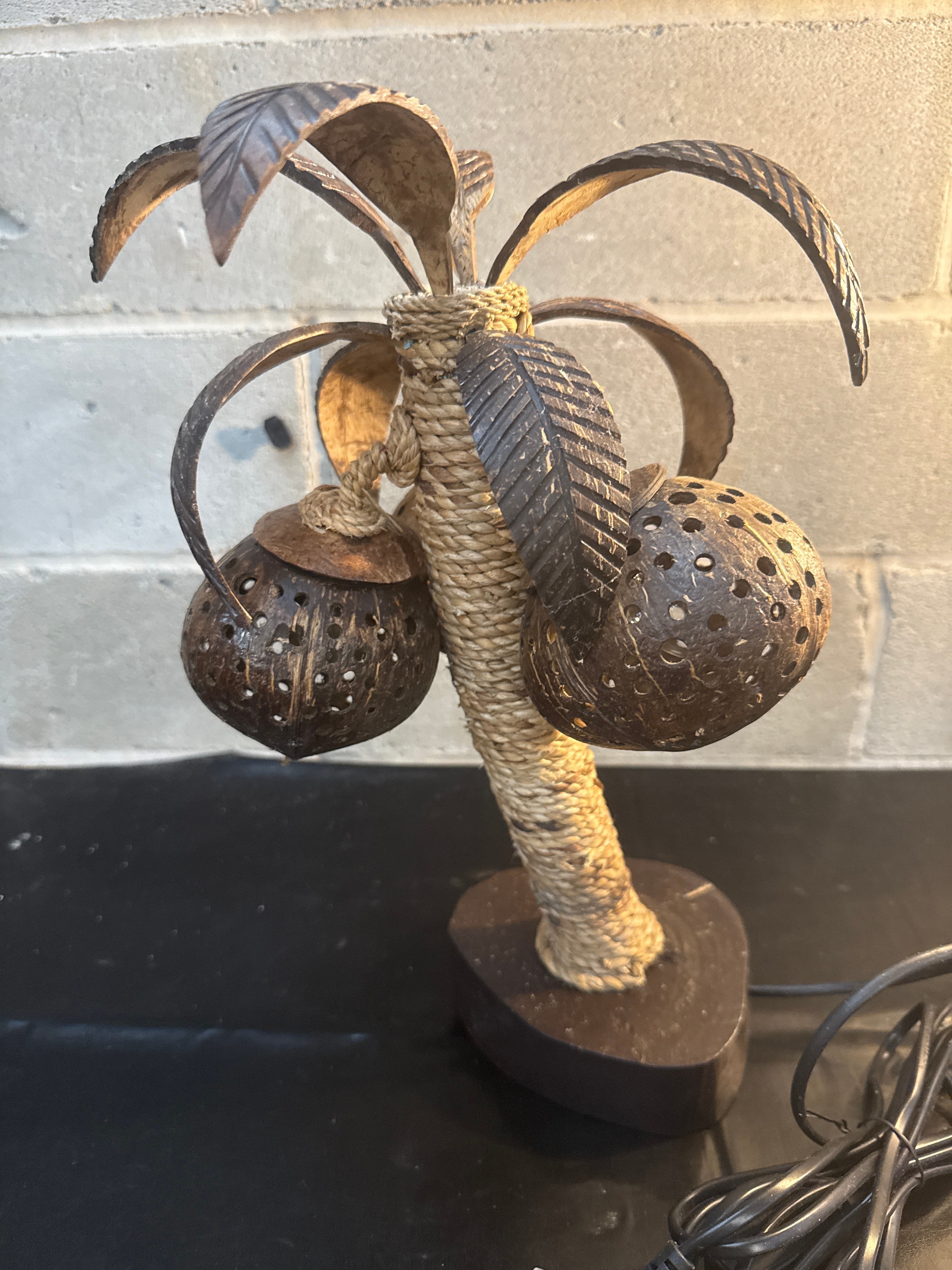 A Kinaree Thai/Indonesian coconut palm tree table lamp. Crafted to resemble a palm tree, it features a dark-stained wooden base supporting a trunk wrapped in natural rope. The palm fronds and three suspended spherical light shades, designed to resemble coconuts, are made from textured and carved coconut shells, with the ‘coconuts’ perforated to diffuse light. The lamp incorporates visible electrical wiring emerging from its base, suggesting a mid-to-late 20th century or contemporary period. The overall aesthetic is tropical.