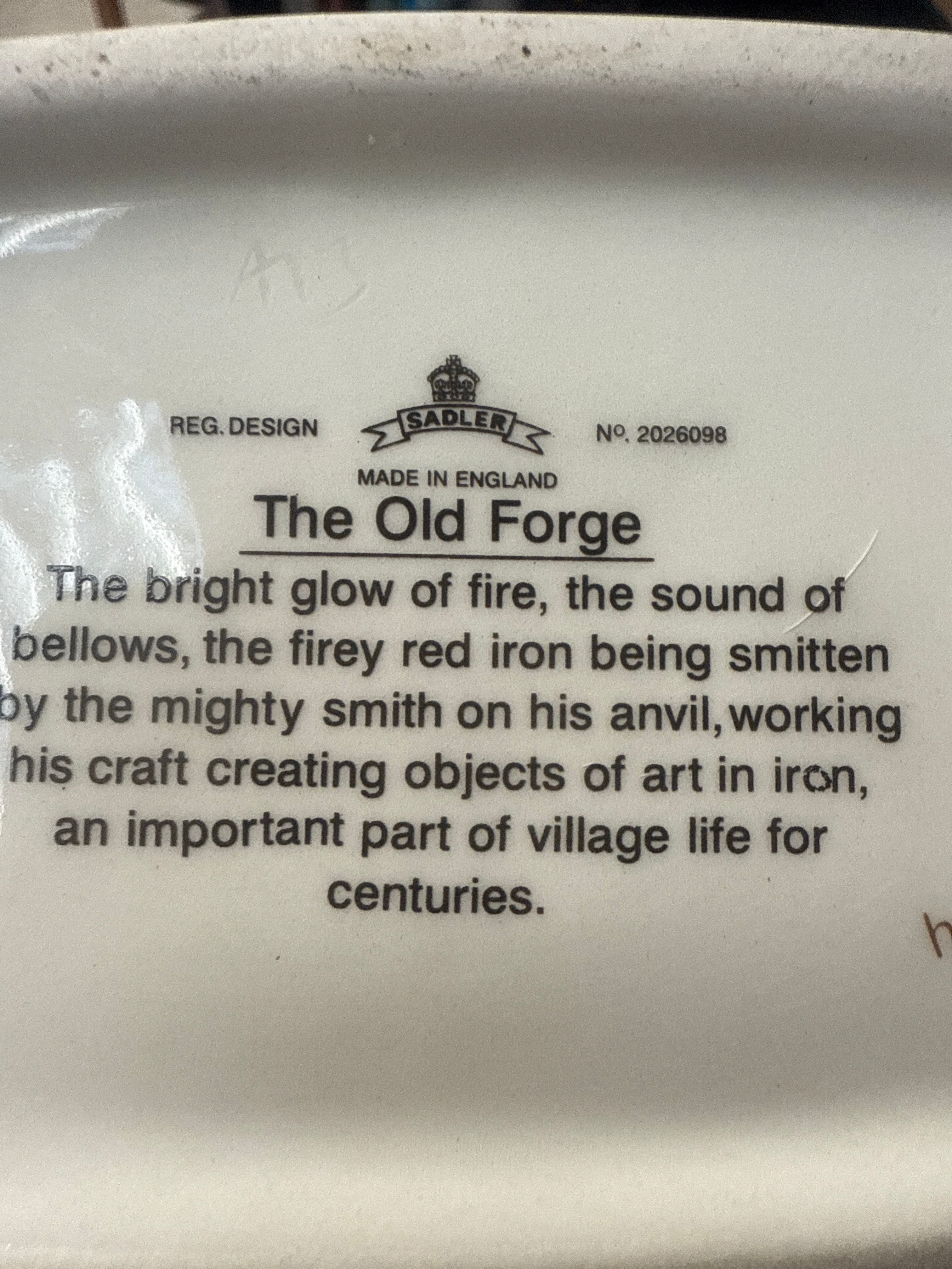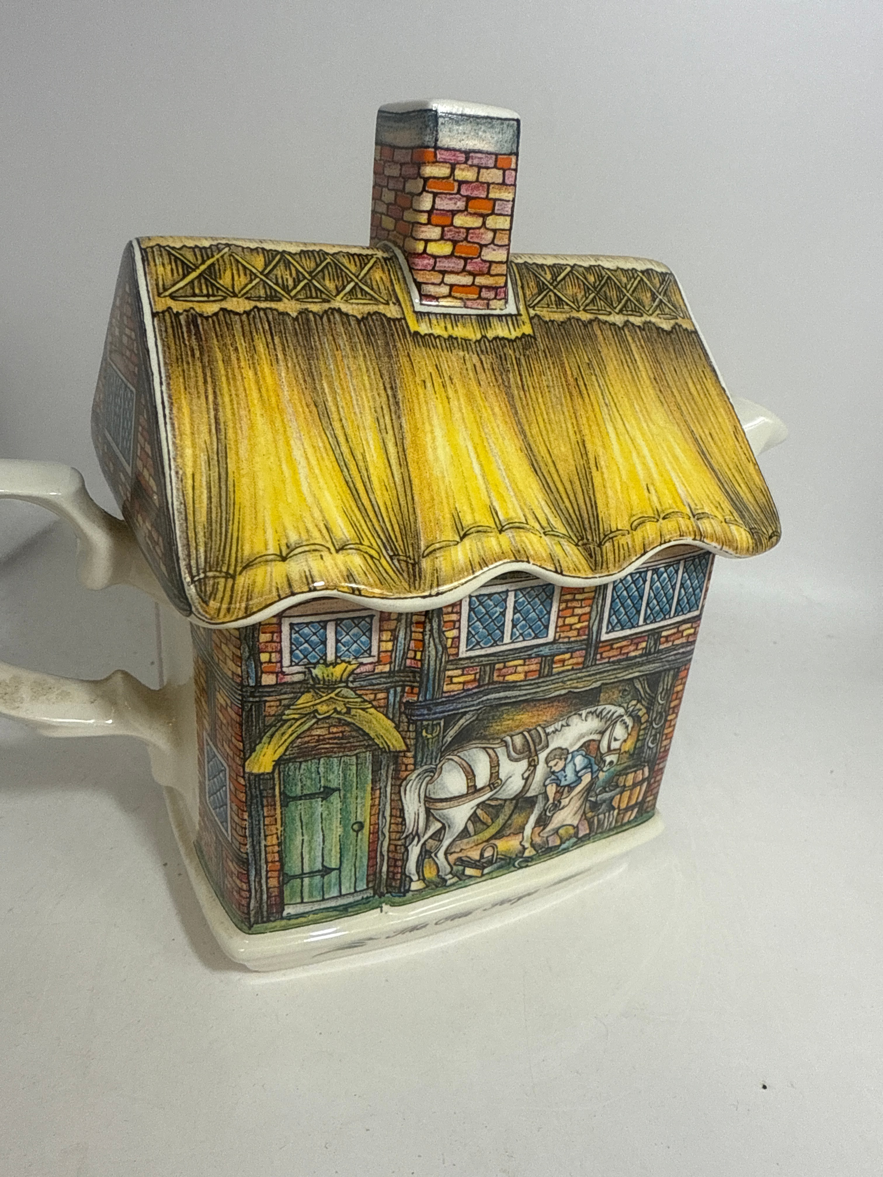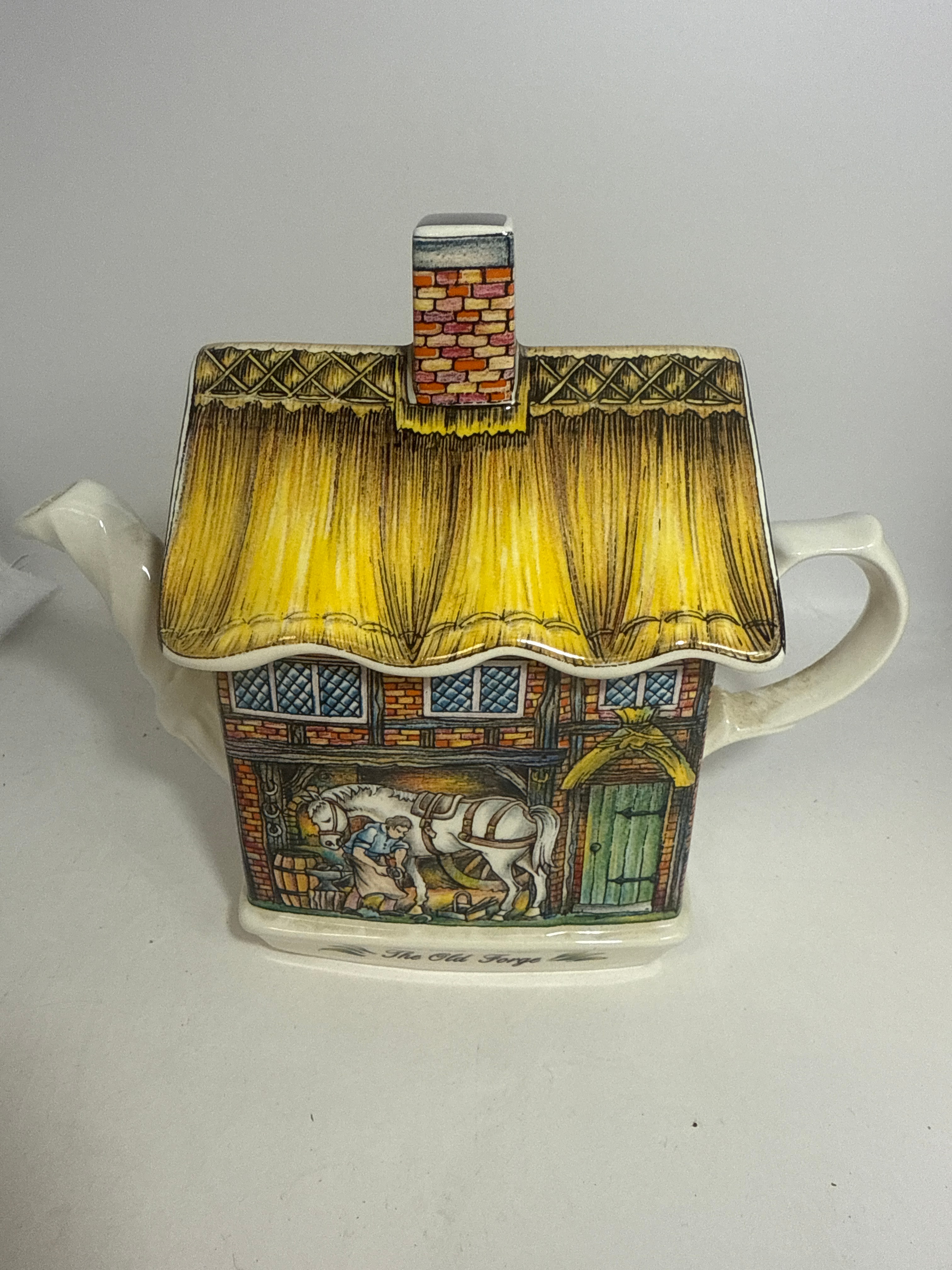 A Sadler ‘The Old Forge’ novelty teapot. This ceramic teapot is whimsically styled as a multi-colored, thatched-roof building with brick walls, blue-paned windows, a green door, and a prominent brick chimney. The main body features a detailed illustration of a blacksmith shoeing a horse within the forge, consistent with the title ‘The Old Forge’ visible on the front base and repeated on the underside. The base is further marked with ‘REG. DESIGN,’ ‘SADLER,’ ‘MADE IN ENGLAND,’ and ‘NO. 2026098,’ along with a descriptive text that reads: ‘The bright glow of fire, the sound of bellows, the firey red iron being smitten by the mighty smith on his anvil, working his craft creating objects of art in iron, an important part of village life for centuries.’