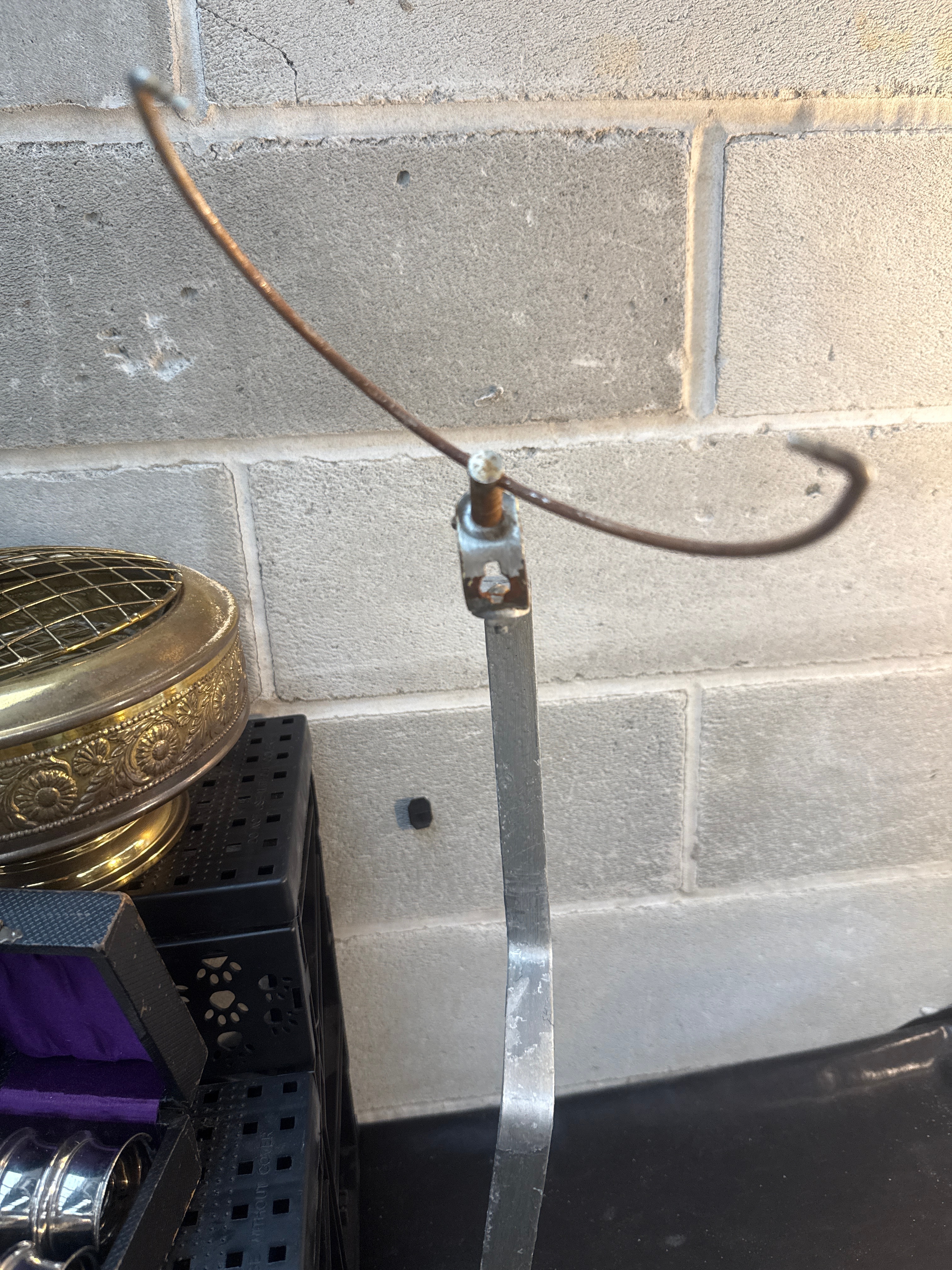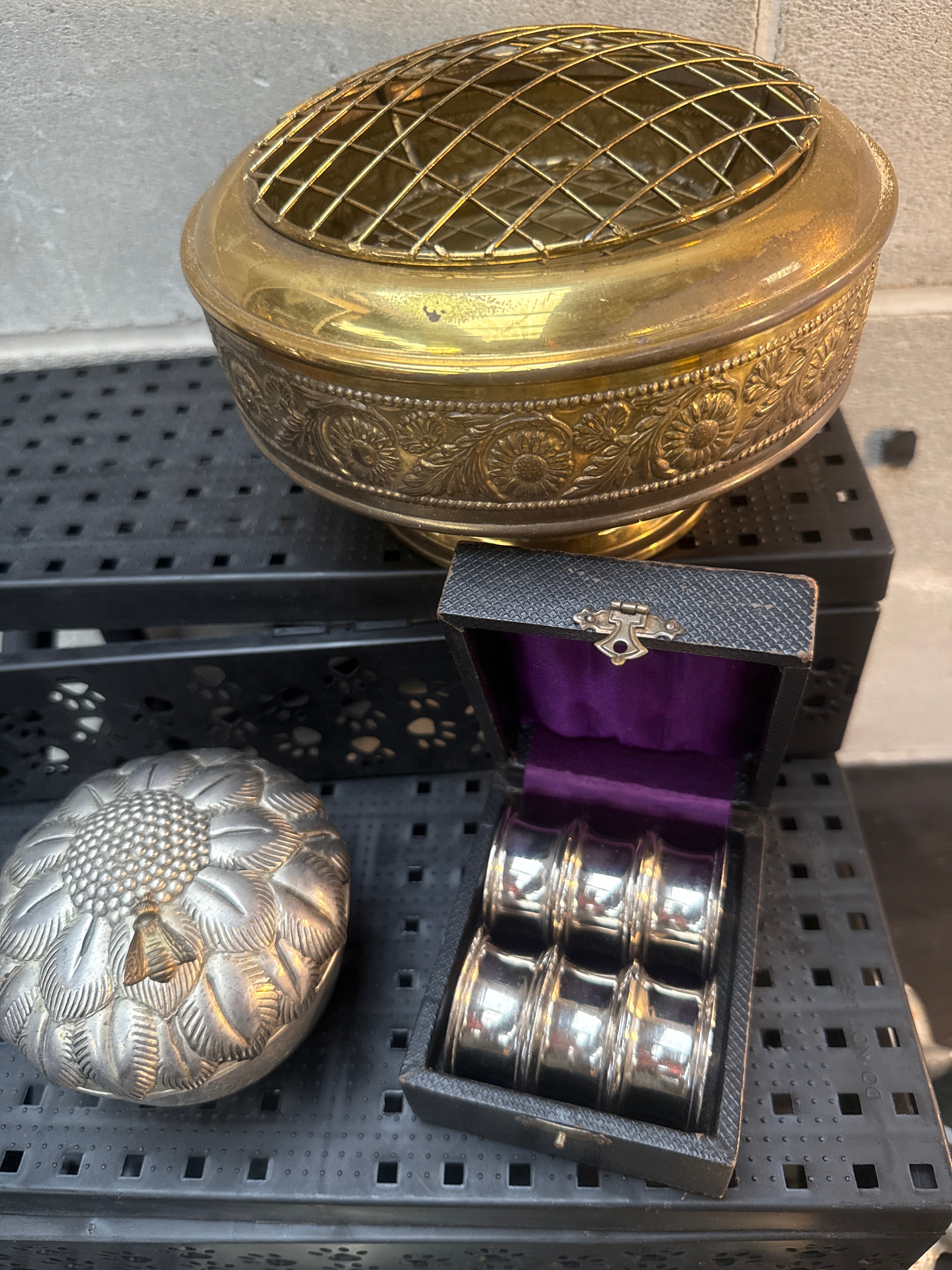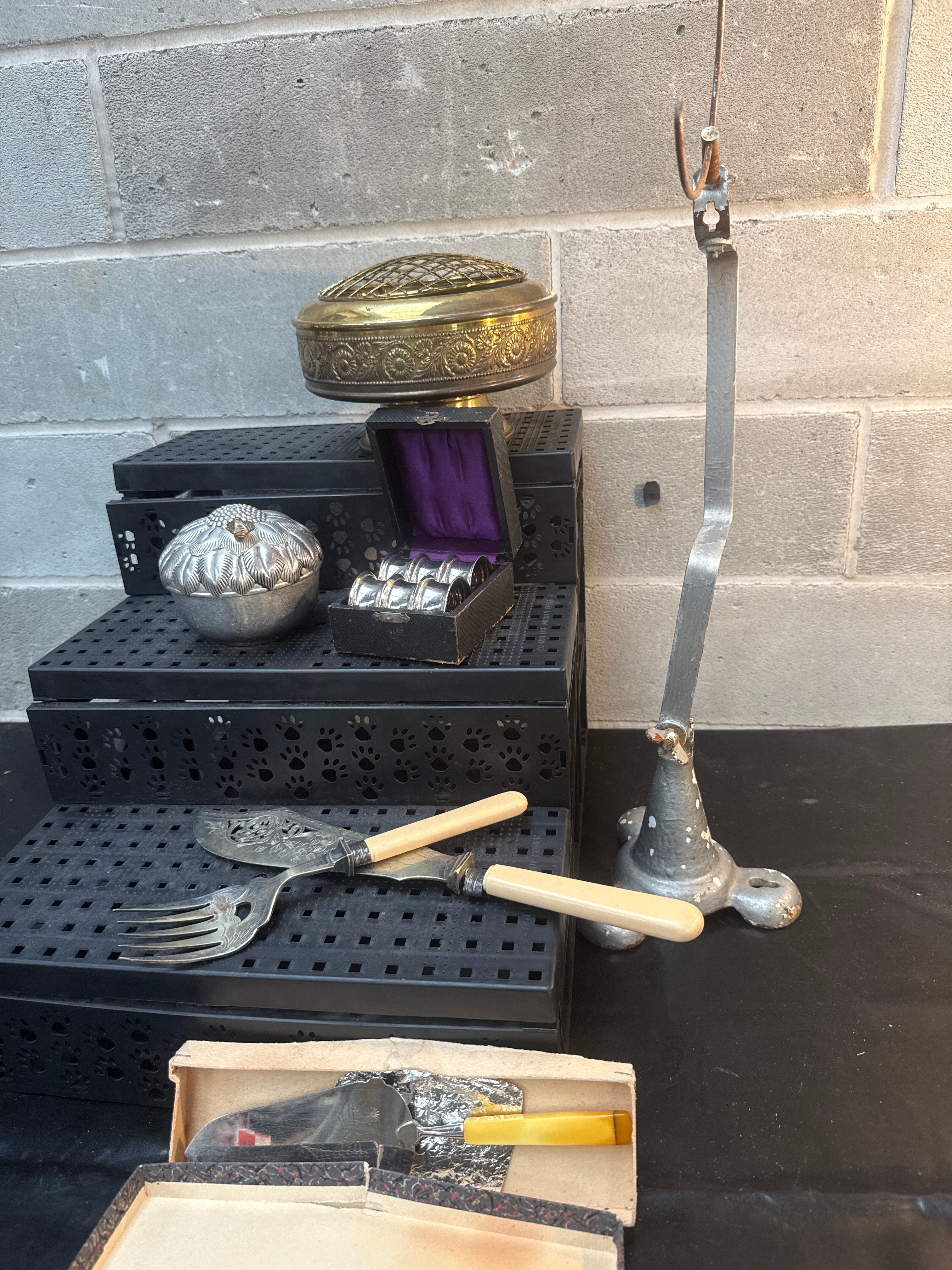 This lot comprises a diverse collection of decorative and utilitarian objects. It features a circular brass bowl with an ornate floral-embossed band and a removable grid insert, likely a flower frog. Also included is a smaller, spherical silver-toned metal lidded box adorned with a sunflower or chrysanthemum relief. A black fabric-covered box with a purple velvet interior houses a set of six plain silver-toned metal napkin rings. The collection further includes two sets of serving implements: a large carving fork and a broad-bladed knife with intricate pierced and engraved decoration and cream-colored handles, likely bone or early plastic; alongside a smaller knife and flat-bladed server with yellow-amber-colored handles, presented in a simple cardboard box. Completing the group is a tall, slender metal stand with a weighted painted base, a flat stem, and a curved wire top with a small hook. Materials encompass brass, silver-toned metals, painted and cast metal, steel, and what appears to be bone or early plastics for the handles.