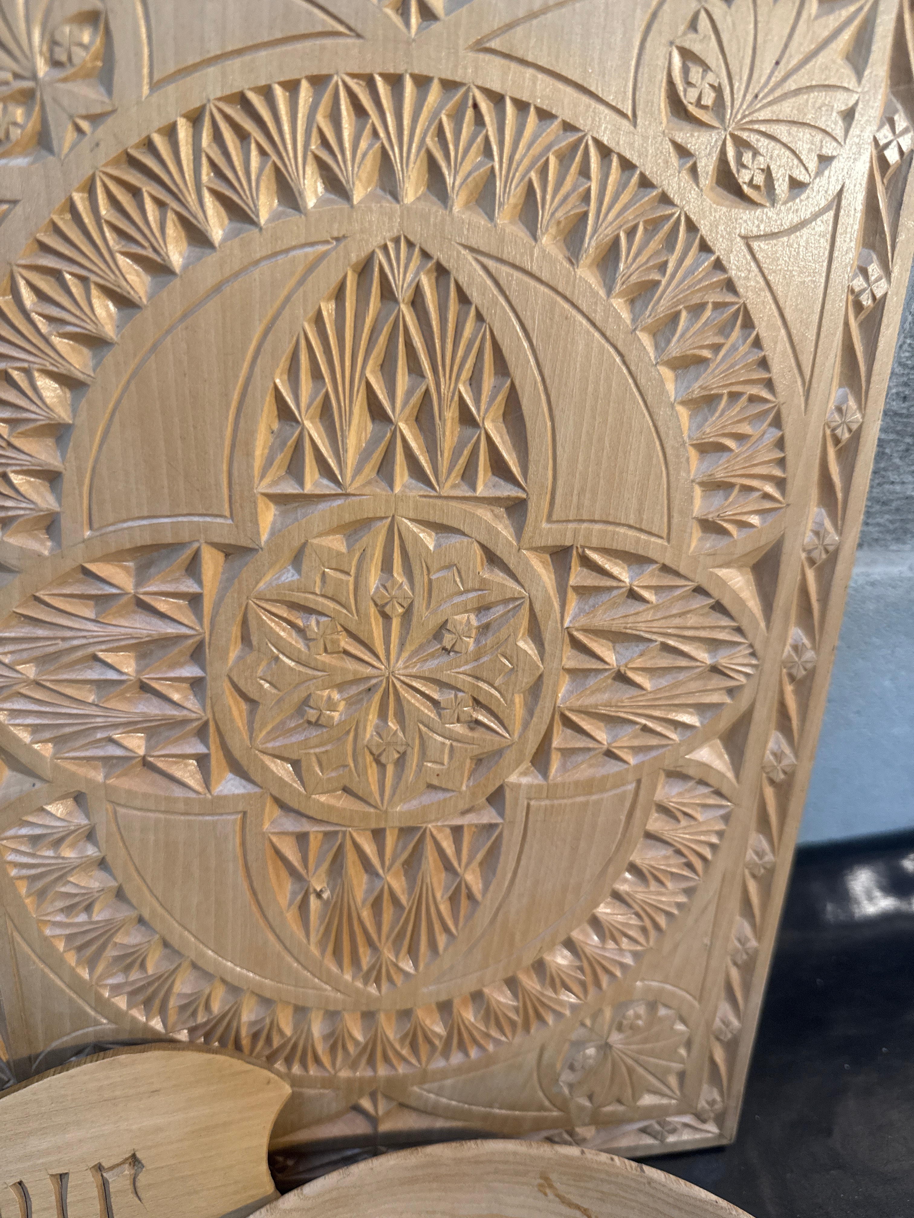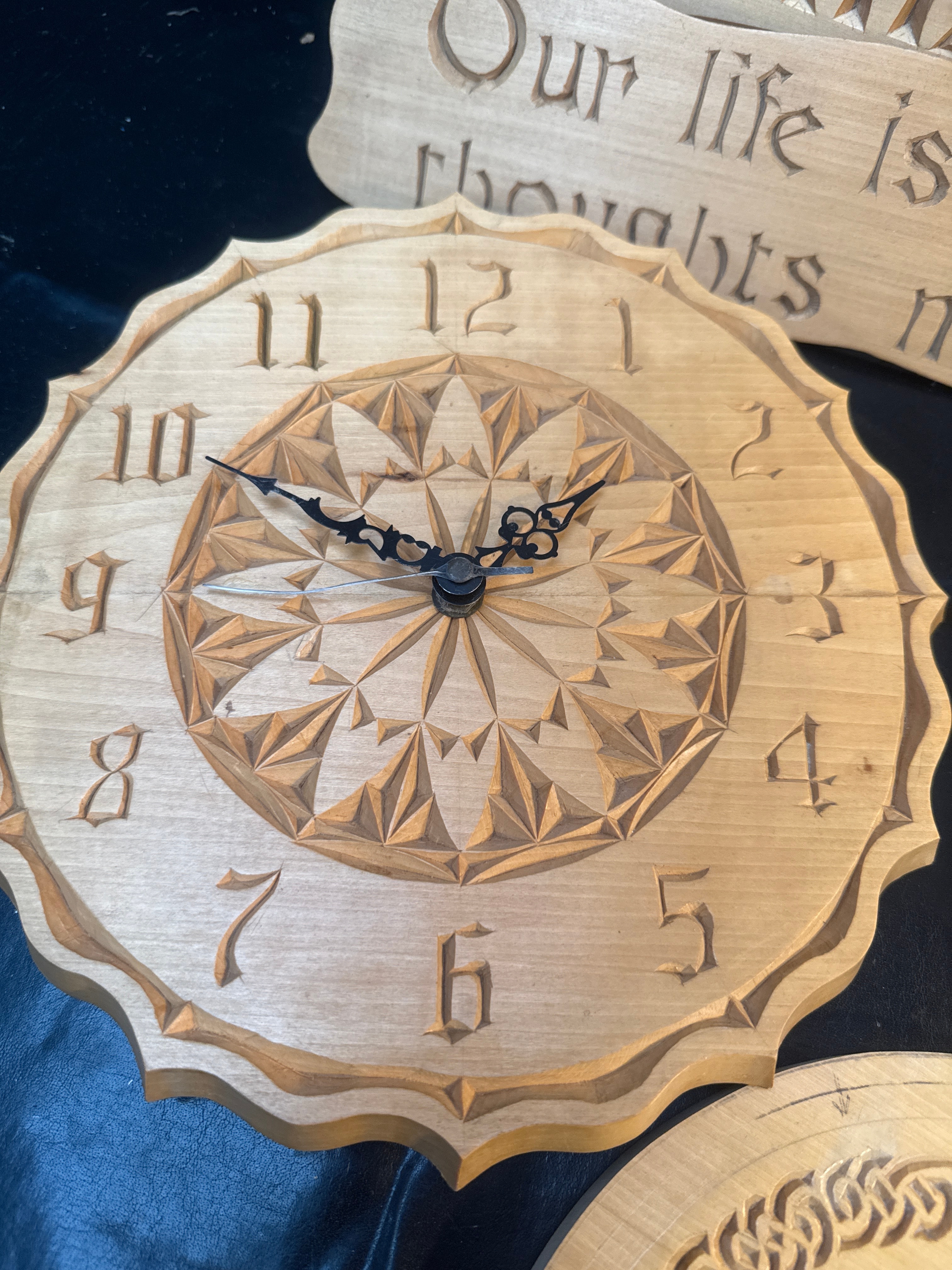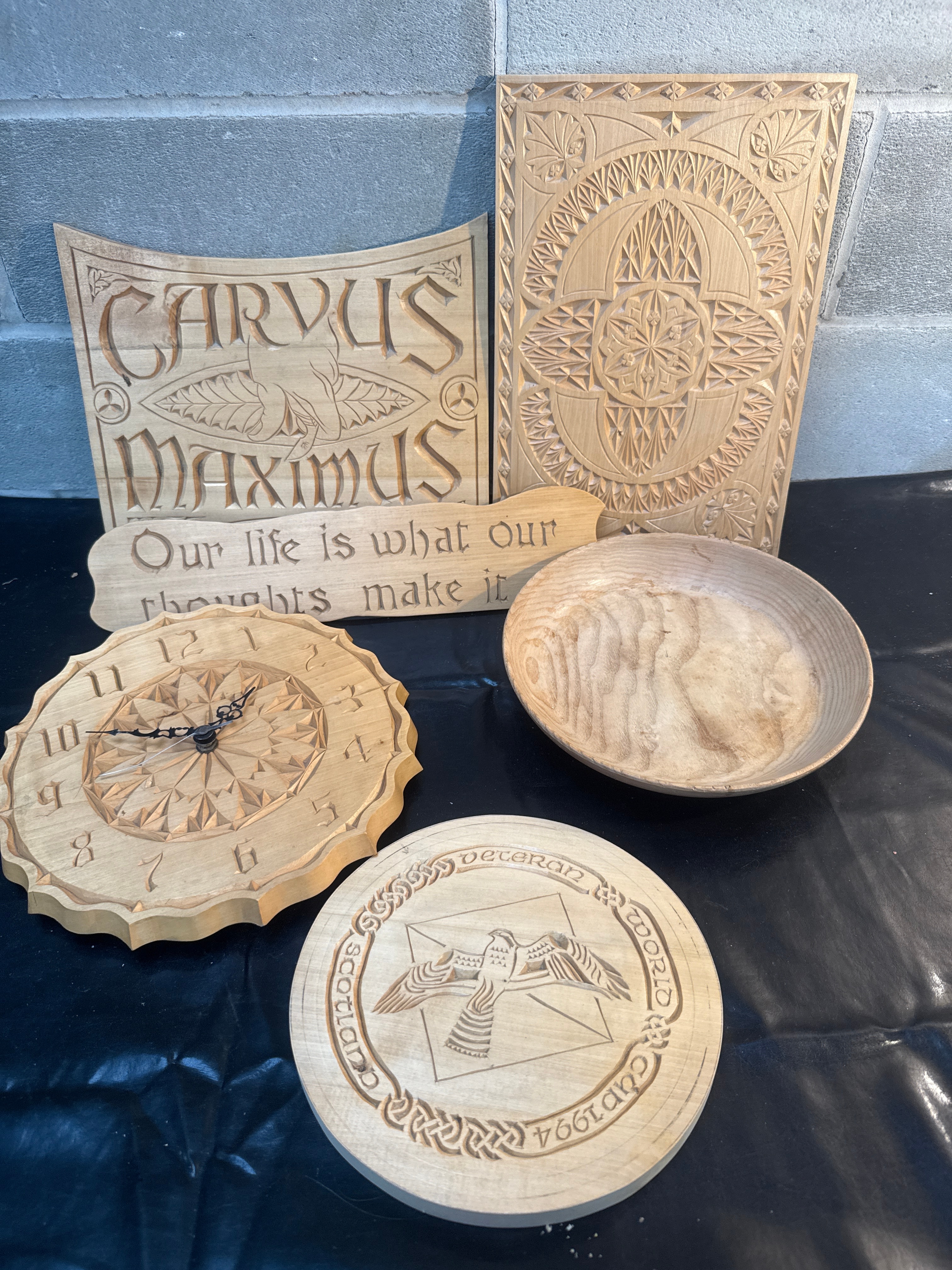 A collection of five meticulously hand-carved wooden objects, comprising three decorative wall plaques/signs, one functional wall clock, and one turned wooden bowl. All items are crafted from light-colored wood. The relief carving styles exhibit a blend of intricate geometric patterns, Celtic knotwork, and stylized bird motifs. One prominent sign is inscribed with “CARVUS MAXIMUS” (Latin, translating to “Greatest Carving” or “Maximus the Carver”) and “Our life is what our thoughts make it” in English. The wall clock features carved Arabic numerals 1-12. A circular plaque is inscribed with “SCOTTISH VETERAN CUP 1994” in English.