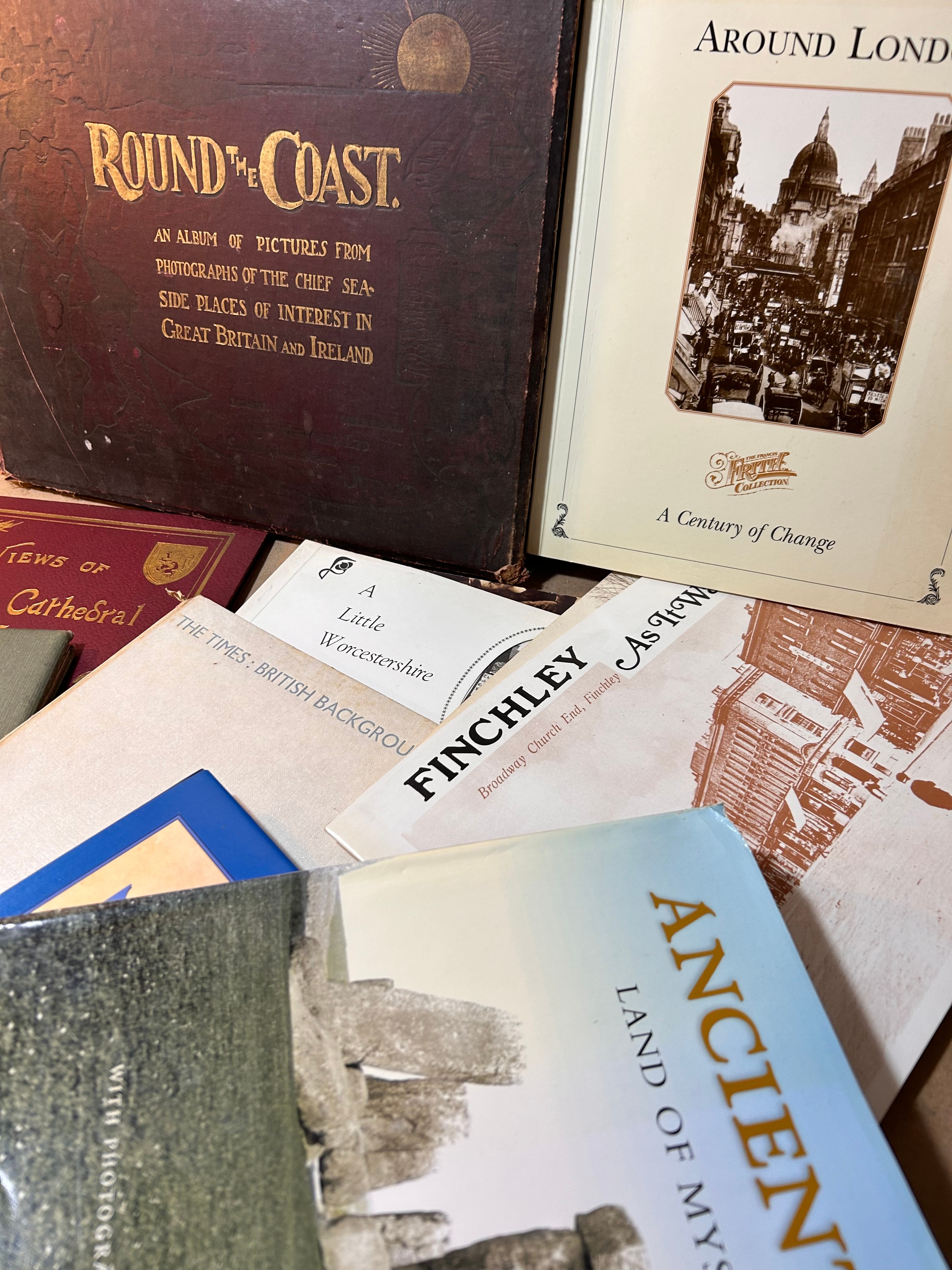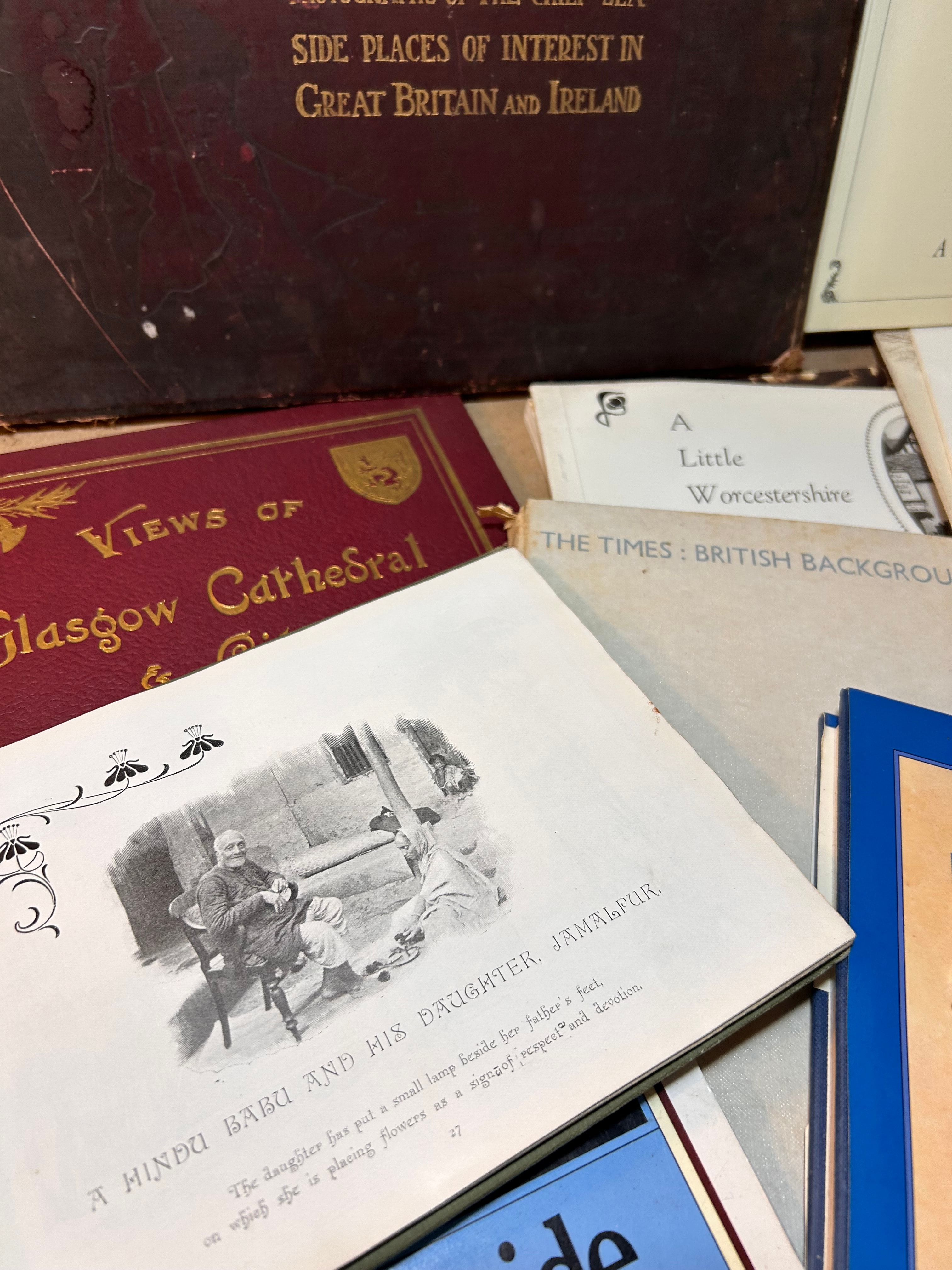 This lot comprises a collection of approximately ten to fifteen assorted books and photographic albums, primarily focused on British local history, travel, and historical photography. Key titles include the large, dark-bound “Round the Coast: An Album of Pictures from Photographs of the Chief Sea-Side Places of Interest in Great Britain and Ireland,” and several titles from the “Francis Frith Collection” such as “Around London: A Century of Change,” “Finchley,” and “Ancient Land of Mystery.” Other visible books include “Views of Glasgow Cathedral,” “Pictures from the Past – The Seaside by Gavin Weightman,” “Surrey,” “A Little Worcestershire,” and “The Times: British Background.” One open book features an illustration titled “A Hindu Babu and his Daughter, Jamalpur,” with a descriptive caption, suggesting broader ethnographic or travel content. Materials are predominantly paper and cardboard with various bookbinding types.