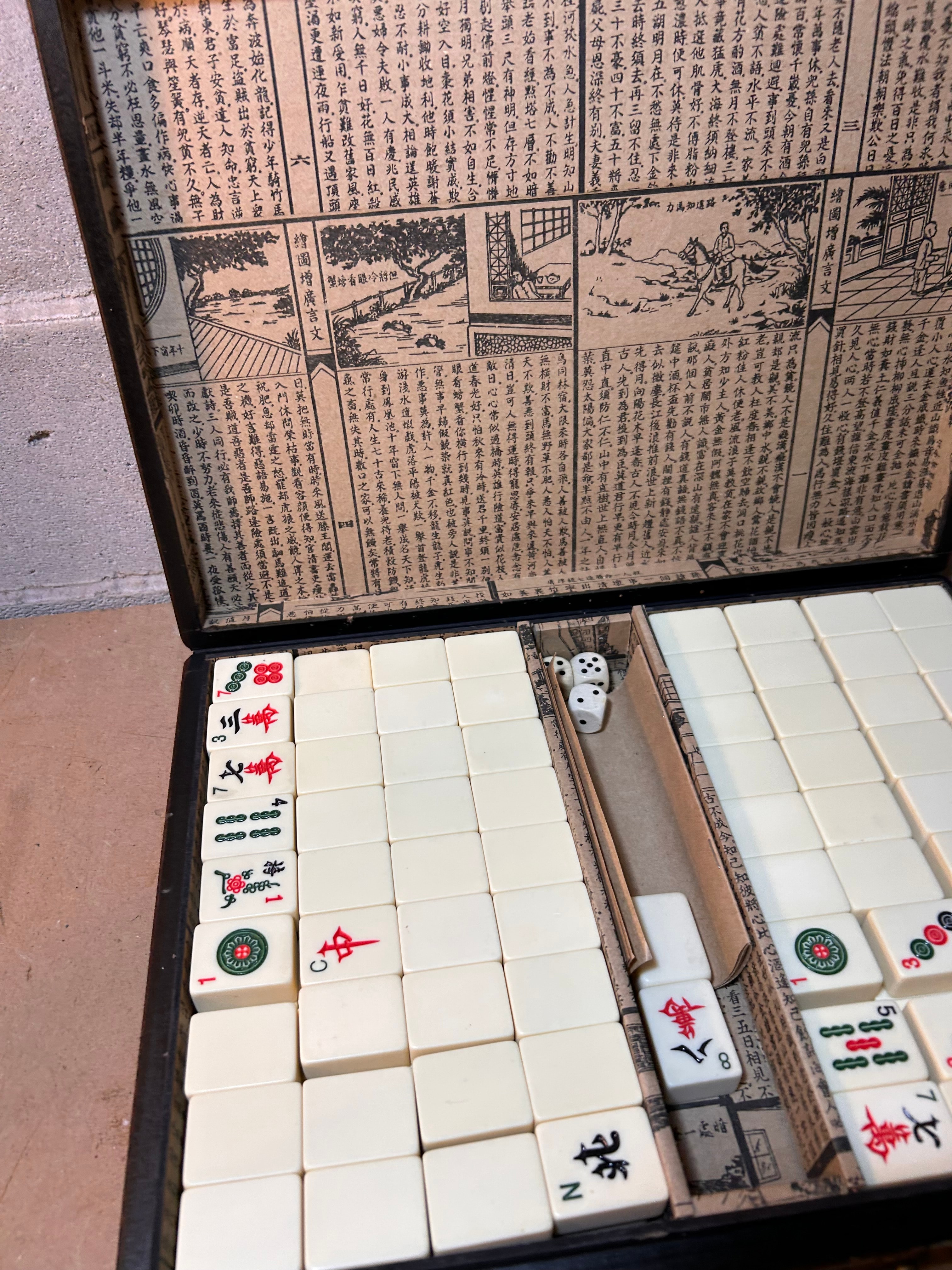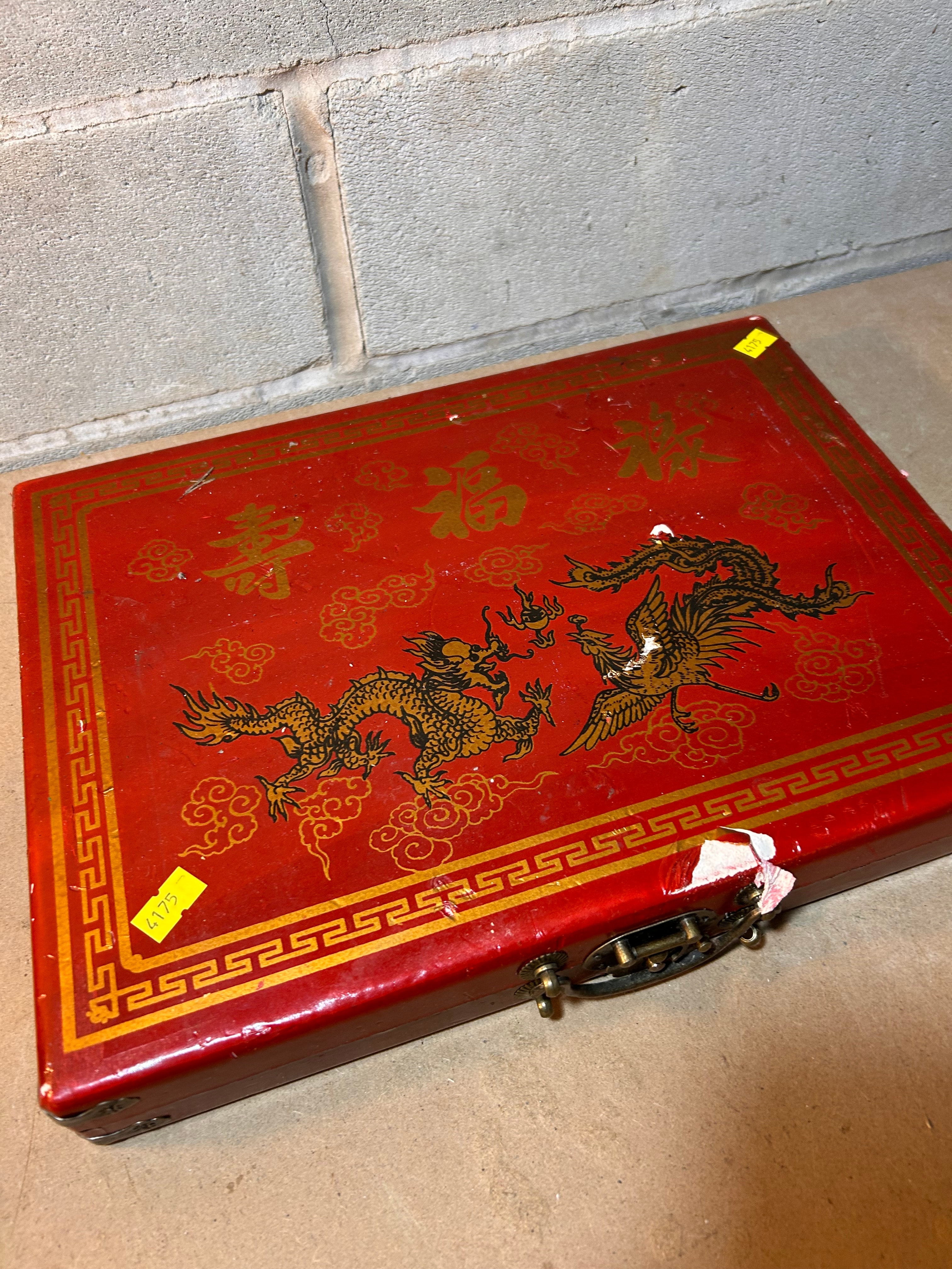 Lot 574: A Vintage Chinese Mahjong Set in Red Painted Dragon and Phoenix Decorated Case