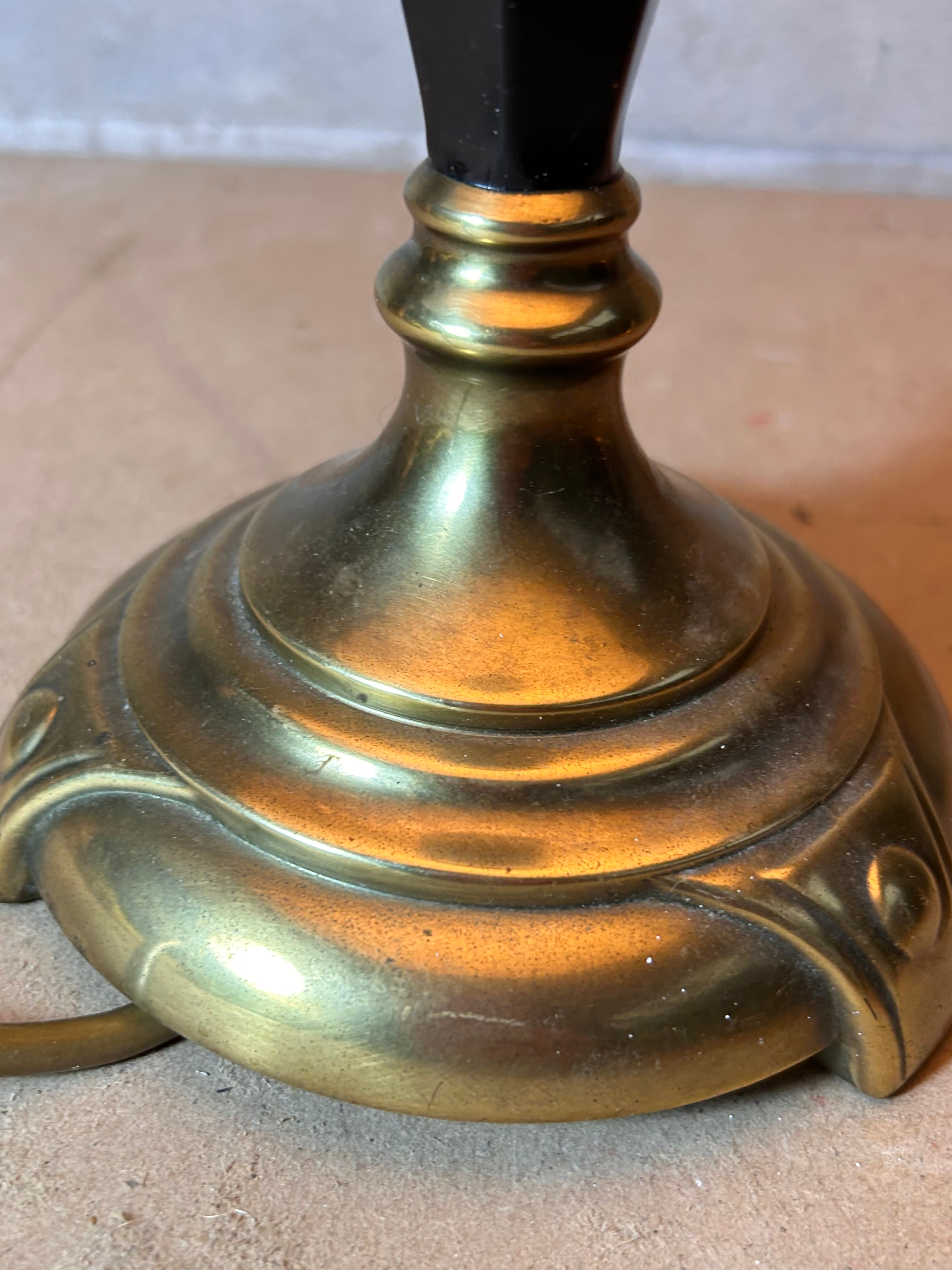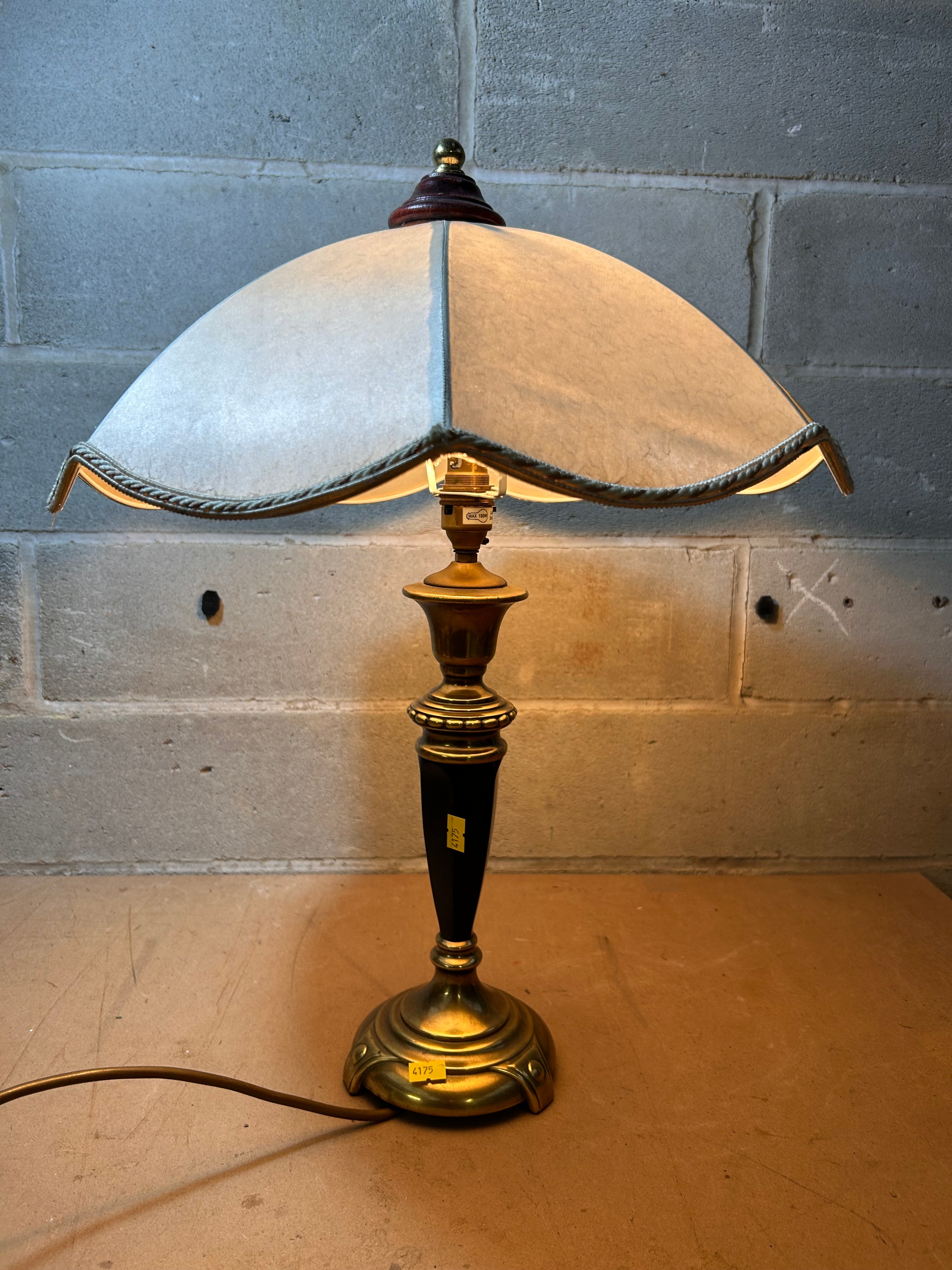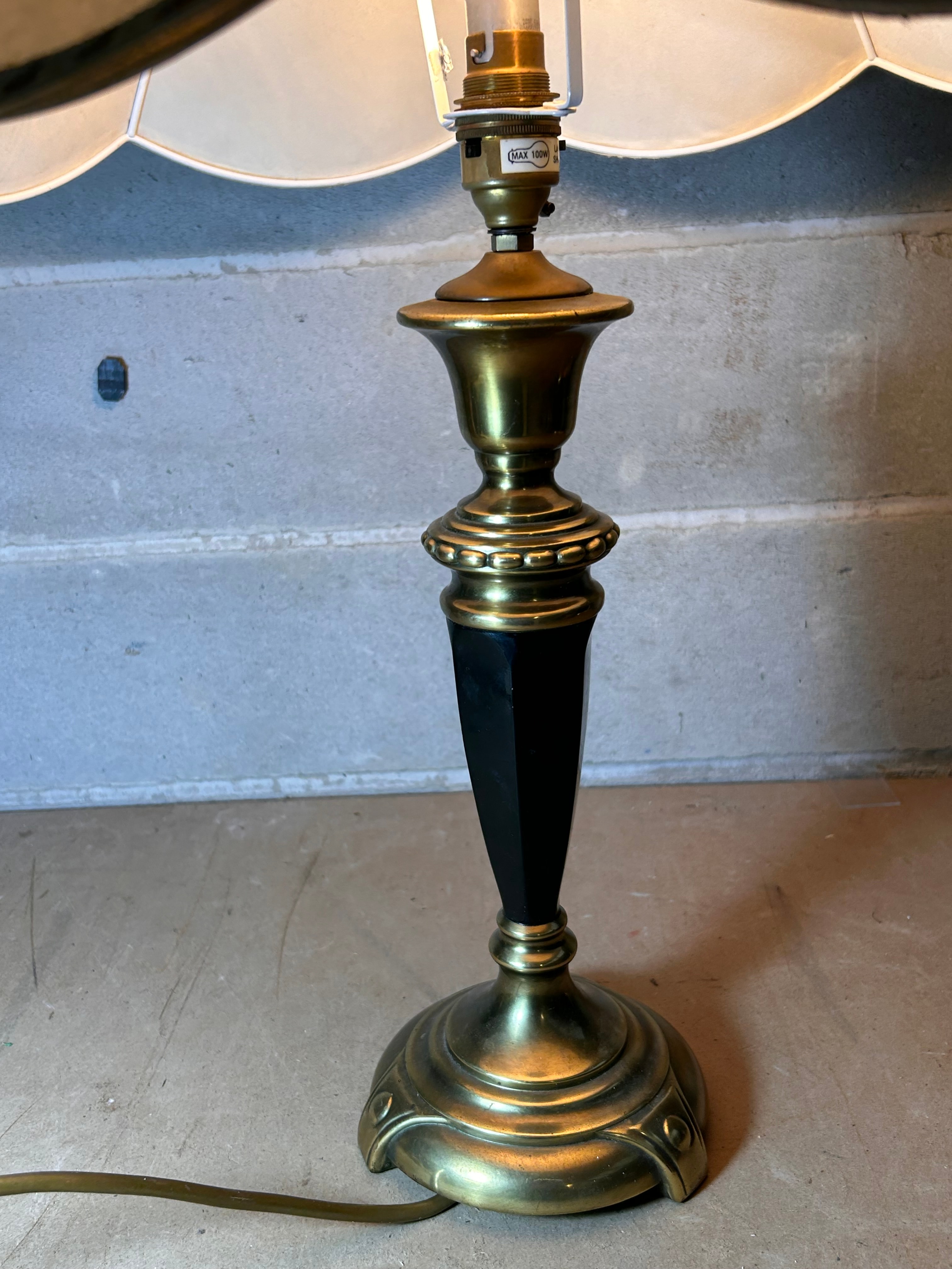 An Empire Style Gilt Brass Lamp, dating to the Early 20th Century. This vintage-style table lamp features a base and upper elements of brass-toned metal, with a black, faceted central column, possibly ebonized wood or Bakelite. The base is fluted and stepped, supporting a stem adorned with decorative brass rings. The lamp is topped with an off-white, scalloped fabric lampshade with braided trim, secured by a small wooden finial. The visible bulb socket is marked “MAX 100W”.