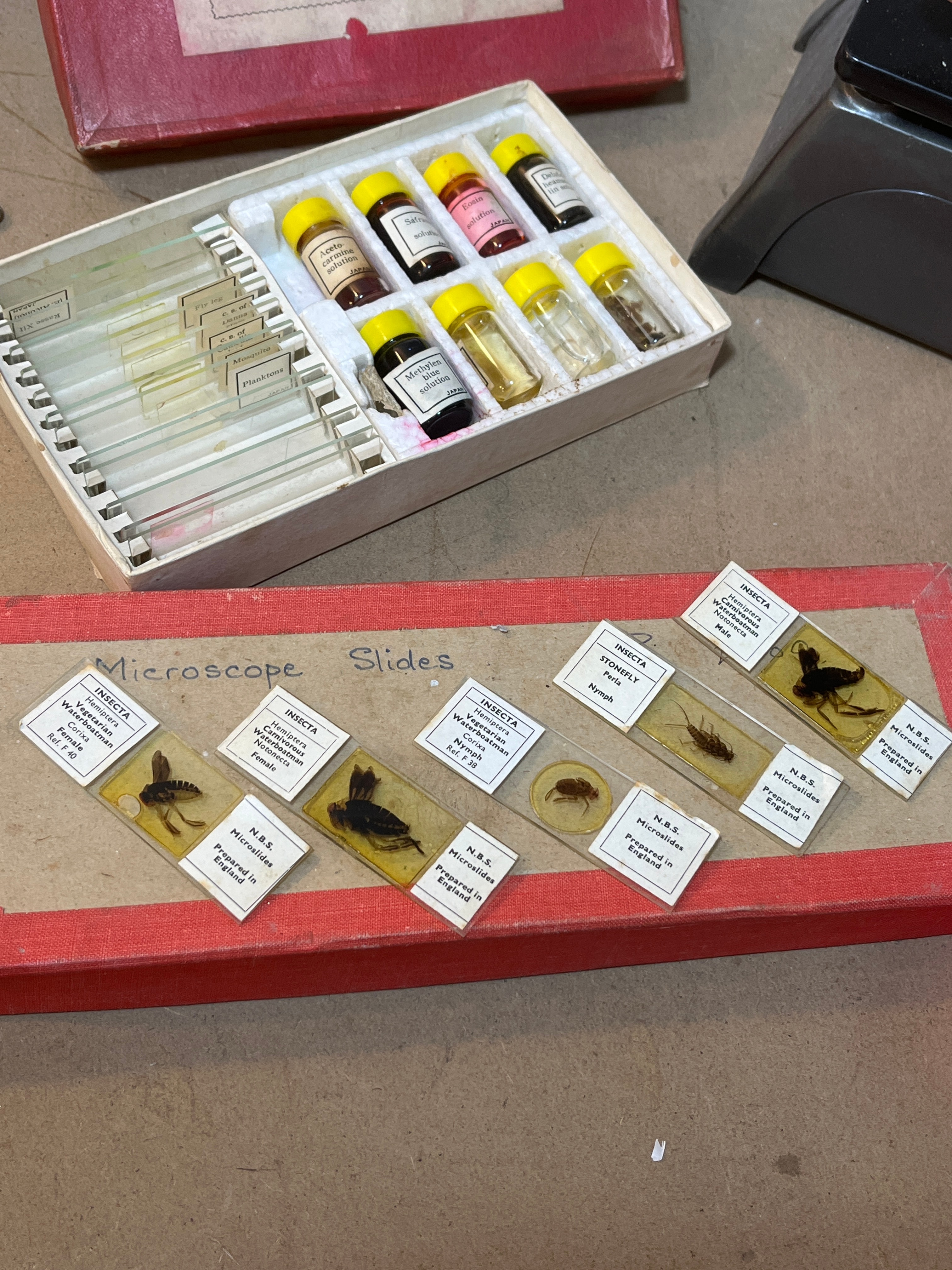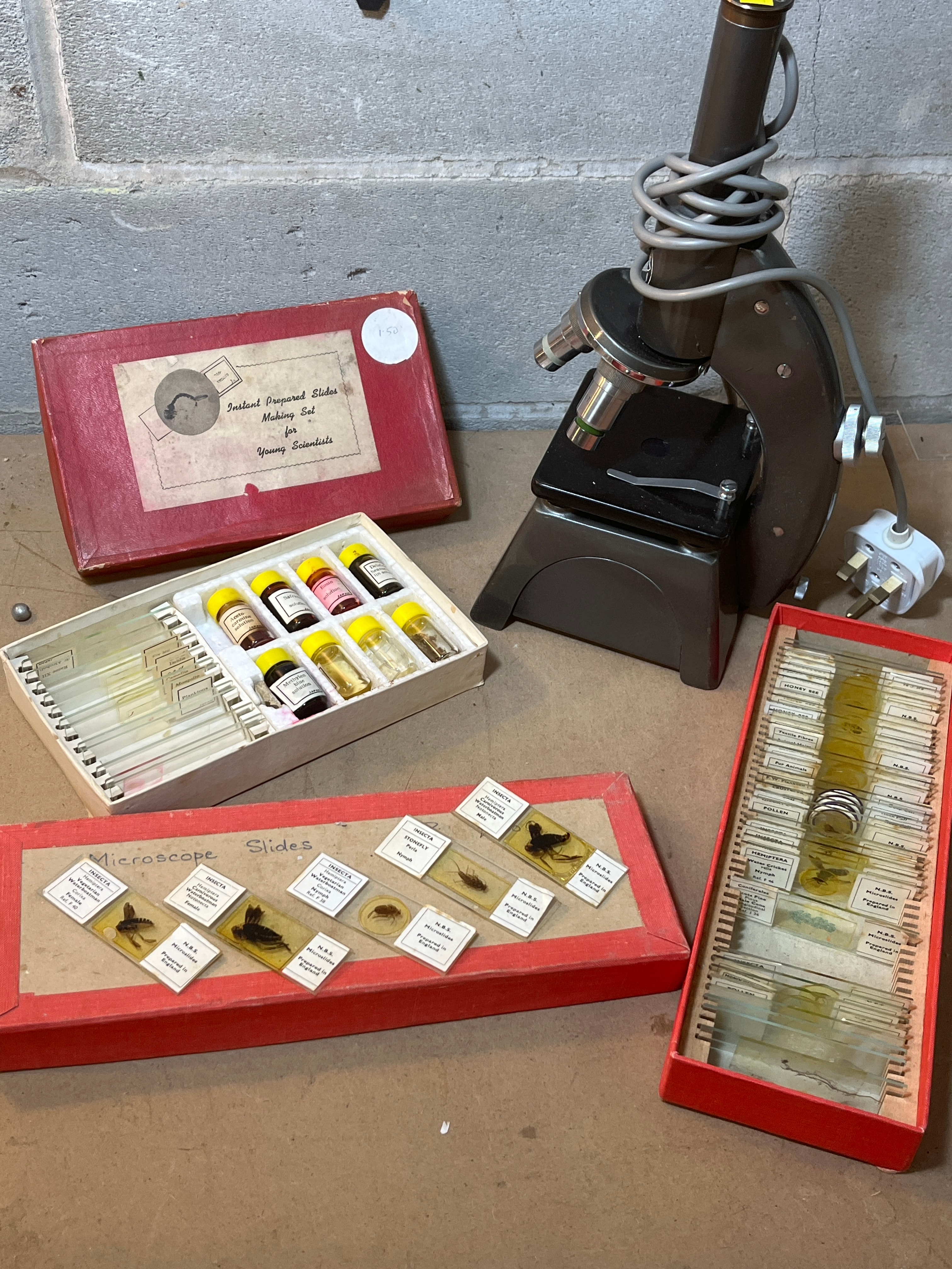 A Vintage Gilbert Microscope Set, comprising an upright compound microscope with a dark brown/grey metallic body and a UK-style electrical plug. The lot includes a red cardboard box labeled “Instant Prepared Slides Making Set for Young Scientists” (bearing a “£50” sticker), containing blank slides and vials filled with microscopy reagents such as Methylene Blue, Eosin, Canada Balsam, Glycerine Jelly, and Gum Chloral. Additionally, there are two red-trimmed cardboard boxes/trays housing numerous prepared microscope slides. Many of these slides are clearly labeled “INSECTA,” “Prepared in England,” “N.B.S.,” and identify various specimens including Wasp, Fly, Spider, Pollen, Hydracarina Water Mite, Chironomid Worm, Honey Bee, Fossil Spores, Hemiptera Water Mite Nymph, Conifer Leaf, and Mitrocides.