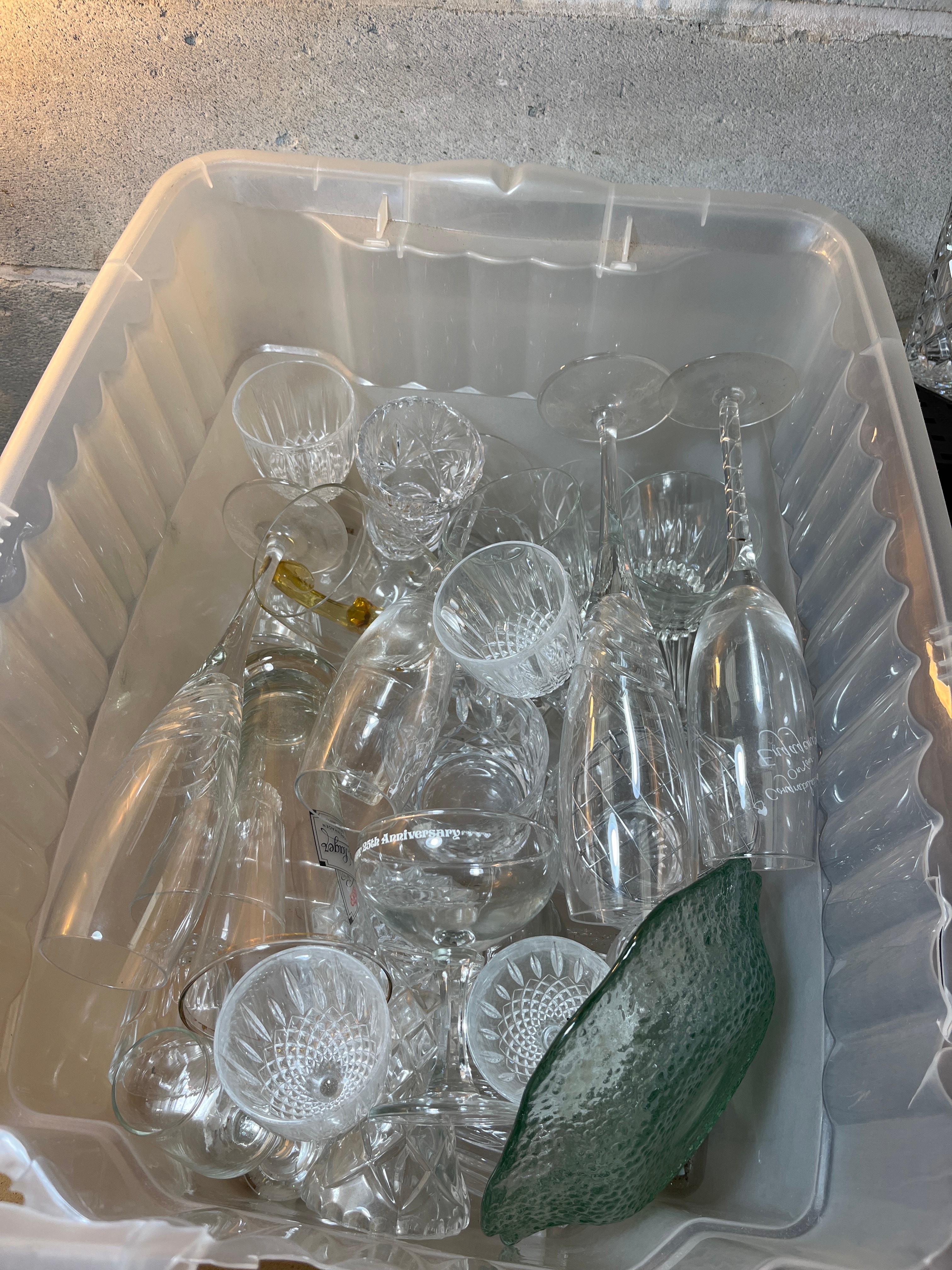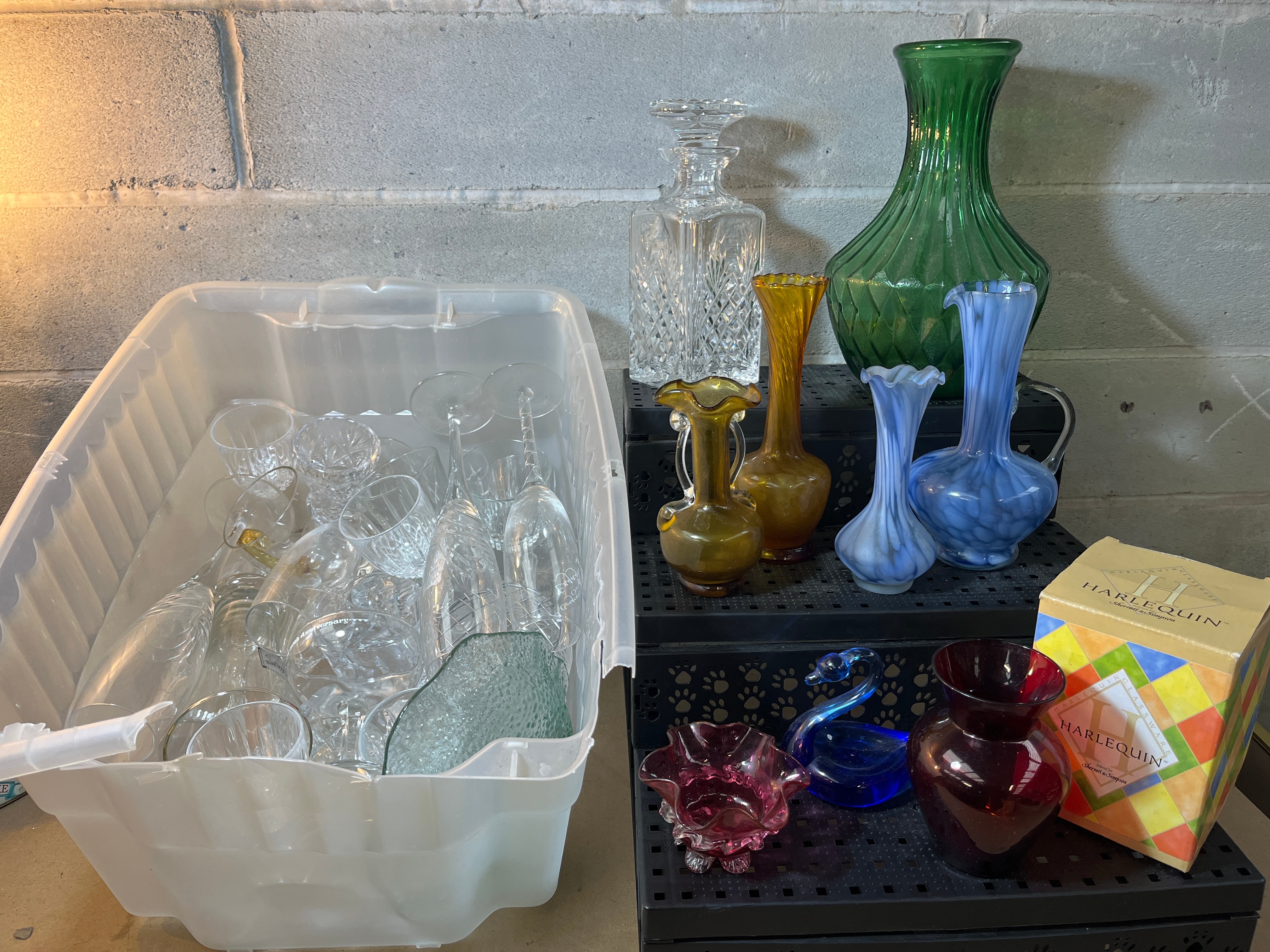 A diverse collection of estate glassware, presented both on display and within a storage bin. The displayed items include a clear cut-glass decanter with stopper, a tall green ribbed glass vase, a group of four art glass vases/pitchers with ruffled rims in amber-toned and swirl-patterned blue and white hues, a small pink ruffled-rim glass bowl, a blue glass bird figurine, a dark red glass vase, and a tan boxed item labeled “HARLEQUIN Scented Oil Lamps / Lampes à huile parfumées”. The plastic storage bin contains a bulk quantity of clear glass stemware and tumblers, many exhibiting cut or pressed designs, along with one piece of green textured glass. A partial “Nachtmann” label is visible on one clear glass item within the bin. The pieces display a range of decorative styles, appearing to span from vintage to contemporary.