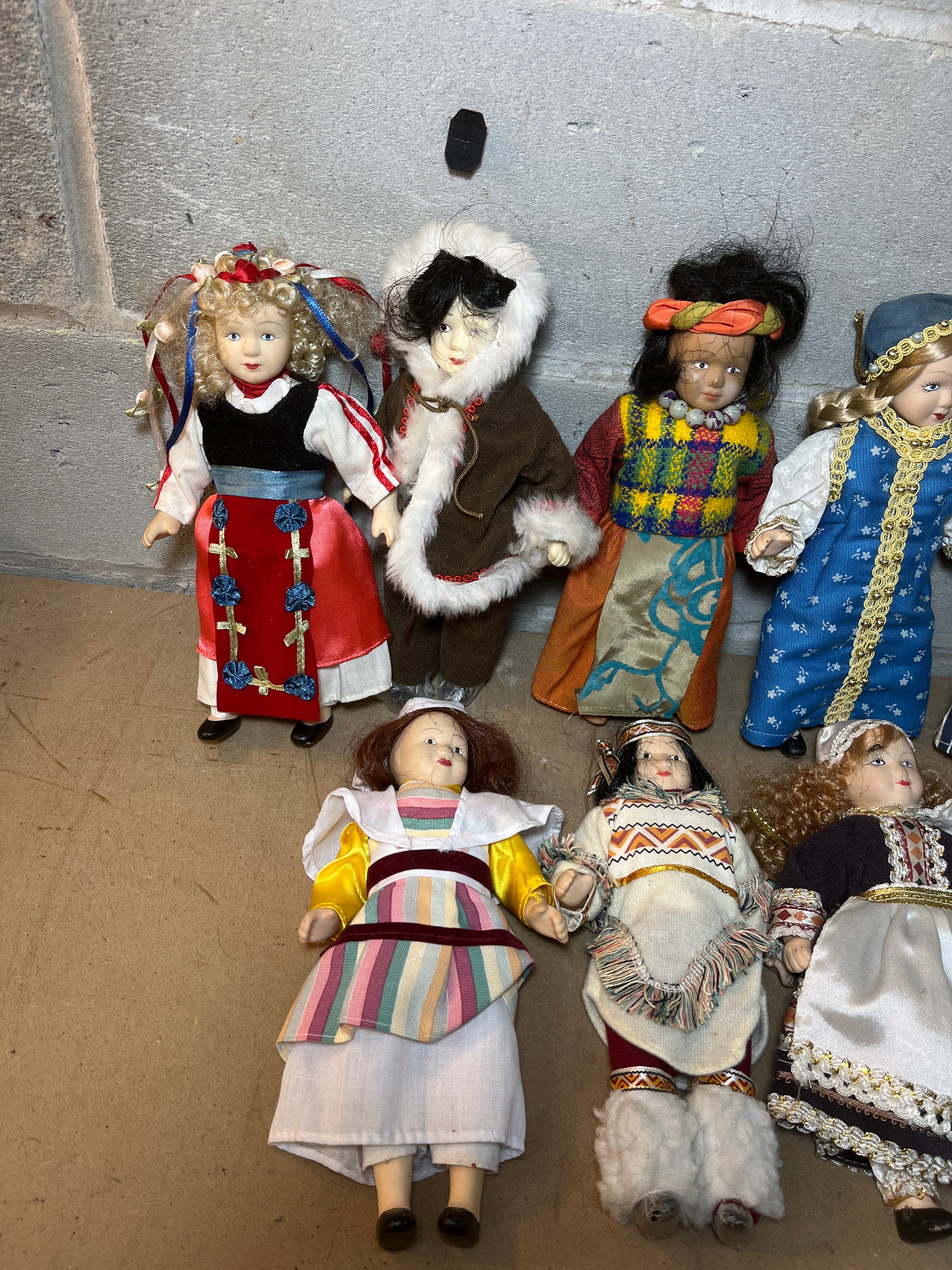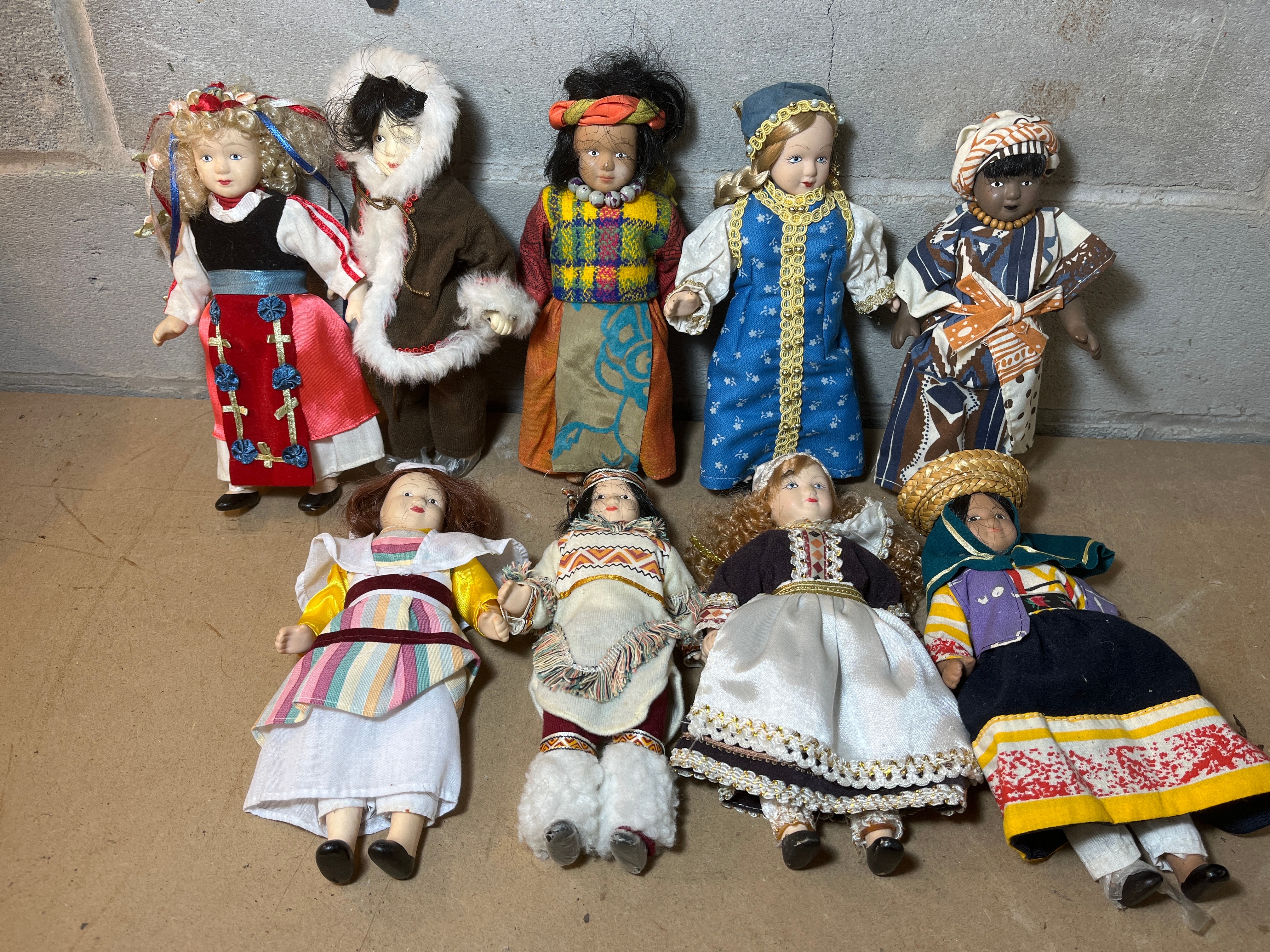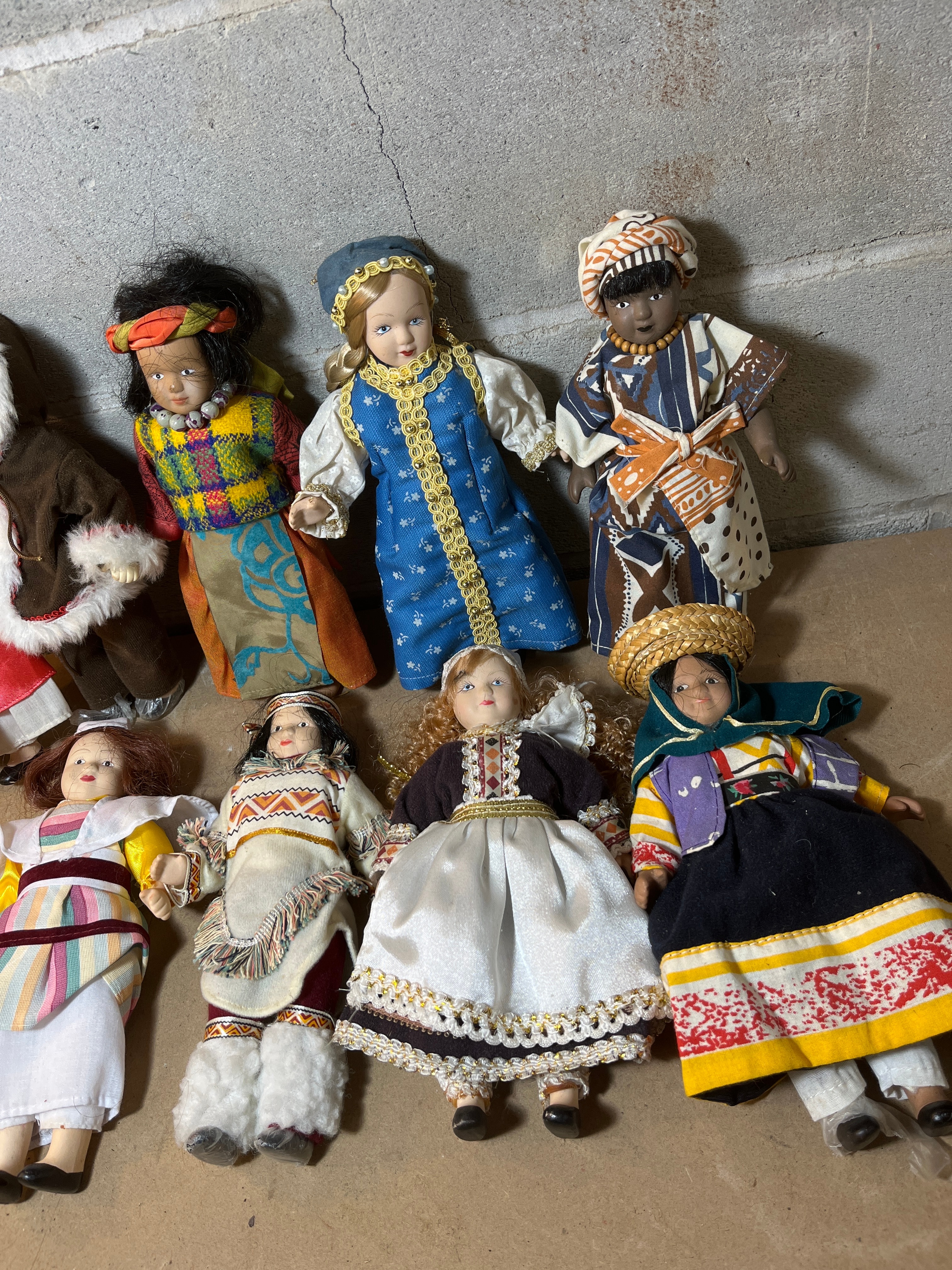 A collection of nine ‘Dolls of the World’ porcelain figures, each depicting a figure in traditional or folk costume from various international cultures. The dolls feature porcelain or bisque heads, hands, and feet, with soft cloth bodies, and are elaborately dressed in textile costumes incorporating diverse materials such as fur trim, woven fabrics, lace, and embroidery. Their style suggests a mid-to-late 20th-century or contemporary origin. No manufacturer markings or text are visible externally.
