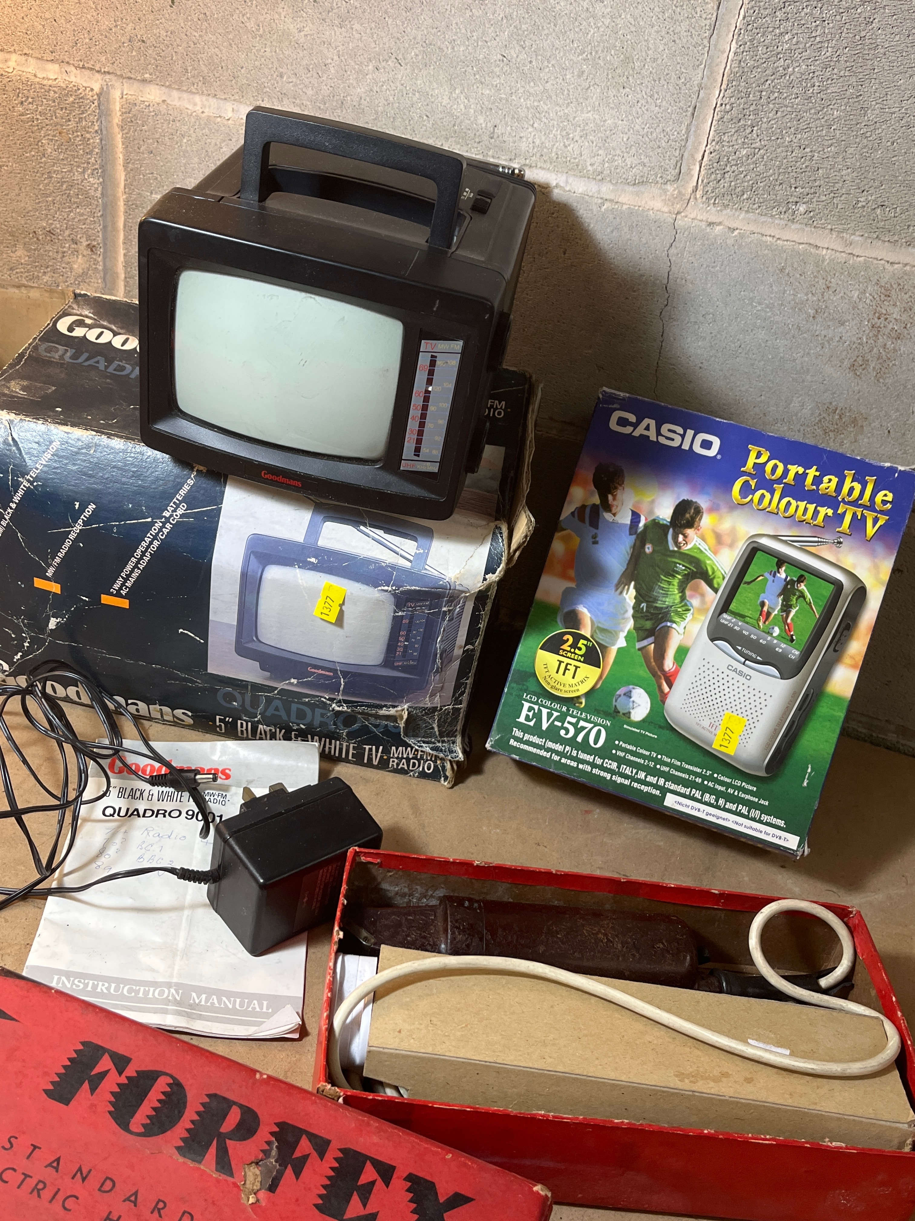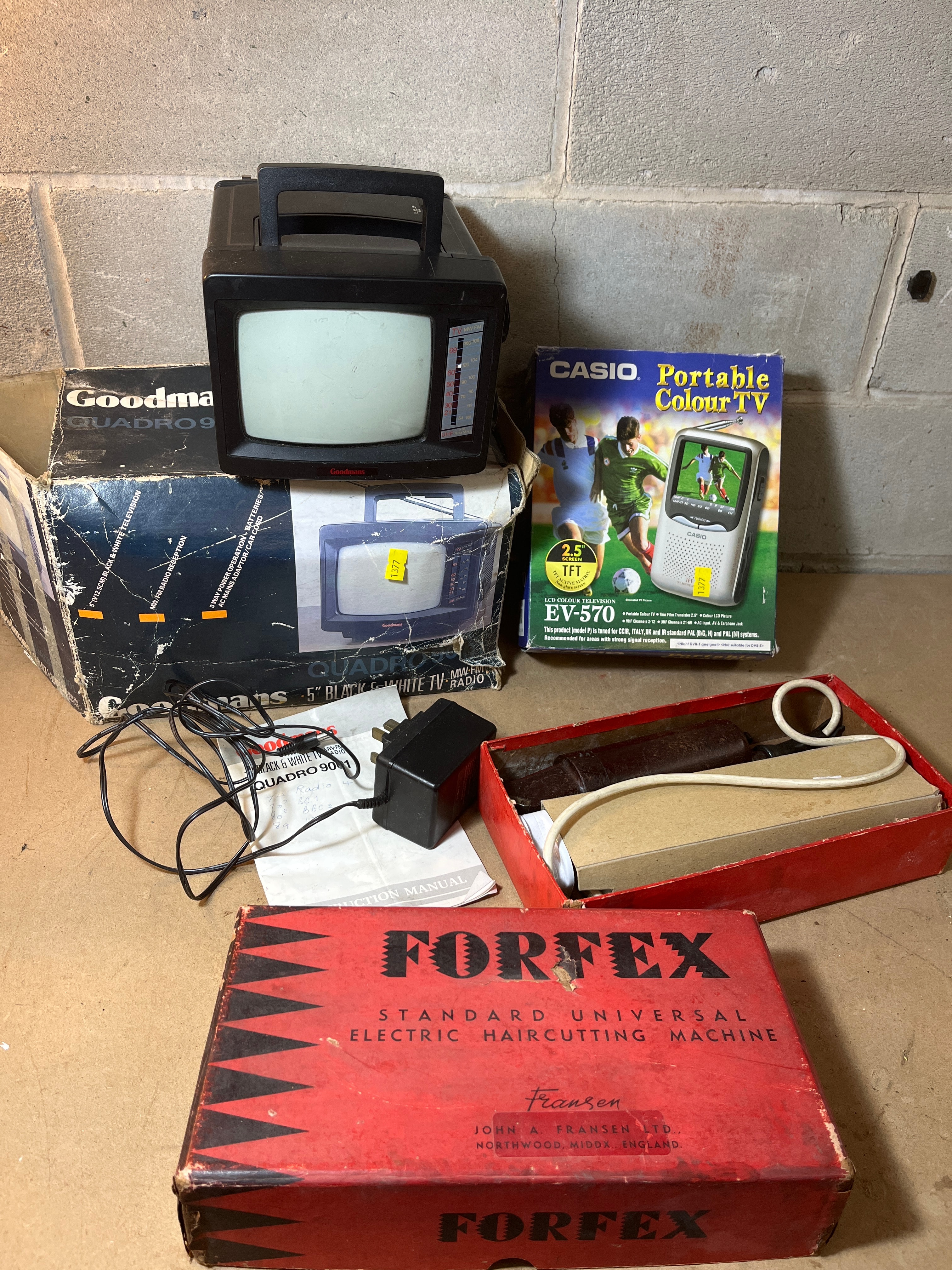 A Goodmans Quadro 901 portable 5-inch black and white television with an integrated top handle, presented with its original, partially damaged Goodmans box specifying ‘MW/FM RADIO QUADRO 901’. Also included is a Casio Portable Colour TV, model EV-570, featuring a 2.5″ TFT screen, within its original packaging. Completing the lot is an open red and black cardboard box prominently labeled ‘FORFEX STANDARD UNIVERSAL ELECTRIC HAIRCUTTING MACHINE’ and ‘JOHN A. FRANSEN LTD. NORTHWOOD, MIDDX. ENGLAND’, revealing the appliance and an instruction manual. Several associated power adapters and cables are also visible amongst the items.